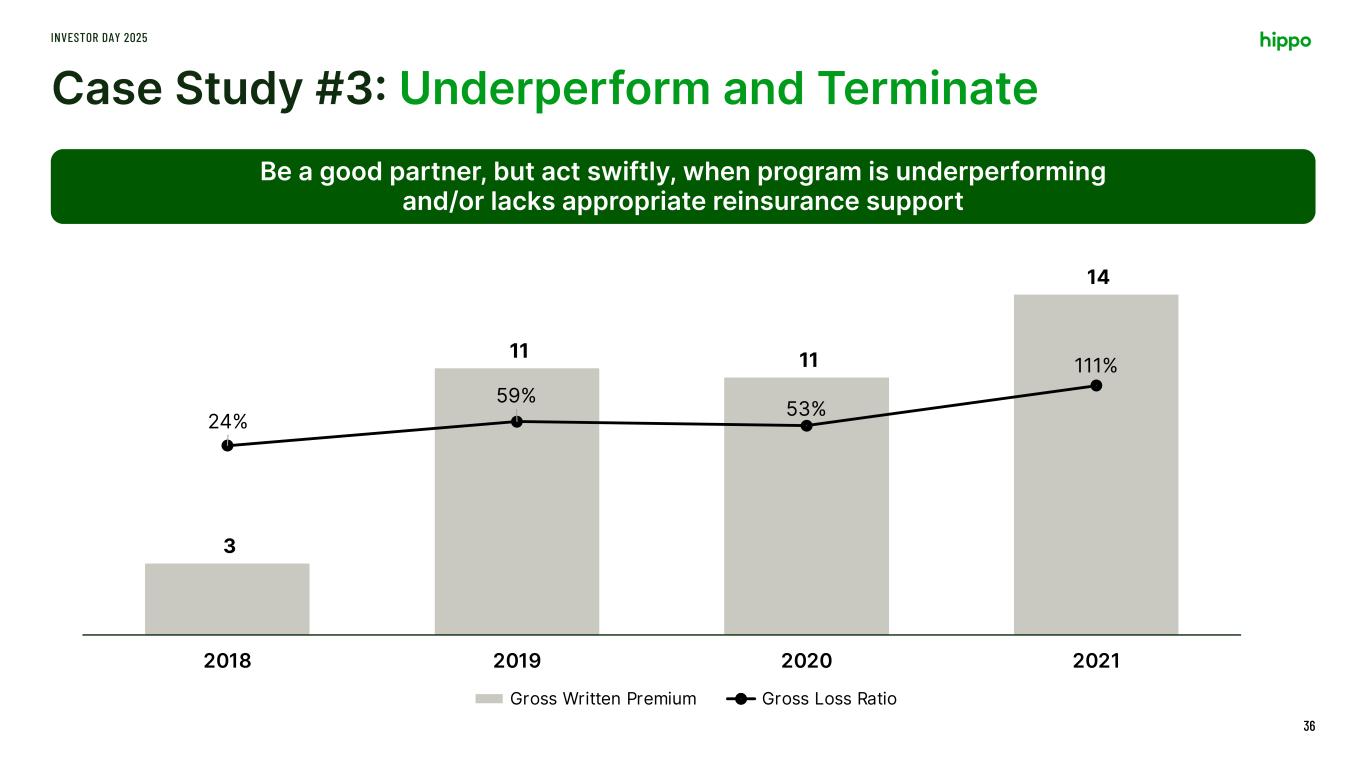 Case Study #2: Success and Scale INVESTOR DAY 2025 35 Increase capacity as performance continues to improve and provides for above normal returns 1 10 41 85 128% 87% 77% 65% -4% 16% 36% 56% 76% 96% 116% 0 10 20 30 40 50 60 70 80 90 2021 2022 2023 2024 Gross Written Premium Gross Loss Ratio