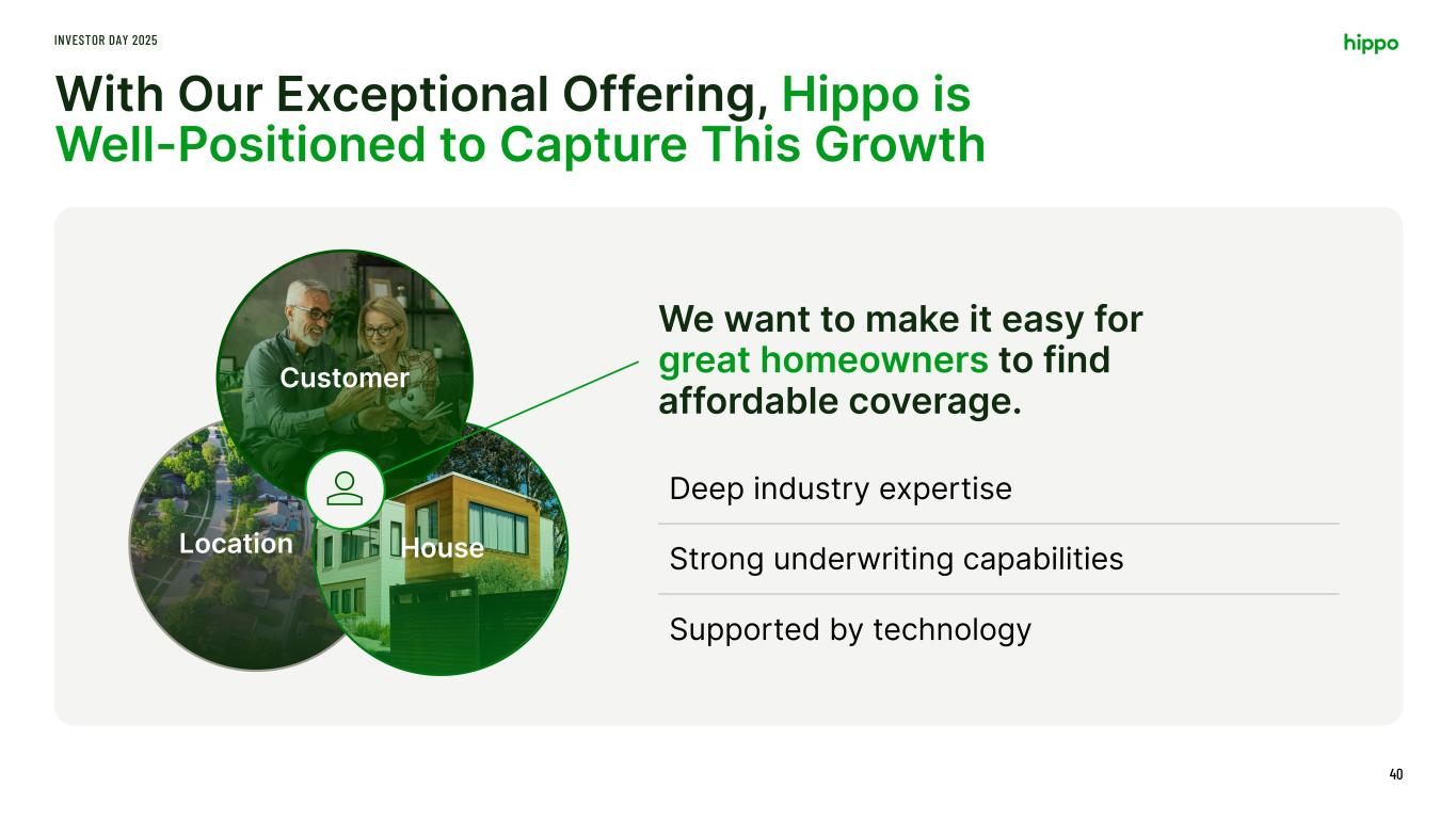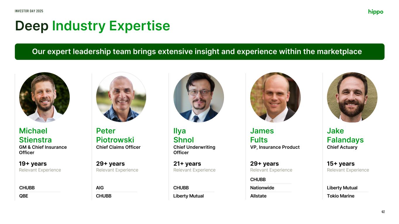 With Our Exceptional Offering, Hippo is Well-Positioned to Capture This Growth INVESTOR DAY 2025 40 Deep industry expertise Strong underwriting capabilities Supported by technology We want to make it easy for great homeowners to find affordable coverage. Location House Customer