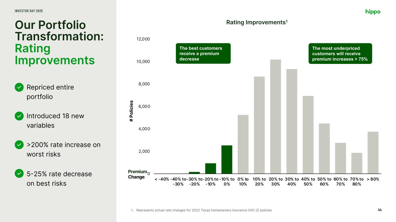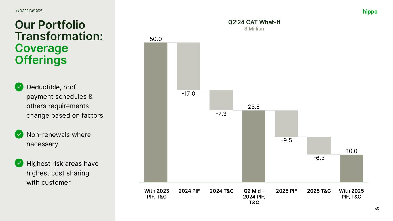 Our Portfolio Transformation: Rating Improvements INVESTOR DAY 2025 44 Repriced entire portfolio Introduced 18 new variables >200% rate increase on worst risks 5-25% rate decrease on best risks 0 2,000 4,000 6,000 8,000 10,000 12,000 < -40% -40% to -30% -30% to -20% -20% to -10% -10% to 0% 0% to 10% 10% to 20% 20% to 30% 30% to 40% 40% to 50% 50% to 60% 60% to 70% 70% to 80% > 80% # Po lic ie s Premium Change The best customers receive a premium decrease The most underpriced customers will receive premium increases > 75% 1. Represents actual rate changes for 2022 Texas homeowners insurance (HO-3) policies Rating Improvements1