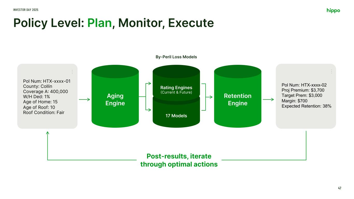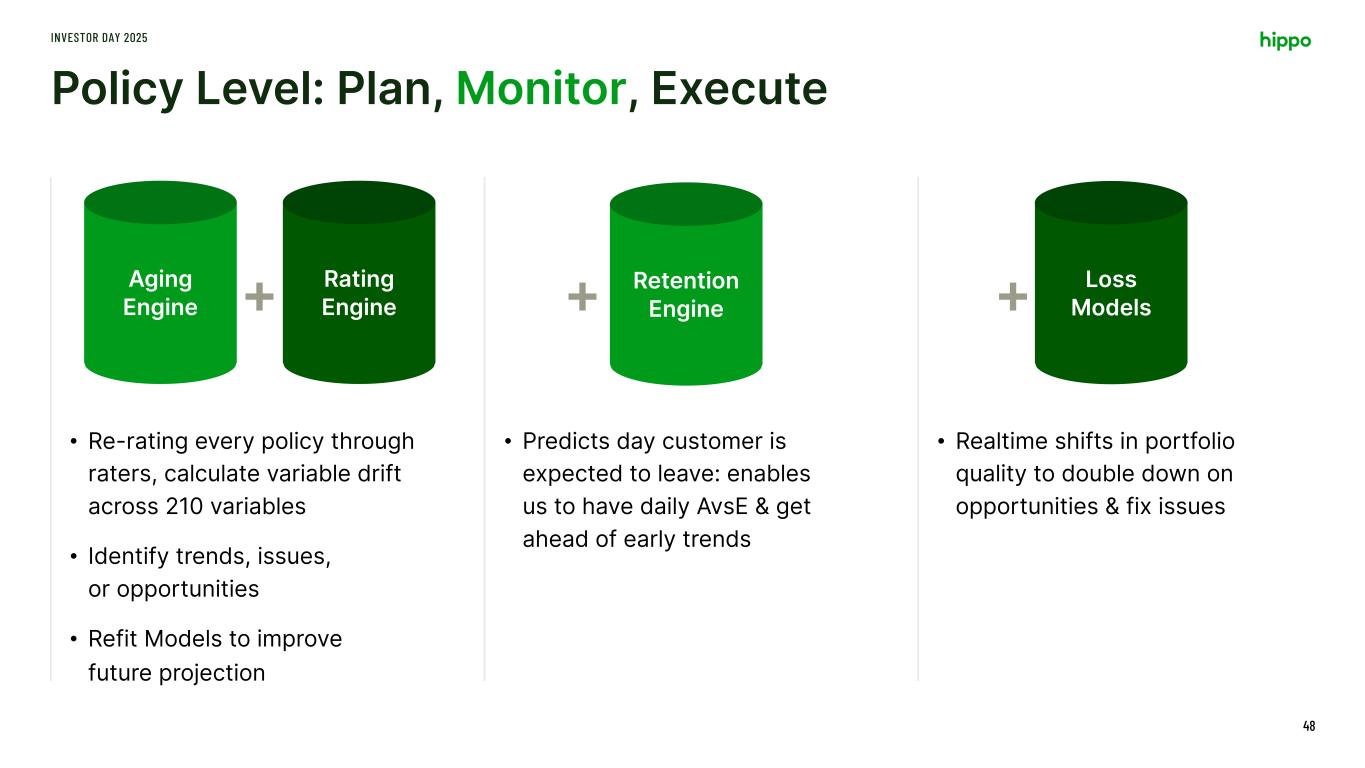Rating Engines (Current & Future) 17 Models Policy Level: Plan, Monitor, Execute INVESTOR DAY 2025 47 Pol Num: HTX-xxxx-02 Proj Premium: $3,700 Target Prem: $3,000 Margin: $700 Expected Retention: 38% … Pol Num: HTX-xxxx-01 County: Collin Coverage A: 400,000 W/H Ded: 1% Age of Home: 15 Age of Roof: 10 Roof Condition: Fair … Post-results, iterate through optimal actions Aging Engine By-Peril Loss Models Retention Engine