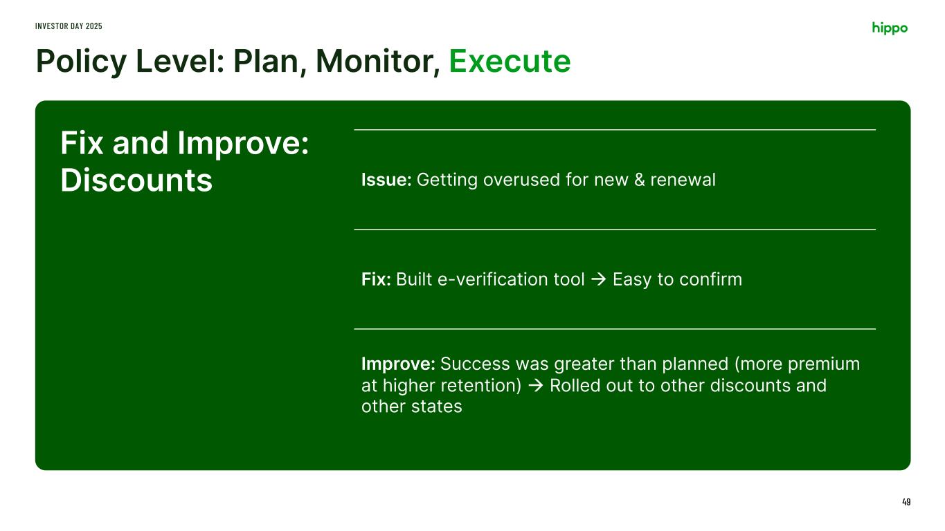 Policy Level: Plan, Monitor, Execute INVESTOR DAY 2025 49 Issue: Getting overused for new & renewal Fix: Built e-verification tool à Easy to confirm Improve: Success was greater than planned (more premium at higher retention) à Rolled out to other discounts and other states Fix and Improve: Discounts