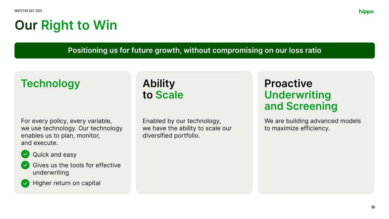Our Right to Win INVESTOR DAY 2025 50 Technology For every policy, every variable, we use technology. Our technology enables us to plan, monitor, and execute. Quick and easy Gives us the tools for effective underwriting Higher return on capital Ability to Scale Enabled by our technology, we have the ability to scale our diversified portfolio. Proactive Underwriting and Screening We are building advanced models to maximize efficiency. Positioning us for future growth, without compromising on our loss ratio
