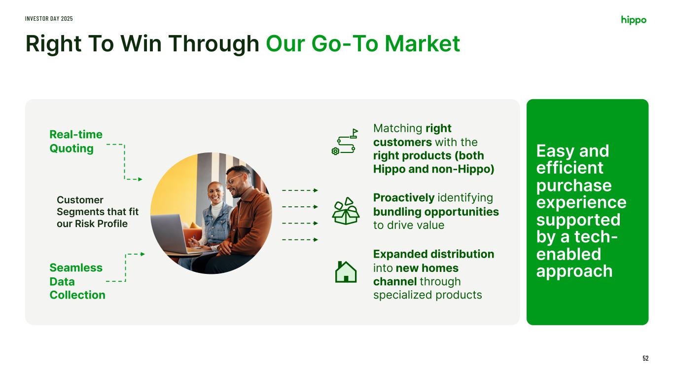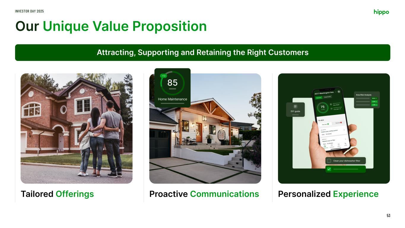 Right To Win Through Our Go-To Market INVESTOR DAY 2025 52 Real-time Quoting Seamless Data Collection Customer Segments that fit our Risk Profile Proactively identifying bundling opportunities to drive value Matching right customers with the right products (both Hippo and non-Hippo) Easy and efficient purchase experience supported by a tech- enabled approach Expanded distribution into new homes channel through specialized products