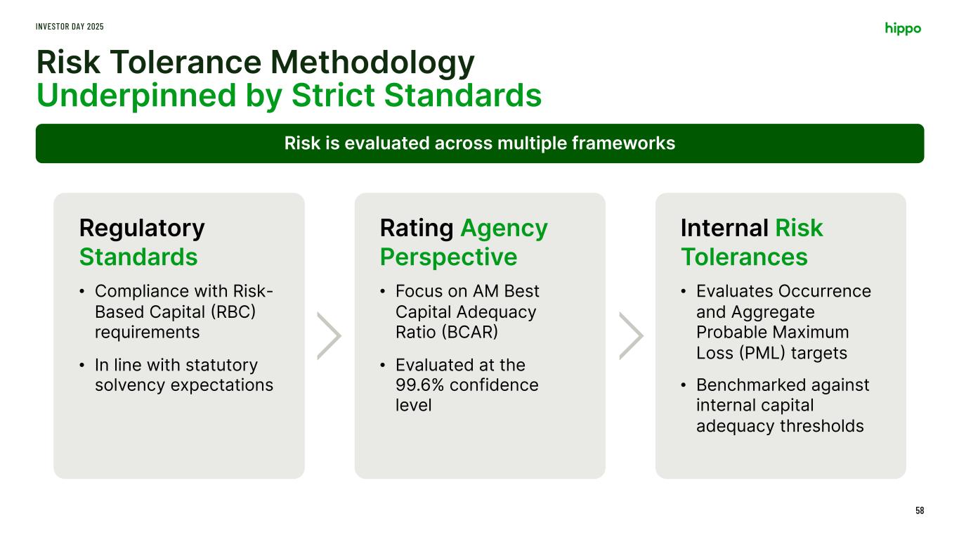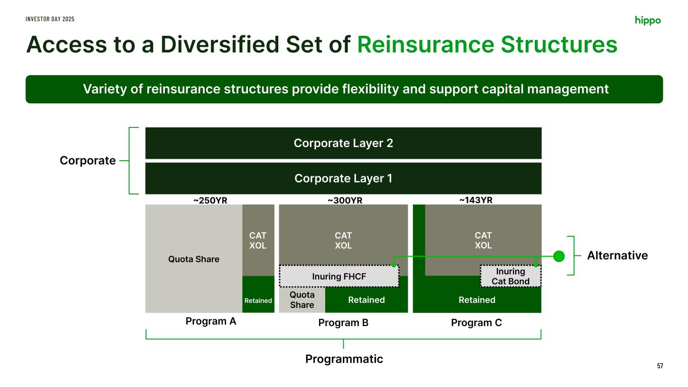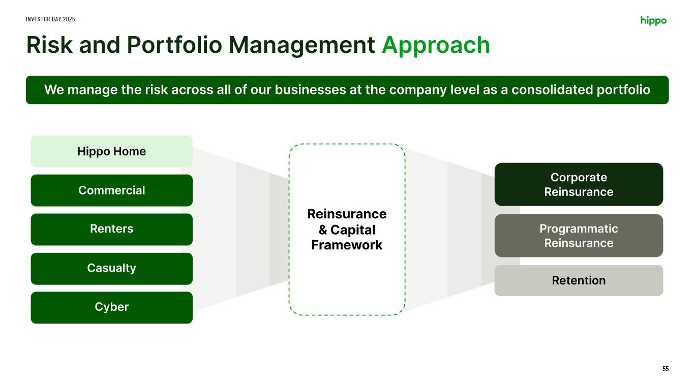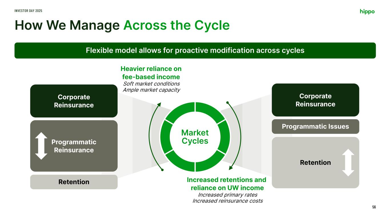 Risk and Portfolio Management Approach INVESTOR DAY 2025 55 We manage the risk across all of our businesses at the company level as a consolidated portfolio Reinsurance & Capital Framework Hippo Home Commercial Renters Casualty Cyber Programmatic Reinsurance Retention Corporate Reinsurance