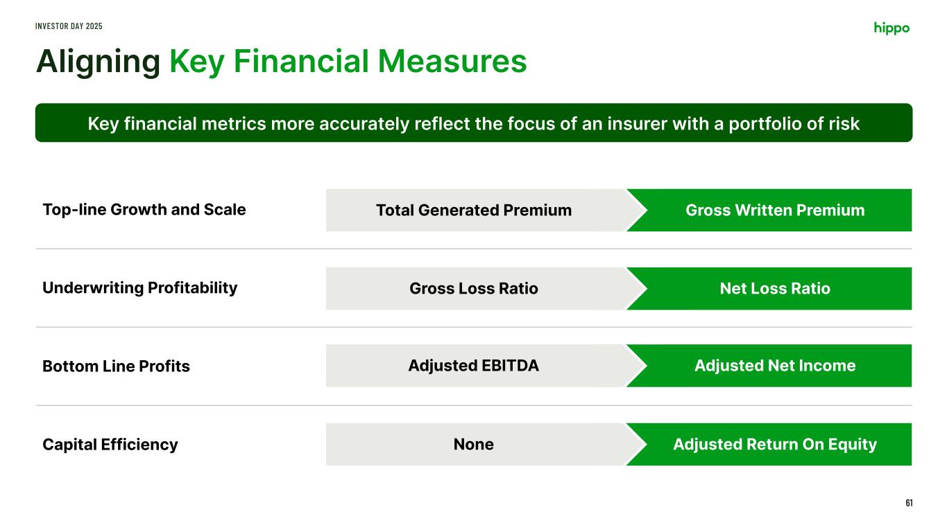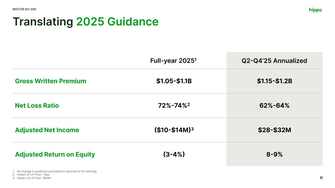Aligning Key Financial Measures INVESTOR DAY 2025 61 Key financial metrics more accurately reflect the focus of an insurer with a portfolio of risk Top-line Growth and Scale Underwriting Profitability Bottom Line Profits Capital Efficiency Total Generated Premium Gross Written Premium Gross Loss Ratio Net Loss Ratio Adjusted EBITDA Adjusted Net Income Adjusted Return On EquityNone