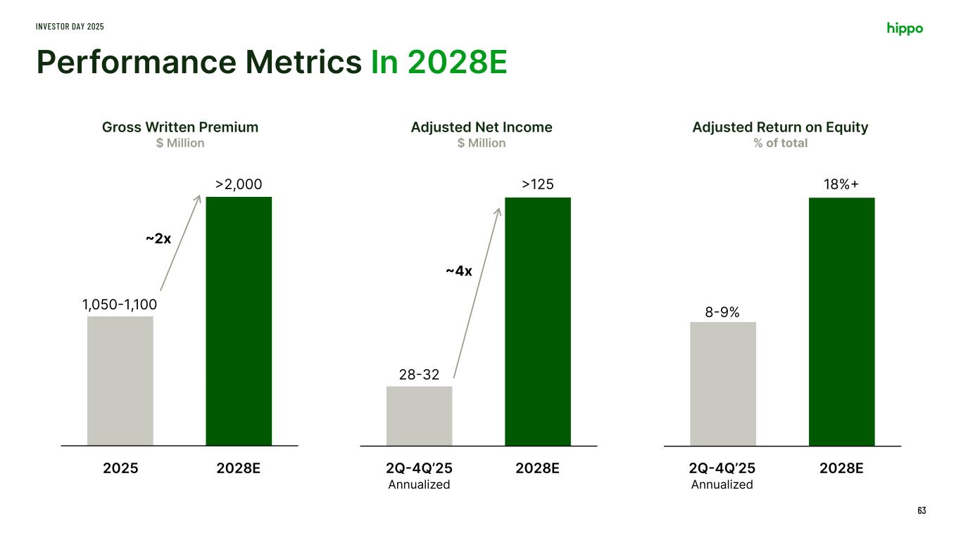 Translating 2025 Guidance INVESTOR DAY 2025 62 Gross Written Premium $1.05-$1.1B $1.15-$1.2B Net Loss Ratio 72%-74%2 62%-64% Adjusted Net Income ($10-$14M)3 $28-$32M Adjusted Return on Equity (3-4%) 8-9% Full-year 20251 Q2-Q4’25 Annualized 1. No change to guidance assumptions reported at Q1 earnings 2. Impact of LA Fires- 13pp 3. Impact of LA Fires- $45M