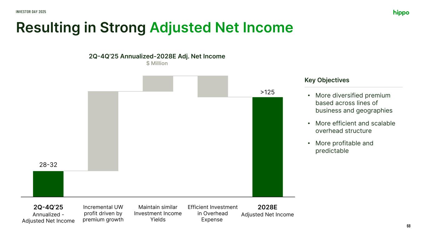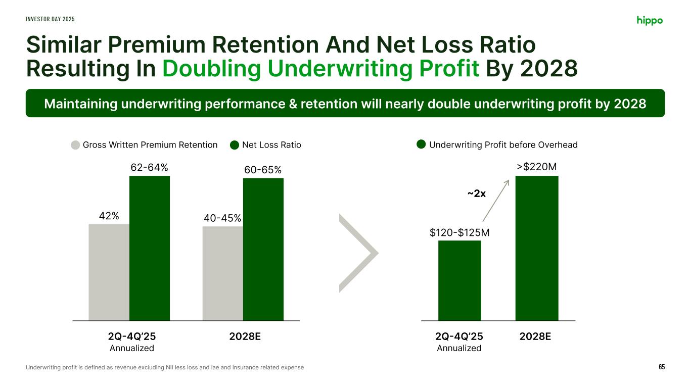 Doubling Top-line Premium by 2028 INVESTOR DAY 2025 64 Three-year growth assumptions are in-line with how the business is currently operating 2025 2028E Gross Written Premium Organic Growth from Existing non- Hippo programs New non-Hippo programs Scale-up of New Homes channel within Hippo MGA Hippo MGA outside New Homes Gross Written Premium Organic growth at slightly lower pace than achieved historically Adding programs in similar pace to last few years, aiming to diversify the lines of business Growing organically with existing partners, bolstered by strategic partnerships Focusing Hippo MGA growth outside New Homes in diversified states where fewer new homes are built Key Drivers 1 2 3 4 1 2 3 4 Gross Written Premium $ Million 1,050-1,100 >2,00022% 25-28E CAGR