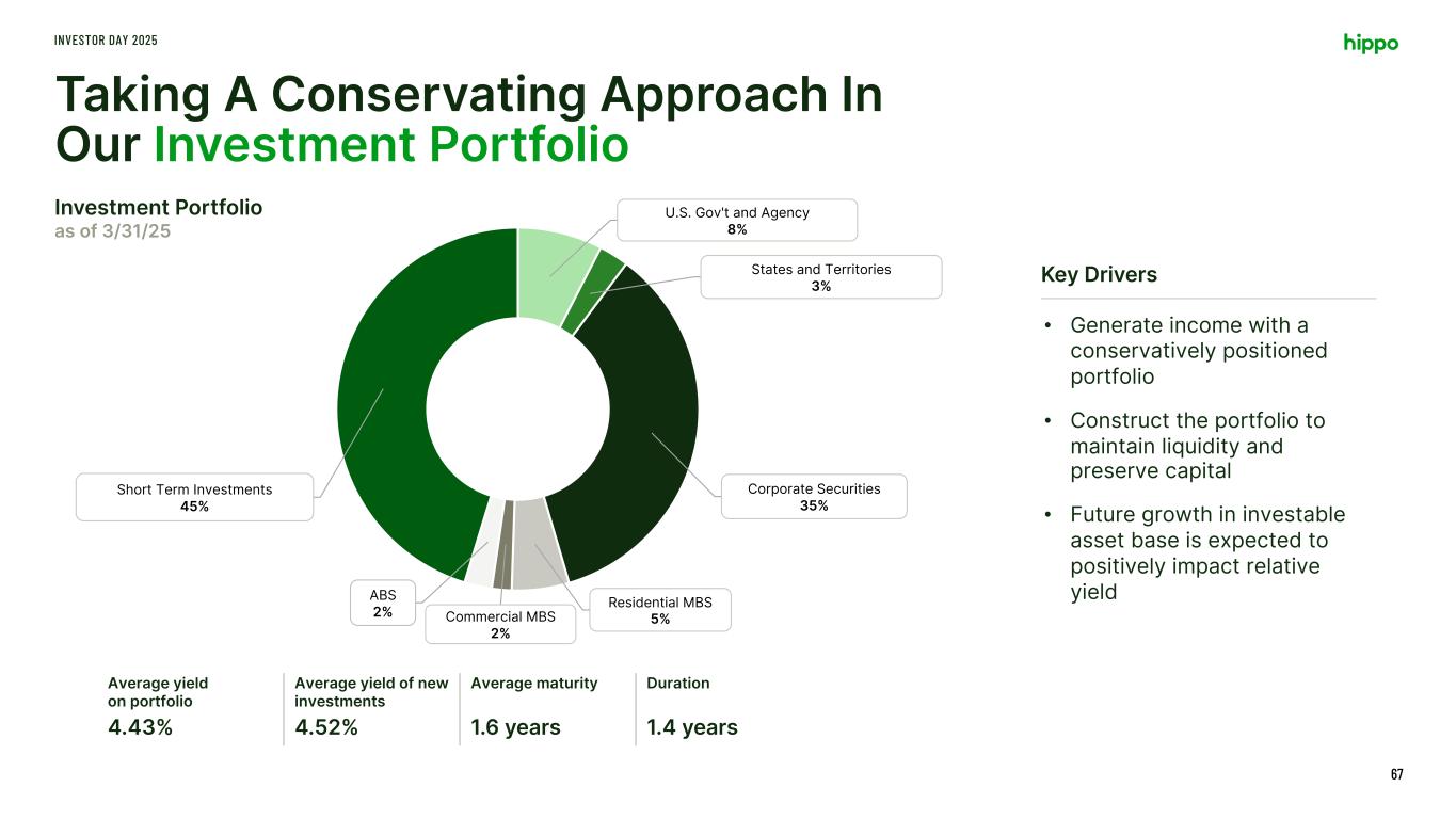 • Generate income with a conservatively positioned portfolio • Construct the portfolio to maintain liquidity and preserve capital • Future growth in investable asset base is expected to positively impact relative yield U.S. Gov't and Agency 8% States and Territories 3% Corporate Securities 35% Residential MBS 5%Commercial MBS 2% ABS 2% Short Term Investments 45% Taking A Conservating Approach In Our Investment Portfolio INVESTOR DAY 2025 67 Average yield on portfolio Average yield of new investments Average maturity Duration 4.43% 4.52% 1.6 years 1.4 years Investment Portfolio as of 3/31/25 Key Drivers