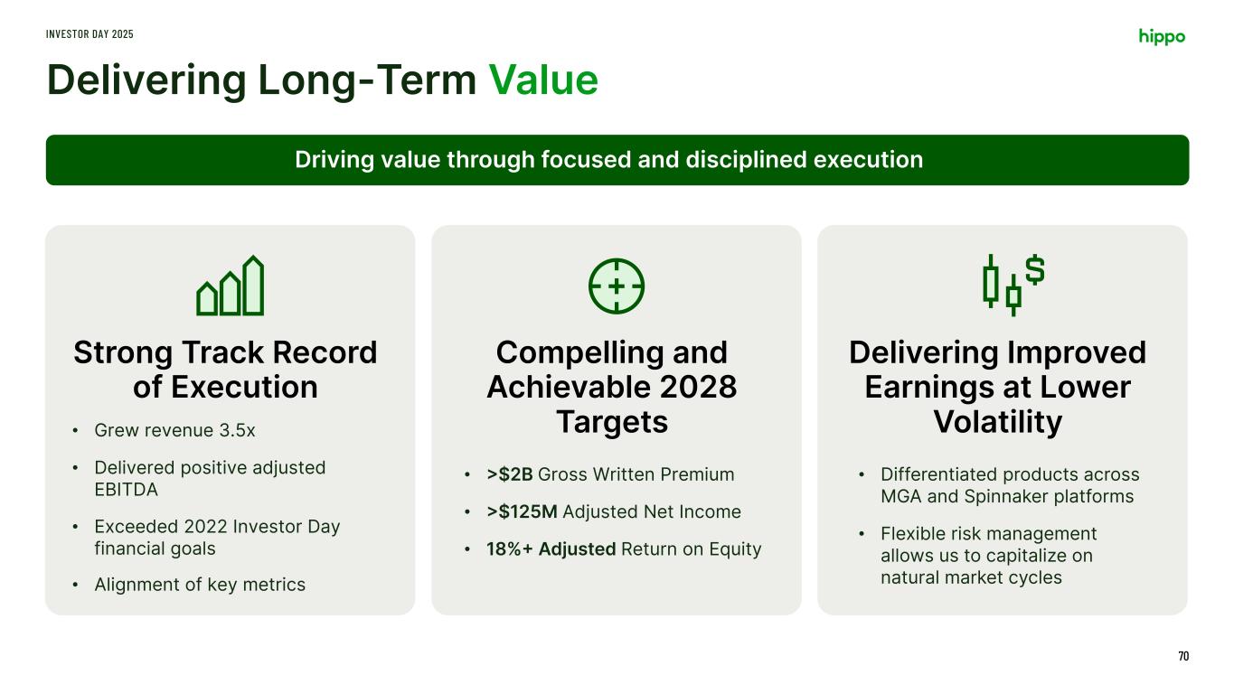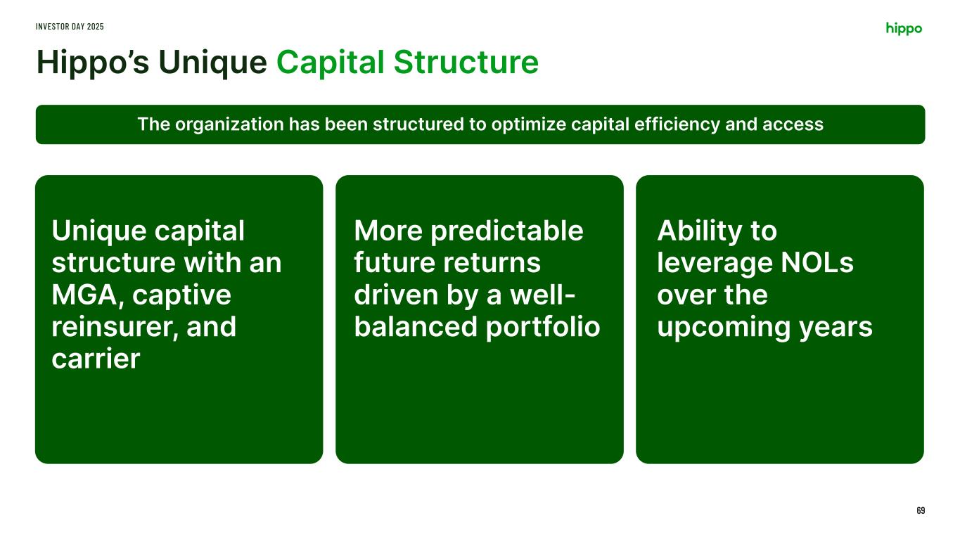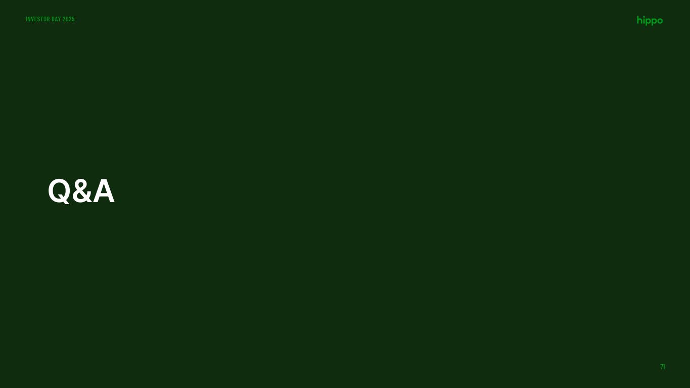 Hippo’s Unique Capital Structure INVESTOR DAY 2025 69 The organization has been structured to optimize capital efficiency and access Unique capital structure with an MGA, captive reinsurer, and carrier More predictable future returns driven by a well- balanced portfolio Ability to leverage NOLs over the upcoming years