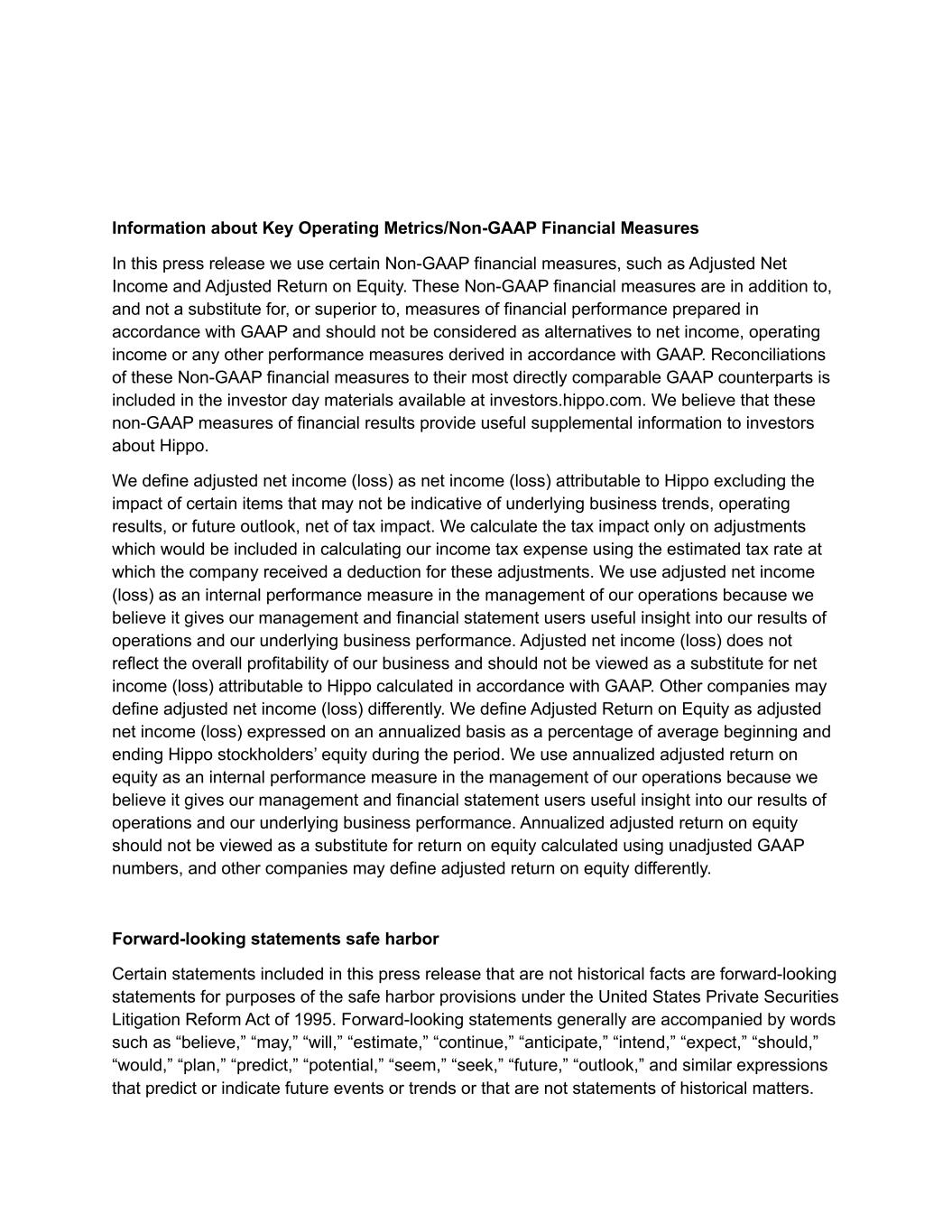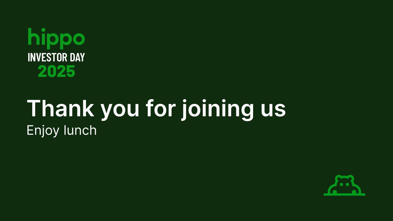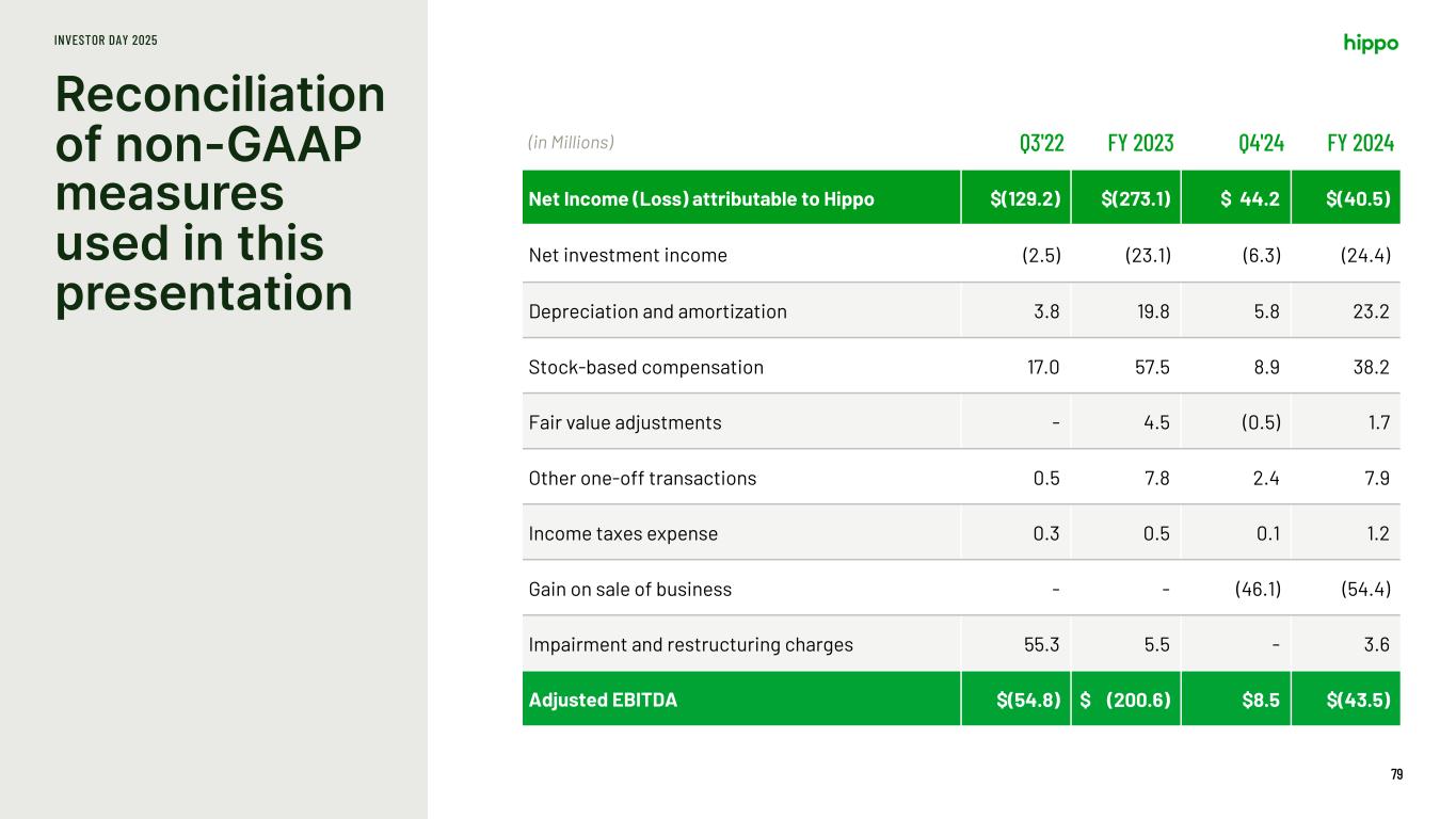 Definition of Non-GAAP measures included in this presentation INVESTOR DAY 2025 78 • Adjusted Return on Equity: We define Adjusted Return on Equity as adjusted net income (loss) expressed on an annualized basis as a percentage of average beginning and ending Hippo stockholders’ equity during the period. We use annualized adjusted return on equity as an internal performance measure in the management of our operations because we believe it gives our management and financial statement users useful insight into our results of operations and our underlying business performance. Annualized adjusted return on equity should not be viewed as a substitute for return on equity calculated using unadjusted GAAP numbers, and other companies may define adjusted return on equity differently.