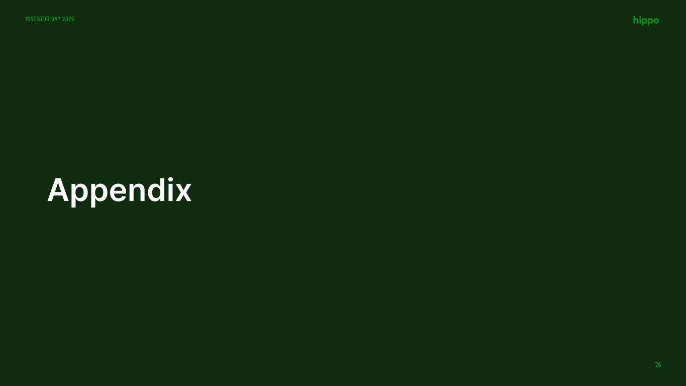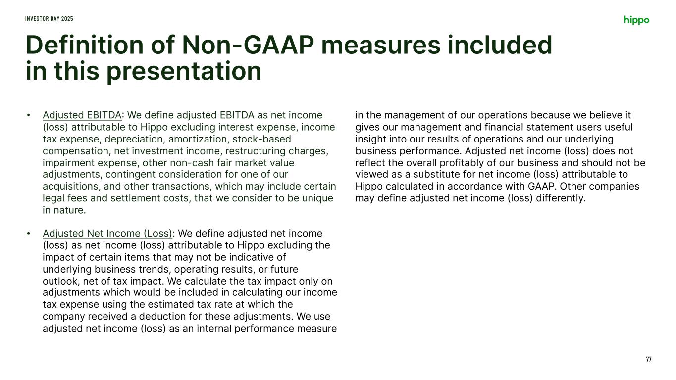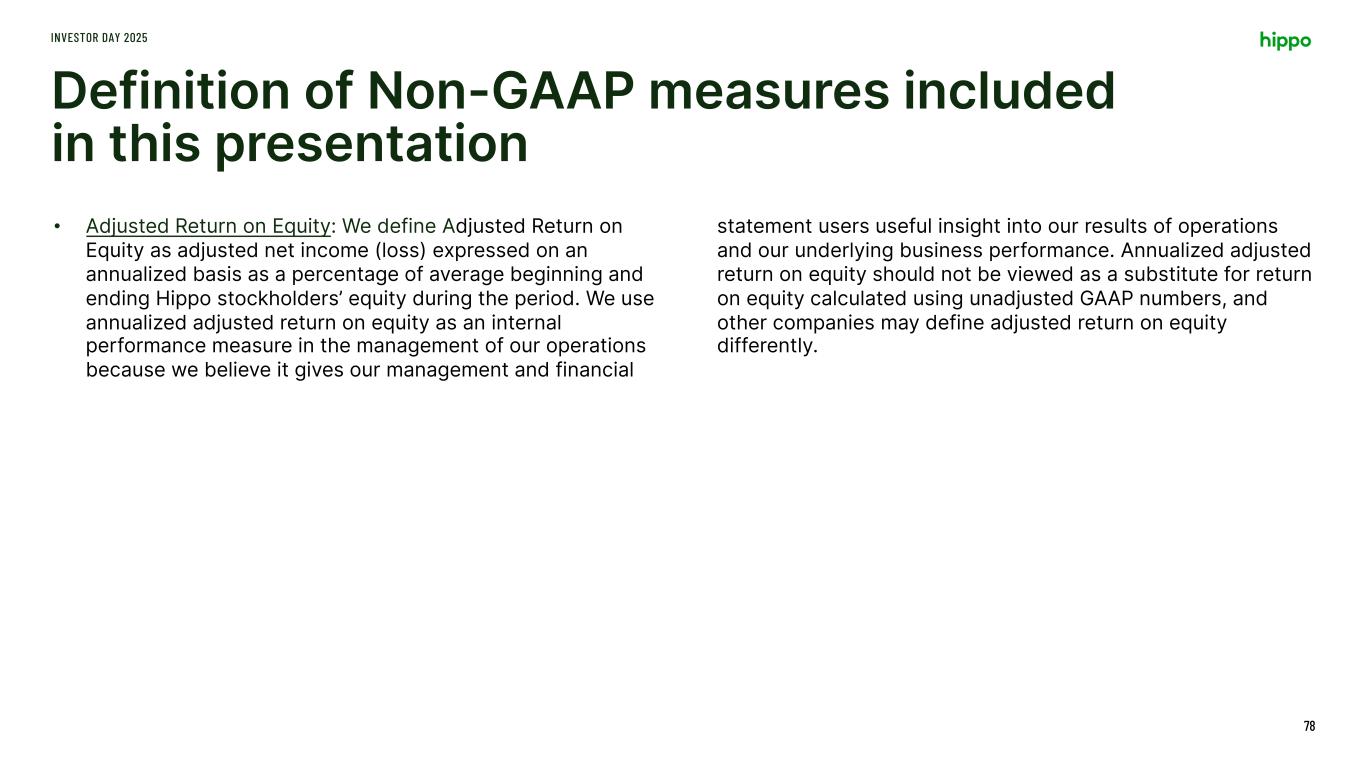 Definition of Non-GAAP measures included in this presentation INVESTOR DAY 2025 77 • Adjusted EBITDA: We define adjusted EBITDA as net income (loss) attributable to Hippo excluding interest expense, income tax expense, depreciation, amortization, stock-based compensation, net investment income, restructuring charges, impairment expense, other non-cash fair market value adjustments, contingent consideration for one of our acquisitions, and other transactions, which may include certain legal fees and settlement costs, that we consider to be unique in nature. • Adjusted Net Income (Loss): We define adjusted net income (loss) as net income (loss) attributable to Hippo excluding the impact of certain items that may not be indicative of underlying business trends, operating results, or future outlook, net of tax impact. We calculate the tax impact only on adjustments which would be included in calculating our income tax expense using the estimated tax rate at which the company received a deduction for these adjustments. We use adjusted net income (loss) as an internal performance measure in the management of our operations because we believe it gives our management and financial statement users useful insight into our results of operations and our underlying business performance. Adjusted net income (loss) does not reflect the overall profitably of our business and should not be viewed as a substitute for net income (loss) attributable to Hippo calculated in accordance with GAAP. Other companies may define adjusted net income (loss) differently.