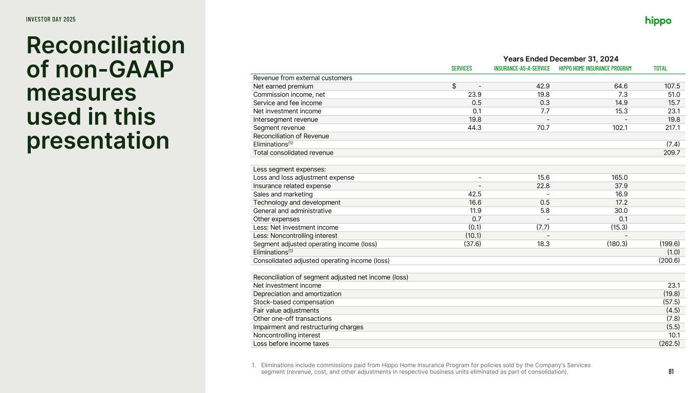 Years Ended December 31, 2024 SERVICES INSURANCE-AS-A-SERVICE HIPPO HOME INSURANCE PROGRAM TOTAL Revenue from external customers Net earned premium $ - 63.5 209.0 272.5 Commission income, net 32.5 24.1 4.0 60.6 Service and fee income 0.6 - 11.0 11.6 Net investment income 0.1 11.9 12.4 24.4 Intersegment revenue 15.0 - - 15.0 Segment revenue 48.2 99.5 236.4 384.1 Reconciliation of Revenue - Eliminations(1) (12.0) Total consolidated revenue 372.1 Less segment expenses: Loss and loss adjustment expense - 24.9 182.9 Insurance related expense - 31.1 48.1 Sales and marketing 31.8 - 6.0 Technology and development 10.6 0.3 12.6 General and administrative 10.8 6.9 25.9 Other expenses - - - Less: Net investment income (0.1) (11.9) (12.4) Less: Noncontrolling interest (11.9) - - Segment adjusted operating income (loss) (17.0) 24.4 (51.5) (44.0) Eliminations(1) 0.5 Consolidated adjusted operating income (loss) (43.5) Reconciliation of segment adjusted net income (loss) Net investment income 24.4 Depreciation and amortization (23.2) Stock-based compensation (38.2) Fair value adjustments (1.7) Other one-off transactions (7.9) Gain on sale of business 54.4 Impairment and restructuring charges (3.6) Noncontrolling interest 11.9 Loss before income taxes (27.4) Reconciliation of non-GAAP measures used in this presentation INVESTOR DAY 2025 80 1. Eliminations include commissions paid from Hippo Home Insurance Program for policies sold by the Company’s Services segment (revenue, cost, and other adjustments in respective business units eliminated as part of consolidation).