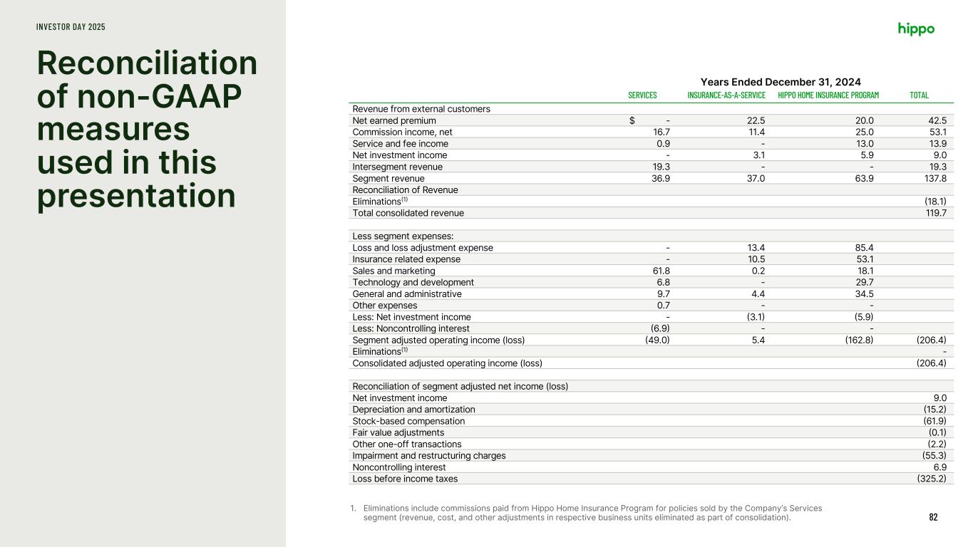 Reconciliation of non-GAAP measures used in this presentation INVESTOR DAY 2025 81 1. Eliminations include commissions paid from Hippo Home Insurance Program for policies sold by the Company’s Services segment (revenue, cost, and other adjustments in respective business units eliminated as part of consolidation). Years Ended December 31, 2024 SERVICES INSURANCE-AS-A-SERVICE HIPPO HOME INSURANCE PROGRAM TOTAL Revenue from external customers Net earned premium $ - 42.9 64.6 107.5 Commission income, net 23.9 19.8 7.3 51.0 Service and fee income 0.5 0.3 14.9 15.7 Net investment income 0.1 7.7 15.3 23.1 Intersegment revenue 19.8 - - 19.8 Segment revenue 44.3 70.7 102.1 217.1 Reconciliation of Revenue Eliminations(1) (7.4) Total consolidated revenue 209.7 Less segment expenses: Loss and loss adjustment expense - 15.6 165.0 Insurance related expense - 22.8 37.9 Sales and marketing 42.5 - 16.9 Technology and development 16.6 0.5 17.2 General and administrative 11.9 5.8 30.0 Other expenses 0.7 - 0.1 Less: Net investment income (0.1) (7.7) (15.3) Less: Noncontrolling interest (10.1) - - Segment adjusted operating income (loss) (37.6) 18.3 (180.3) (199.6) Eliminations(1) (1.0) Consolidated adjusted operating income (loss) (200.6) Reconciliation of segment adjusted net income (loss) Net investment income 23.1 Depreciation and amortization (19.8) Stock-based compensation (57.5) Fair value adjustments (4.5) Other one-off transactions (7.8) Impairment and restructuring charges (5.5) Noncontrolling interest 10.1 Loss before income taxes (262.5)