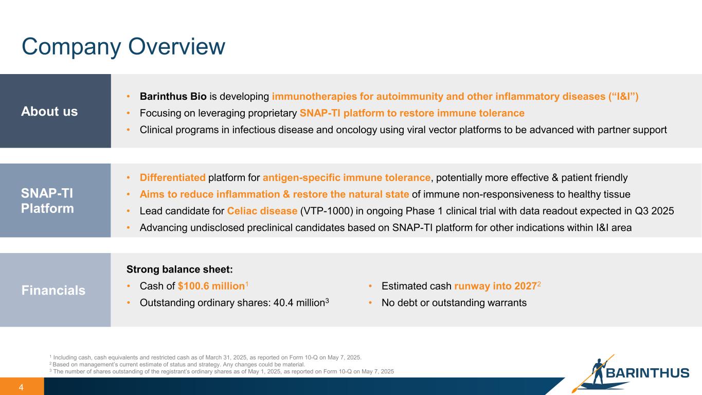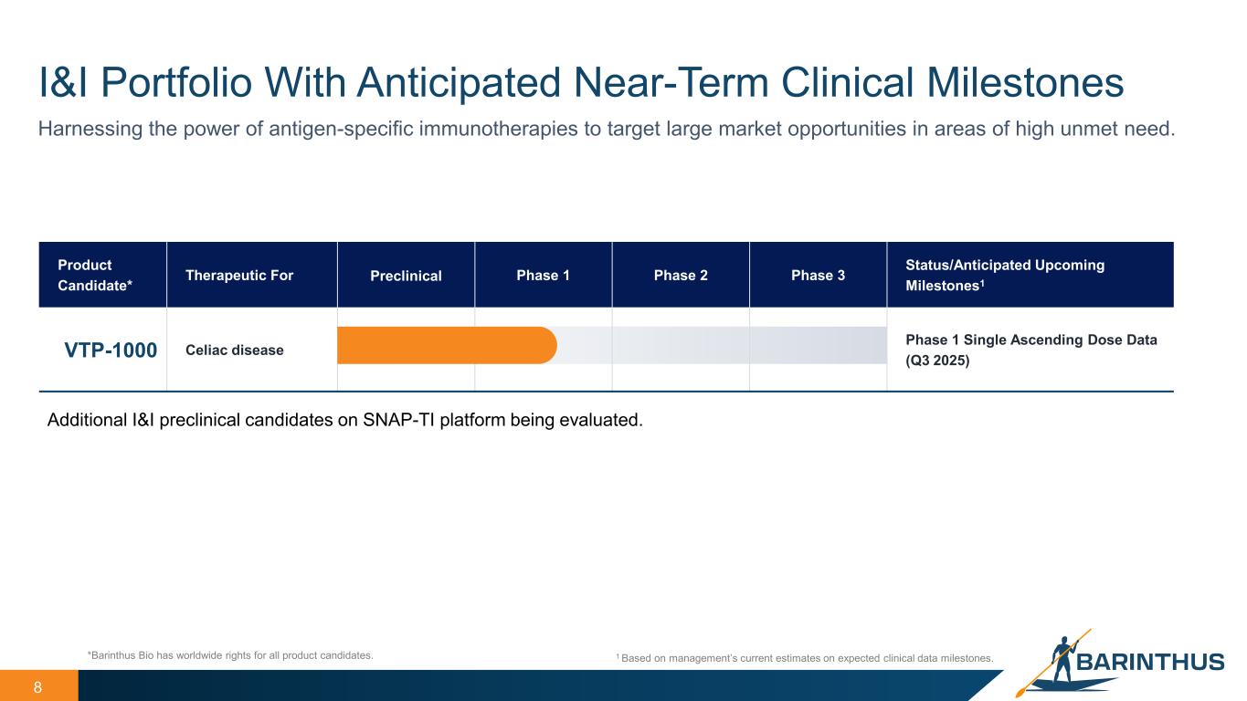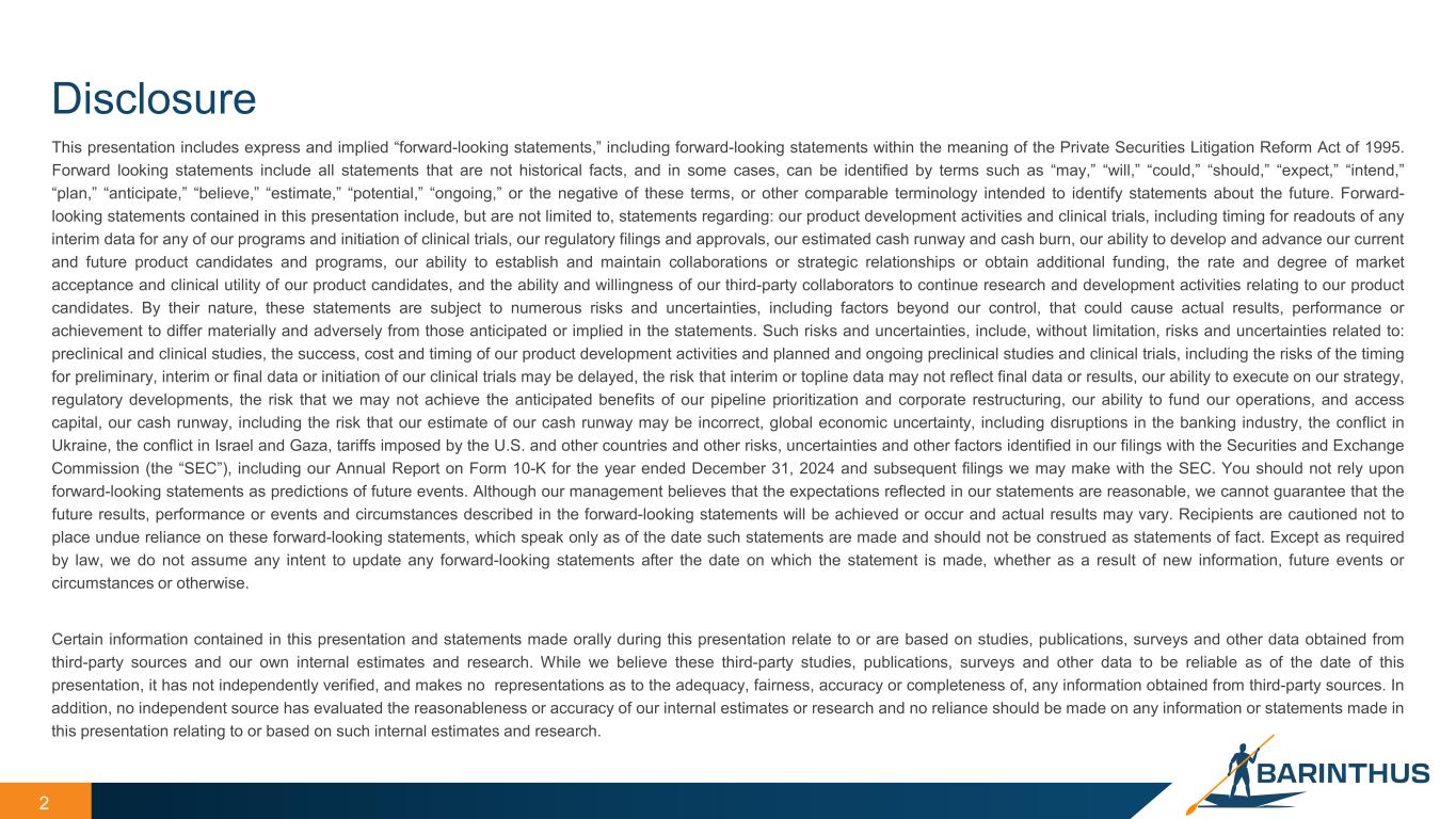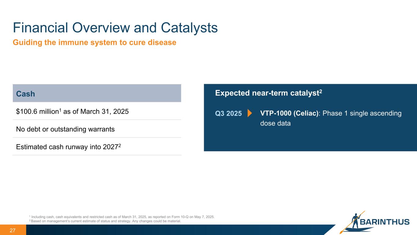 英国オックスフォードフォードおよびメリーランド州ガーマンタウン、2025年5月7日(GLOBE NEWSWIRE) - 治癒の可能性を秘めた免疫寛容を促進する治療法の開発に注力する免疫・炎症(I&I)企業であるバリンタス・バイオセラピューティクス plc(NASDAQ: BRNS、以下「バリンタス・バイオ」、または「当社」)は本日、2025年3月31日に終了した四半期決算を発表し、当社の企業動向の概要を発表しました。