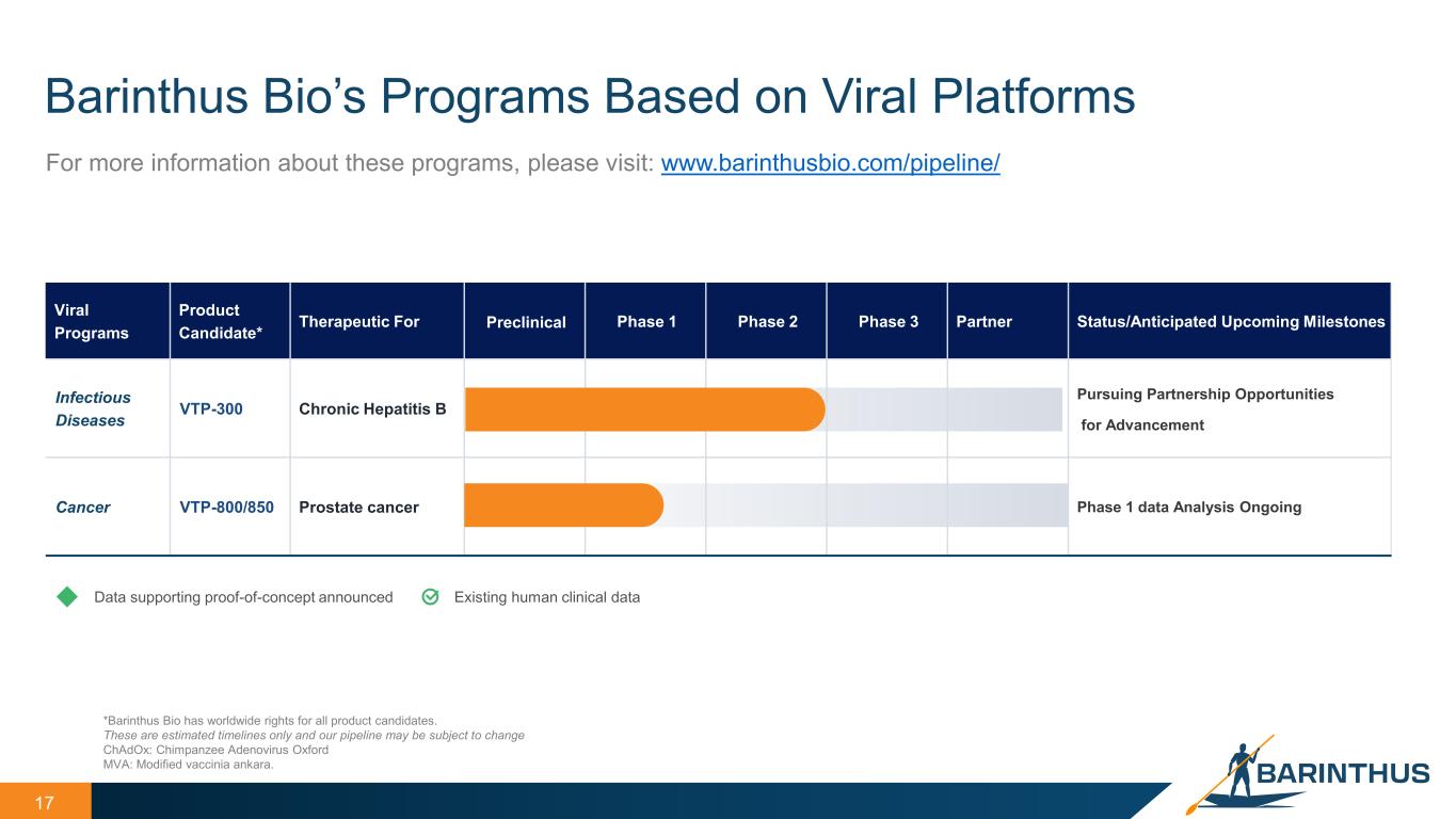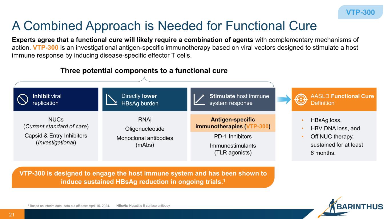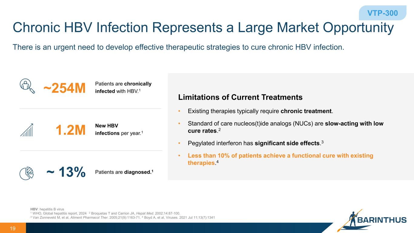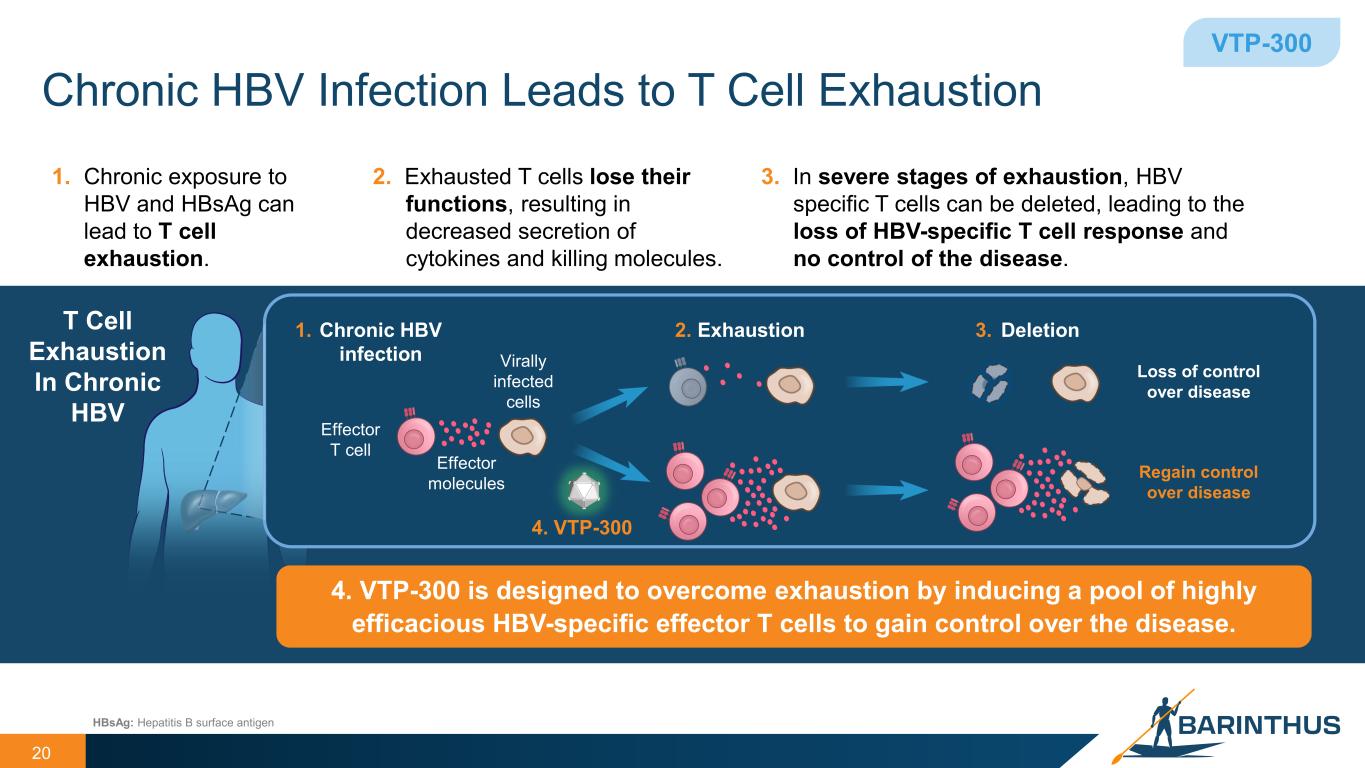 -2025年1月、バリンタス・バイオ社は、抗原特異的免疫寛容を含む免疫学と炎症の適応症を優先する戦略的事業の再集中と再編を発表した。B型慢性肝炎に対するVTP-300は、現在進行中のフェーズ2b HBV003臨床試験が終了した後は投資を行わず、HBsAgが低レベルの患者において持続的なHBsAg消失と機能的治癒を達成する差別化された能力を活用できる潜在的パートナーを探す。また、ウイルスベクター・プラットフォームに基づく他の資産についてもパートナーを求めている。