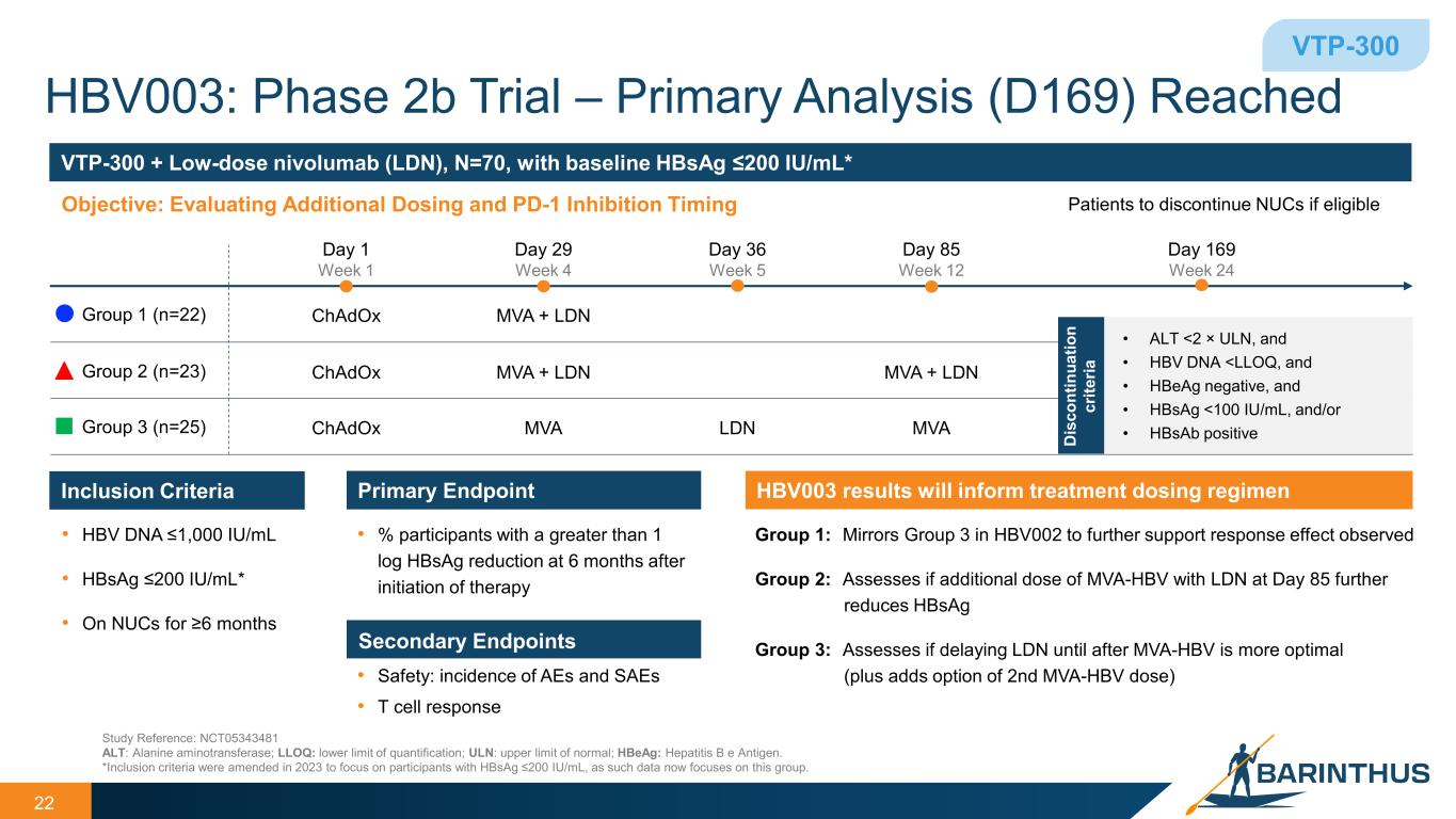 HBV003試験は、VTP-300と抗PD-1モノクローナル抗体である低用量ニボルマブ(LDN)を併用した3種類の投与レジメンの安全性、免疫原性、疾患修飾活性を評価するものです。主要解析結果は以下の通りです;
