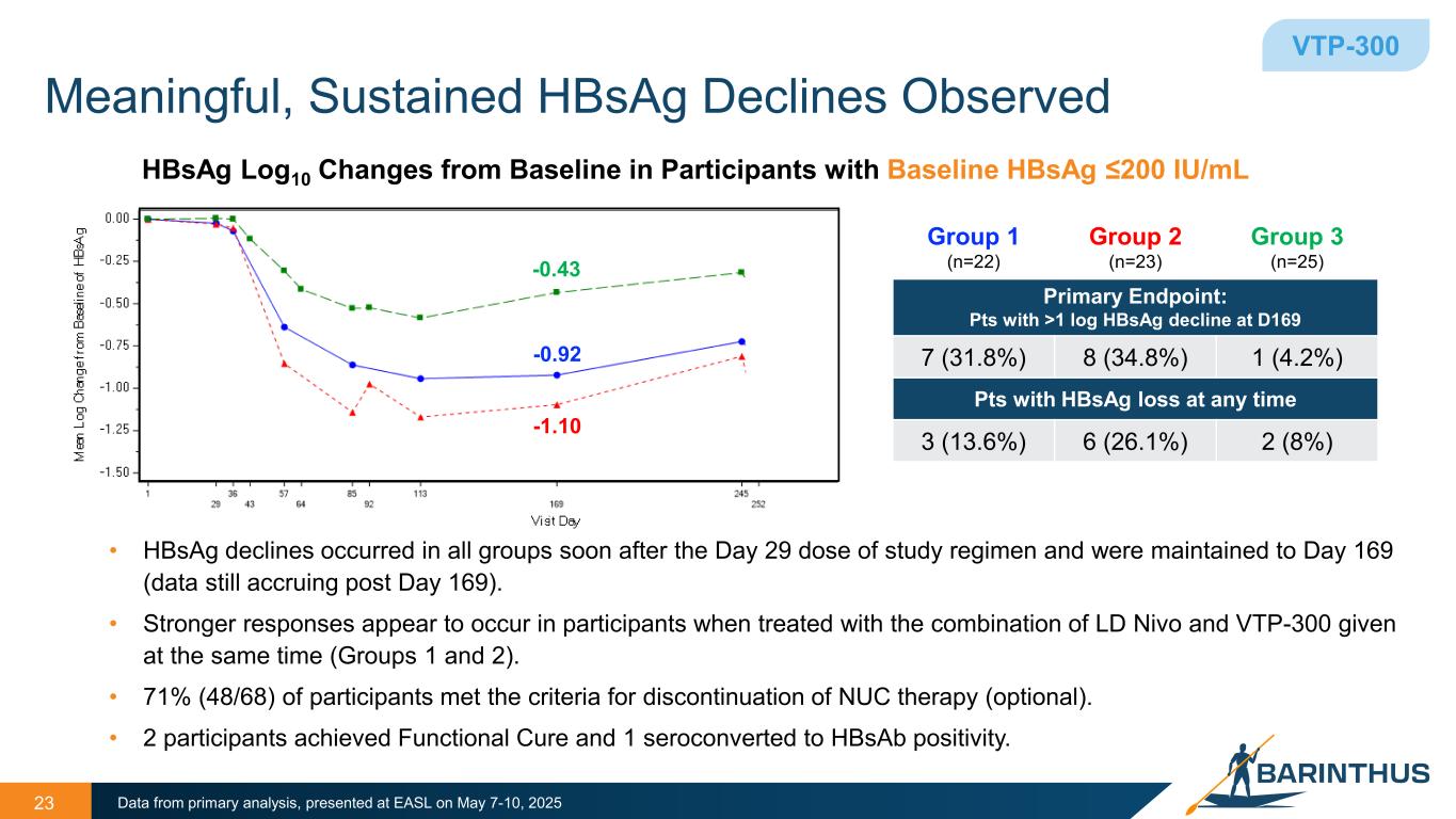 -ベースラインのHBsAg値が1000IU/mL未満でIDR、VTP-300、LDNの併用投与を受けた参加者の25%(2/8)が機能的治癒に達した;