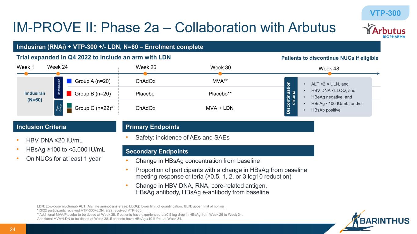 im-prove ii試験は、アルブタスのrnai治療薬であるイムドゥシラン(idr)と、バリンタス・バイオ社のt細胞刺激性免疫治療薬であるvtp-300の併用療法を、ldnとの併用または非併用で評価するものである。試験終了時のデータでは: