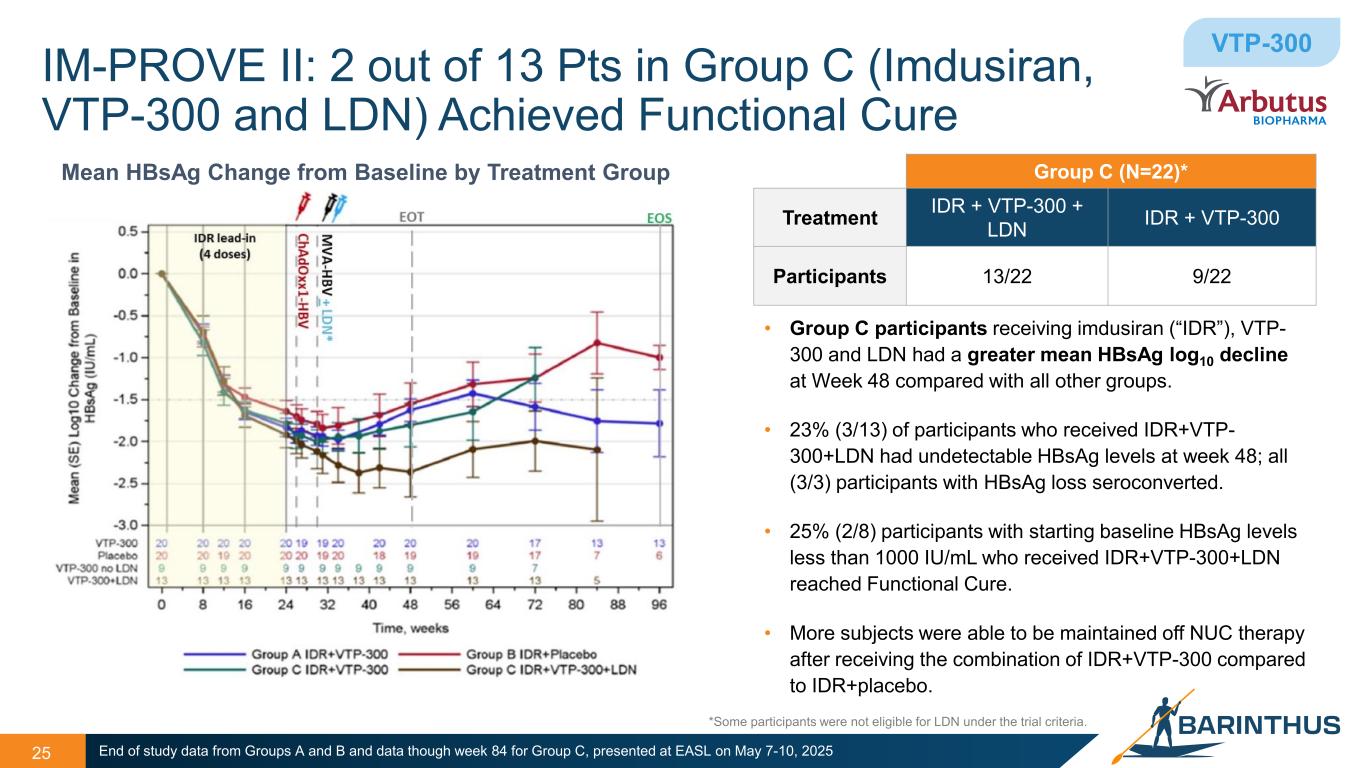 IM-PROVE II試験は、アルブタスのRNAi治療薬であるイムドゥシラン(IDR)と、バリンタス・バイオ社のT細胞刺激性免疫治療薬であるVTP-300の併用療法を、LDNとの併用または非併用で評価するものである。試験終了時のデータでは: