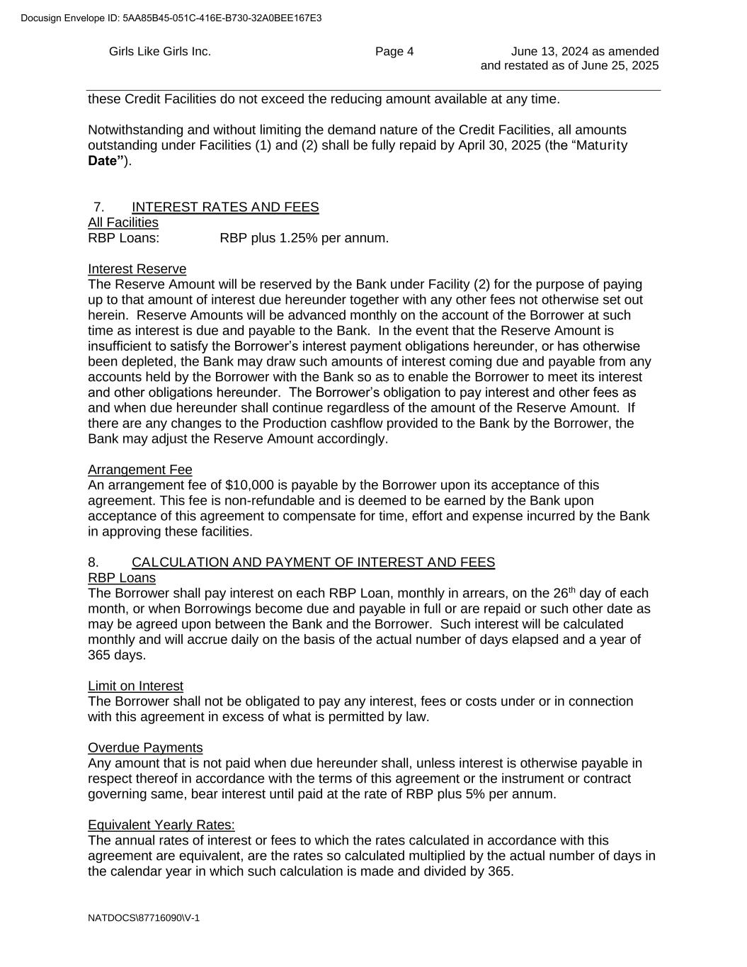 Girls Like Girls Inc. Page 4 June 13, 2024 as amended and restated as of June 25, 2025 NATDOCS\87716090\V-1 these Credit Facilities do not exceed the reducing amount available at any time. Notwithstanding and without limiting the demand nature of the Credit Facilities, all amounts outstanding under Facilities (1) and (2) shall be fully repaid by April 30, 2025 (the “Maturity Date”). 7. INTEREST RATES AND FEES All Facilities RBP Loans: RBP plus 1.25% per annum. Interest Reserve The Reserve Amount will be reserved by the Bank under Facility (2) for the purpose of paying up to that amount of interest due hereunder together with any other fees not otherwise set out herein. Reserve Amounts will be advanced monthly on the account of the Borrower at such time as interest is due and payable to the Bank. In the event that the Reserve Amount is insufficient to satisfy the Borrower’s interest payment obligations hereunder, or has otherwise been depleted, the Bank may draw such amounts of interest coming due and payable from any accounts held by the Borrower with the Bank so as to enable the Borrower to meet its interest and other obligations hereunder. The Borrower’s obligation to pay interest and other fees as and when due hereunder shall continue regardless of the amount of the Reserve Amount. If there are any changes to the Production cashflow provided to the Bank by the Borrower, the Bank may adjust the Reserve Amount accordingly. Arrangement Fee An arrangement fee of $10,000 is payable by the Borrower upon its acceptance of this agreement. This fee is non-refundable and is deemed to be earned by the Bank upon acceptance of this agreement to compensate for time, effort and expense incurred by the Bank in approving these facilities. 8. CALCULATION AND PAYMENT OF INTEREST AND FEES RBP Loans The Borrower shall pay interest on each RBP Loan, monthly in arrears, on the 26th day of each month, or when Borrowings become due and payable in full or are repaid or such other date as may be agreed upon between the Bank and the Borrower. Such interest will be calculated monthly and will accrue daily on the basis of the actual number of days elapsed and a year of 365 days. Limit on Interest The Borrower shall not be obligated to pay any interest, fees or costs under or in connection with this agreement in excess of what is permitted by law. Overdue Payments Any amount that is not paid when due hereunder shall, unless interest is otherwise payable in respect thereof in accordance with the terms of this agreement or the instrument or contract governing same, bear interest until paid at the rate of RBP plus 5% per annum. Equivalent Yearly Rates: The annual rates of interest or fees to which the rates calculated in accordance with this agreement are equivalent, are the rates so calculated multiplied by the actual number of days in the calendar year in which such calculation is made and divided by 365. Docusign Envelope ID: 5AA85B45-051C-416E-B730-32A0BEE167E3