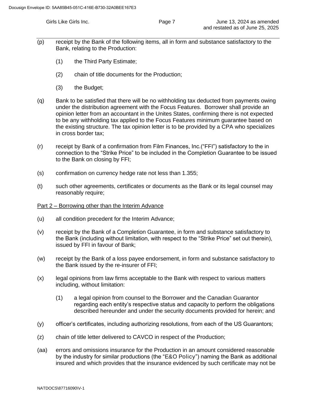 Girls Like Girls Inc. Page 7 June 13, 2024 as amended and restated as of June 25, 2025 NATDOCS\87716090\V-1 (p) receipt by the Bank of the following items, all in form and substance satisfactory to the Bank, relating to the Production: (1) the Third Party Estimate; (2) chain of title documents for the Production; (3) the Budget; (q) Bank to be satisfied that there will be no withholding tax deducted from payments owing under the distribution agreement with the Focus Features. Borrower shall provide an opinion letter from an accountant in the Unites States, confirming there is not expected to be any withholding tax applied to the Focus Features minimum guarantee based on the existing structure. The tax opinion letter is to be provided by a CPA who specializes in cross border tax; (r) receipt by Bank of a confirmation from Film Finances, Inc.(“FFI”) satisfactory to the in connection to the “Strike Price” to be included in the Completion Guarantee to be issued to the Bank on closing by FFI; (s) confirmation on currency hedge rate not less than 1.355; (t) such other agreements, certificates or documents as the Bank or its legal counsel may reasonably require; Part 2 – Borrowing other than the Interim Advance (u) all condition precedent for the Interim Advance; (v) receipt by the Bank of a Completion Guarantee, in form and substance satisfactory to the Bank (including without limitation, with respect to the “Strike Price” set out therein), issued by FFI in favour of Bank; (w) receipt by the Bank of a loss payee endorsement, in form and substance satisfactory to the Bank issued by the re-insurer of FFI; (x) legal opinions from law firms acceptable to the Bank with respect to various matters including, without limitation: (1) a legal opinion from counsel to the Borrower and the Canadian Guarantor regarding each entity’s respective status and capacity to perform the obligations described hereunder and under the security documents provided for herein; and (y) officer’s certificates, including authorizing resolutions, from each of the US Guarantors; (z) chain of title letter delivered to CAVCO in respect of the Production; (aa) errors and omissions insurance for the Production in an amount considered reasonable by the industry for similar productions (the “E&O Policy”) naming the Bank as additional insured and which provides that the insurance evidenced by such certificate may not be Docusign Envelope ID: 5AA85B45-051C-416E-B730-32A0BEE167E3