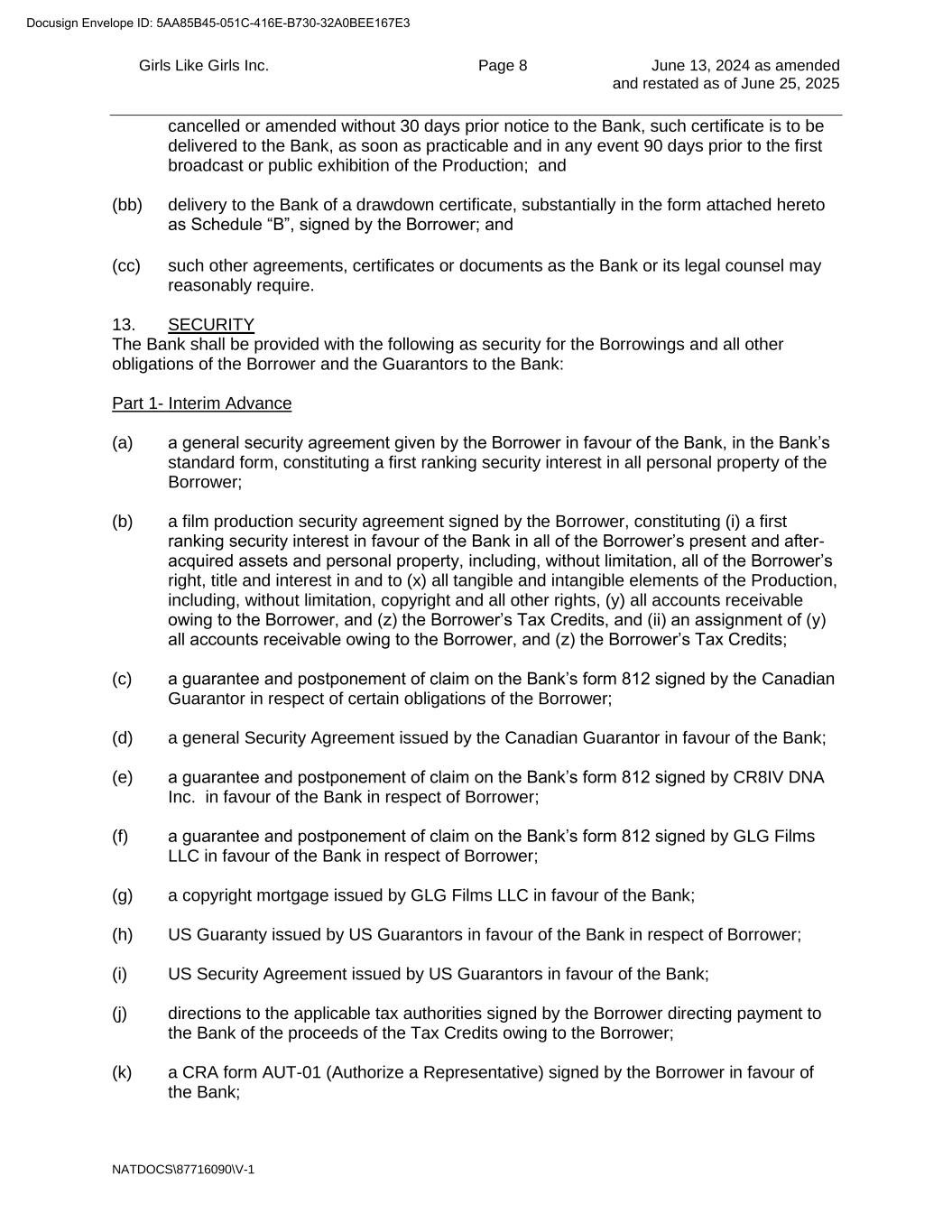 Girls Like Girls Inc. Page 8 June 13, 2024 as amended and restated as of June 25, 2025 NATDOCS\87716090\V-1 cancelled or amended without 30 days prior notice to the Bank, such certificate is to be delivered to the Bank, as soon as practicable and in any event 90 days prior to the first broadcast or public exhibition of the Production; and (bb) delivery to the Bank of a drawdown certificate, substantially in the form attached hereto as Schedule “B”, signed by the Borrower; and (cc) such other agreements, certificates or documents as the Bank or its legal counsel may reasonably require. 13. SECURITY The Bank shall be provided with the following as security for the Borrowings and all other obligations of the Borrower and the Guarantors to the Bank: Part 1- Interim Advance (a) a general security agreement given by the Borrower in favour of the Bank, in the Bank’s standard form, constituting a first ranking security interest in all personal property of the Borrower; (b) a film production security agreement signed by the Borrower, constituting (i) a first ranking security interest in favour of the Bank in all of the Borrower’s present and after- acquired assets and personal property, including, without limitation, all of the Borrower’s right, title and interest in and to (x) all tangible and intangible elements of the Production, including, without limitation, copyright and all other rights, (y) all accounts receivable owing to the Borrower, and (z) the Borrower’s Tax Credits, and (ii) an assignment of (y) all accounts receivable owing to the Borrower, and (z) the Borrower’s Tax Credits; (c) a guarantee and postponement of claim on the Bank’s form 812 signed by the Canadian Guarantor in respect of certain obligations of the Borrower; (d) a general Security Agreement issued by the Canadian Guarantor in favour of the Bank; (e) a guarantee and postponement of claim on the Bank’s form 812 signed by CR8IV DNA Inc. in favour of the Bank in respect of Borrower; (f) a guarantee and postponement of claim on the Bank’s form 812 signed by GLG Films LLC in favour of the Bank in respect of Borrower; (g) a copyright mortgage issued by GLG Films LLC in favour of the Bank; (h) US Guaranty issued by US Guarantors in favour of the Bank in respect of Borrower; (i) US Security Agreement issued by US Guarantors in favour of the Bank; (j) directions to the applicable tax authorities signed by the Borrower directing payment to the Bank of the proceeds of the Tax Credits owing to the Borrower; (k) a CRA form AUT-01 (Authorize a Representative) signed by the Borrower in favour of the Bank; Docusign Envelope ID: 5AA85B45-051C-416E-B730-32A0BEE167E3