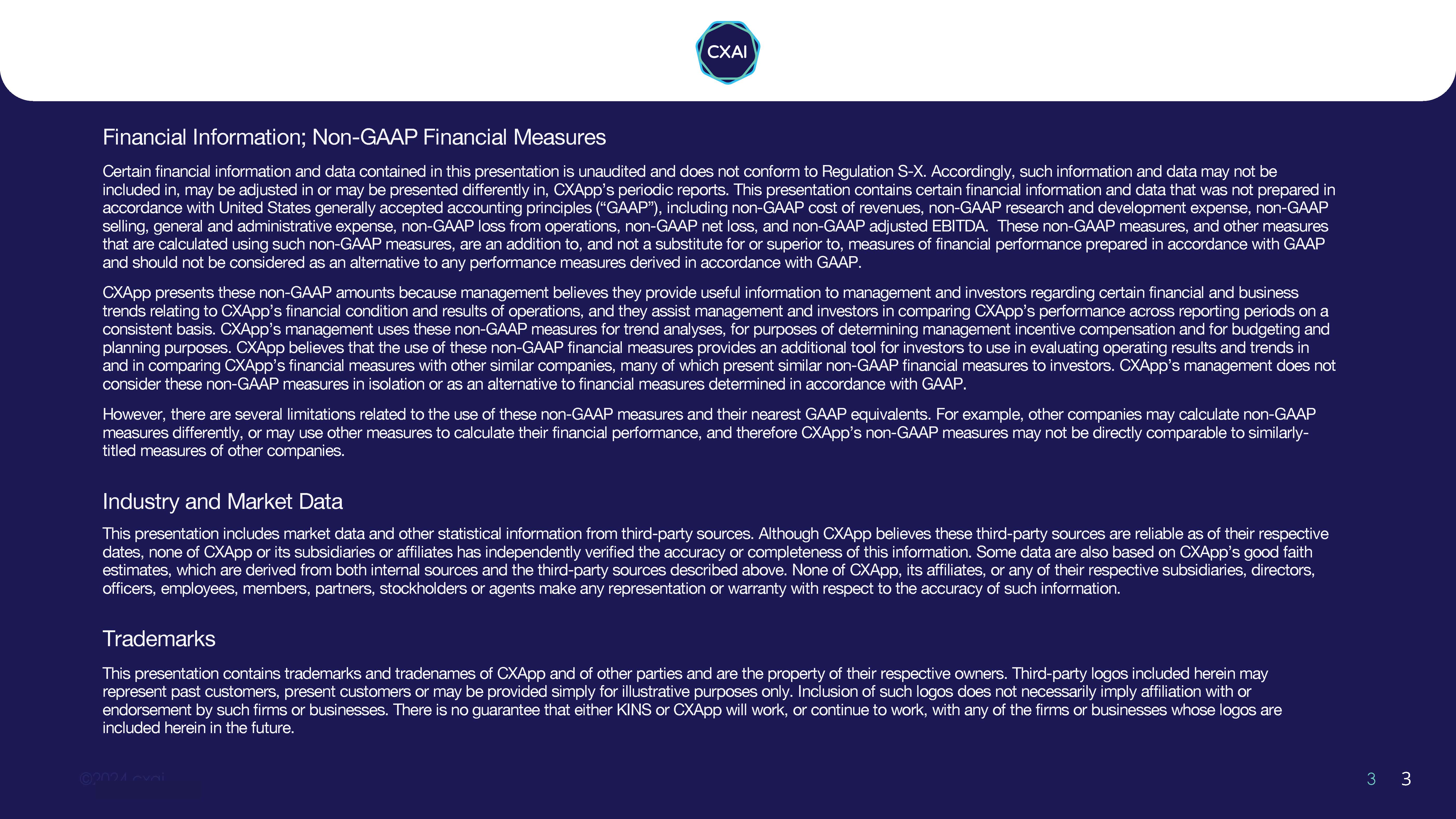 本報告書には、修正再表示が当社の過去の財務諸表に与える影響に関する当社の予想および予備的見積り、修正再表示の範囲および統制と手続の不備、修正再表示が本Form 8-Kの最新報告書に明記されている以外のGAAPまたは非GAAP指標に影響を与えないとの見解など、連邦証券法で定義される将来予想に関する記述が含まれていますが、これらに限定されるものではありません;修正再表示の完了および修正再表示の提出の時期、財務報告に係る内部統制および開示統制・手続に関する重大な脆弱性を含む不備を是正する計画、これらの事項が当社の業績および見通しに与える影響、当社の業績および財務見通しに関する予想、および前述のいずれかの基礎となる記述または仮定。将来予想に関する記述は、過去または現在の事実とは厳密に関連していないという事実によって識別することができます。これらの記述には、将来の事象の時期や性質に関する議論に関連して、「もし」、「予想する」、「推定する」、「期待する」、「計画する」、「意図する」、「信じる」、「かもしれない」、「予定する」、「はずである」、「可能性が高い」などの言葉や類似した意味の用語が含まれる場合があります。当社は、当社に影響を及ぼす将来の展開が、当社が予期したものであることを保証することはできません。実際の結果が当社の予想と大きく異なる原因となり得る重要なリスクおよび不確実性には、特に、修正再表示および関連する提出書類の適時かつ正確な完了に関連するリスク、過去に発行された財務諸表の修正再表示を必要とする財務報告の誤りが将来的に判明し、当社に予期せぬコストまたは規制上の罰則が課される可能性があること、また当社の財務諸表の正確性および完全性に対する投資家の信頼を失わせる可能性があることなどが含まれます;本書に記載されている定期報告書のSECへの提出予定前に追加情報が判明するリスク、または当社が財務諸表を追加修正する必要が生じたり、修正報告書や将来の定期報告書のSECへの提出を遅延させるような後発事象が発生するリスク、修正再表示が以前の財務諸表や業績に及ぼす影響の変化に関するリスク;修正再表示手続き完了後の予想以上の費用計上に関するリスク、過去の財務諸表の提出遅延に関するリスク、財務報告の正確性および適時性に悪影響を及ぼす可能性のある、財務報告に係る効果的な内部統制を今後導入・維持する能力に関するリスク;会計規則または規制の変更に関するリスク、納税義務および実効税率の変動ならびに繰越欠損金を含む繰延税金資産の実現に関するリスク;会計原則または税務原則の予期せぬ適用に関するリスク、主要な人材への依存に関するリスクおよび主要な人材を確保する能力の変化、ならびに証券取引委員会に提出した最新のForm S-1、Form 10-KおよびForm 10-Qの「リスク要因」および「財政状態および経営成績に関する経営陣の検討および分析」の項で開示したリスクおよび不確実性、ならびにSECに提出したその後の報告書の同様の開示。cxapp.comおよびSECウェブサイトwww.sec.gov。本リリースに記載されている当社の将来の見通しに関する記述は、当社がその記述を行った時点のものです。当社は、適用される証券法によって要求される場合を除き、新たな情報、将来の進展、またはその他の結果にかかわらず、いかなる将来予想に関する記述も公に更新する義務を負いません。