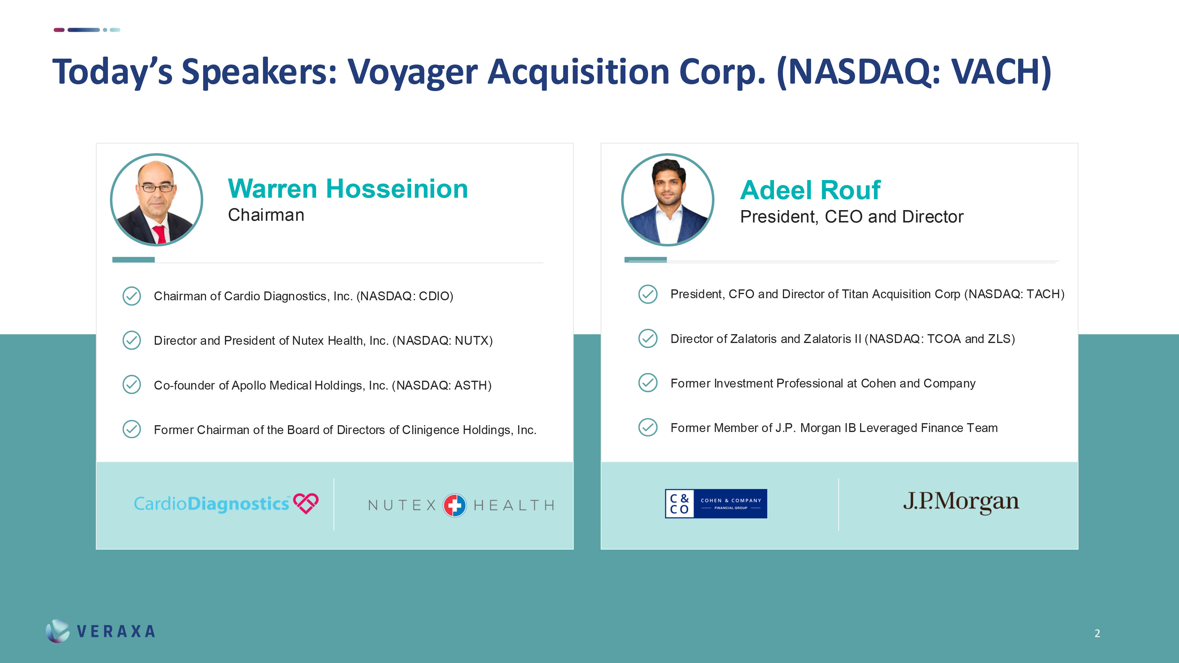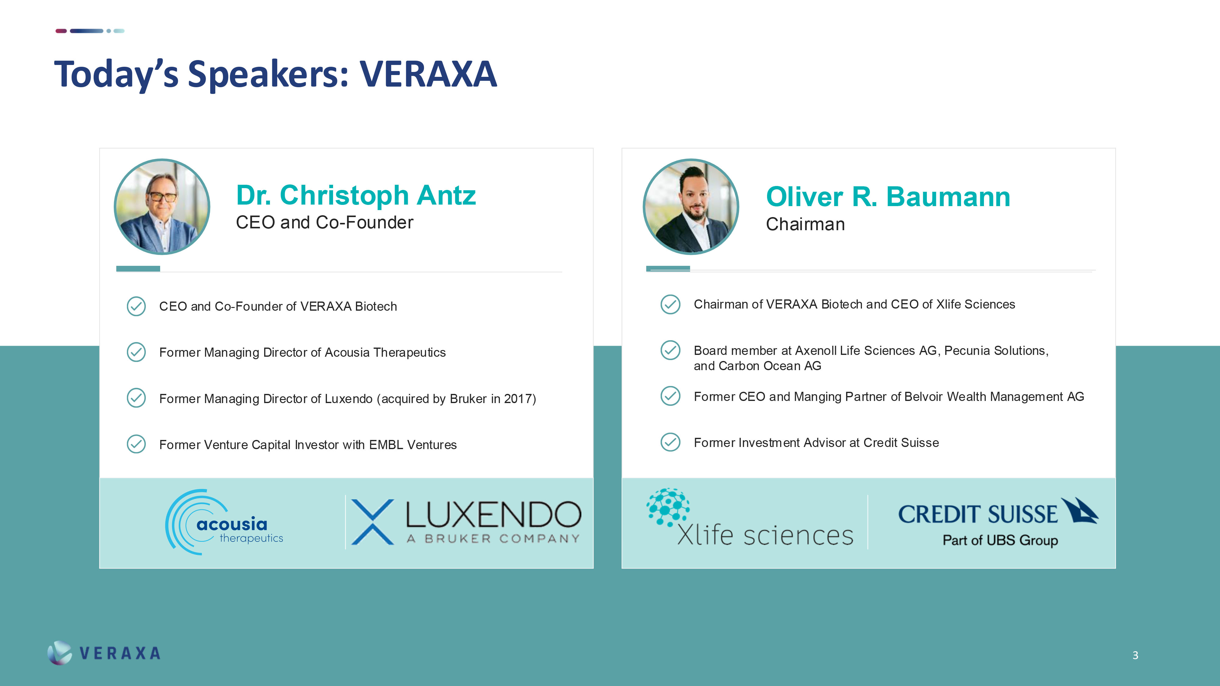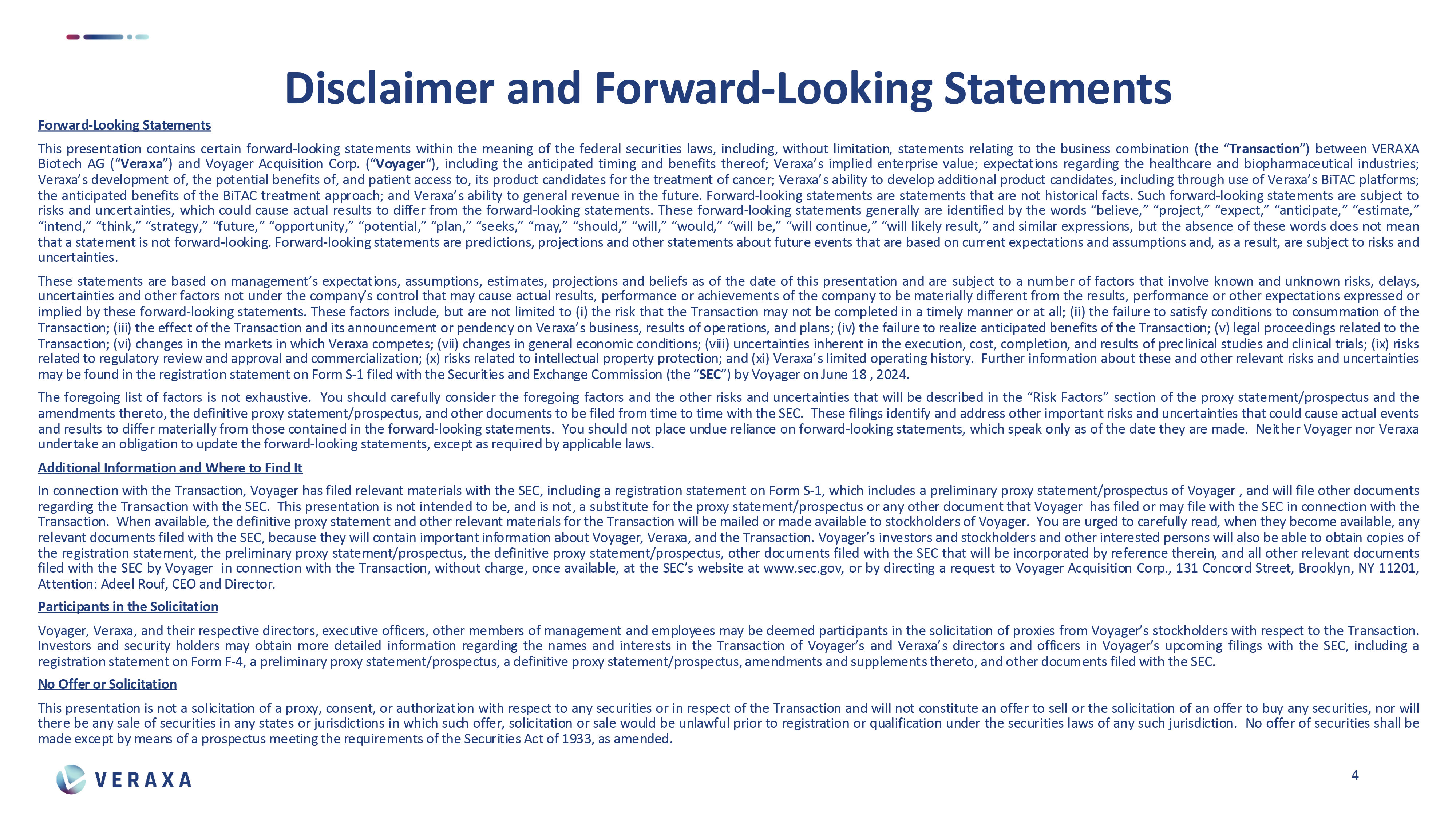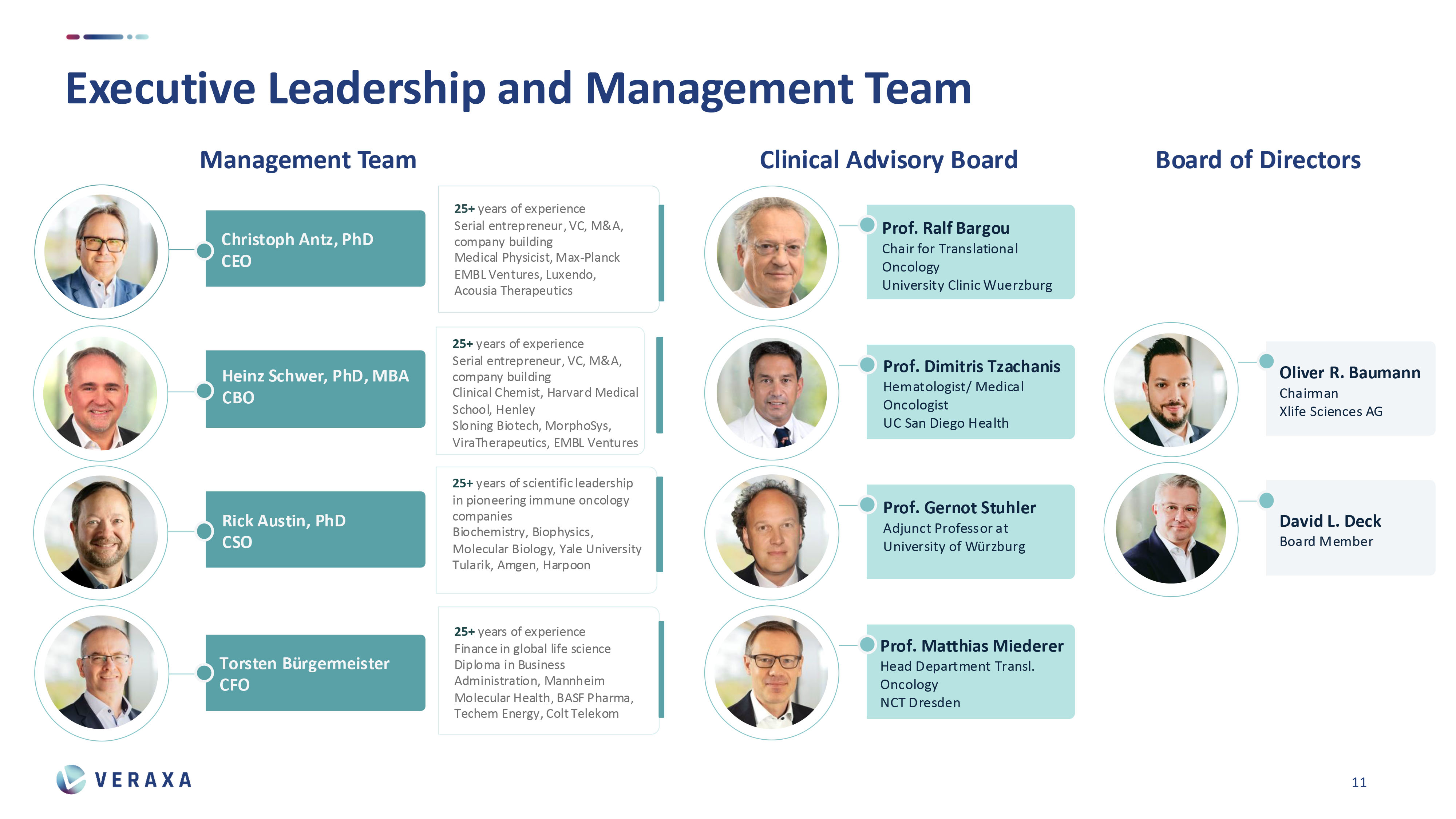 | ● | VERAXA has a strong financial backing – we are planning with 25 million Dollars in pre-IPO funding by existing and new investors, with additional capital locked in at closing to advance our clinical programs. |