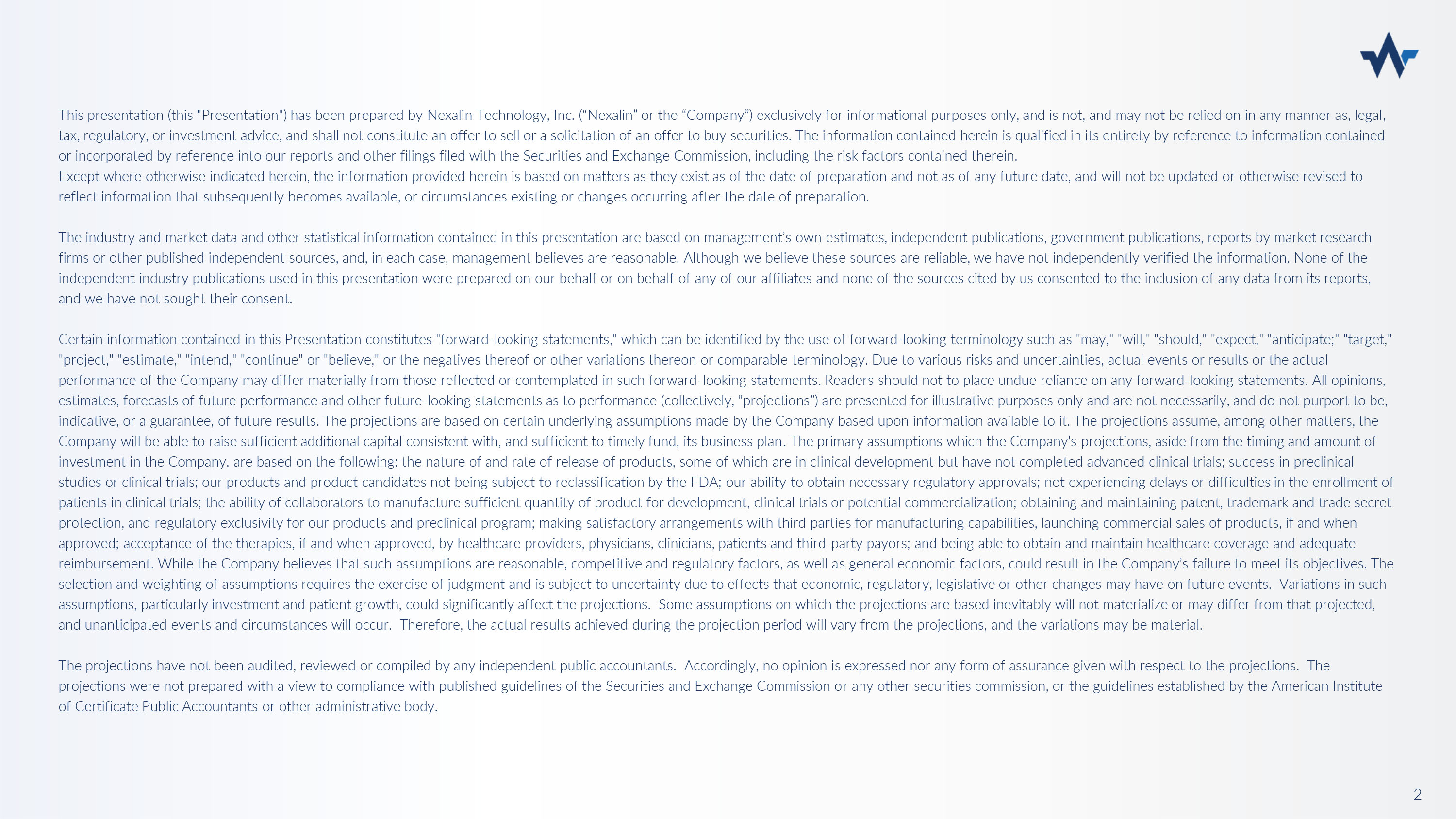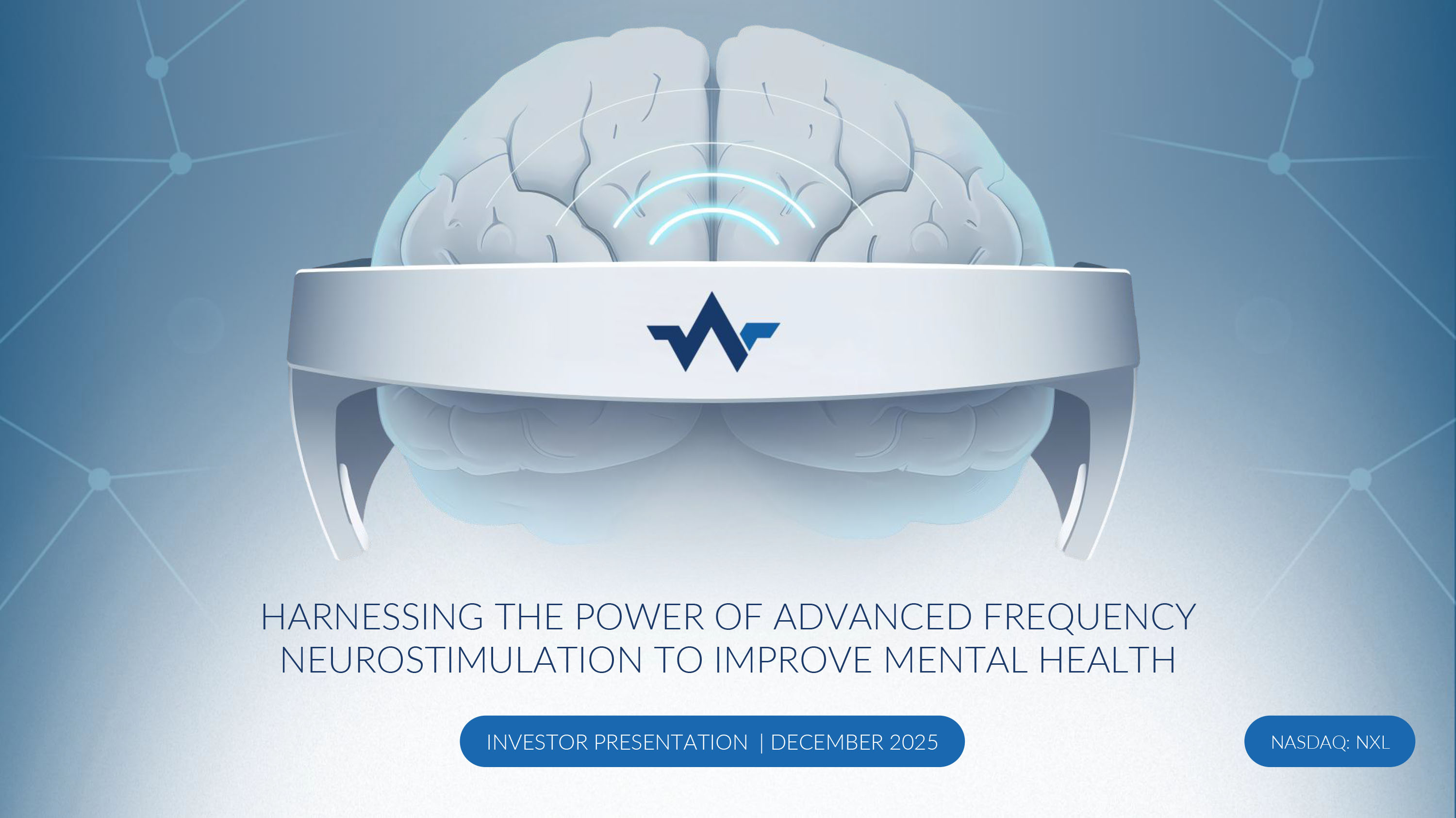 HARNESSING THE POWER OF ADVANCED FREQUENCY NEUROSTIMULATION TO IMPROVE MENTAL HEALTH INVESTOR PRESENTATION | DECEMBER 2025 NASDAQ: NXL This presentation (this "Presentation") has been prepared by Nexalin Technology, Inc . (“Nexalin” or the “Company”) exclusively for informational purposes only, and is not, and may not be relied on in any manner as, legal, tax, regulatory, or investment advice, and shall not constitute an offer to sell or a solicitation of an offer to buy securities . The information contained herein is qualified in its entirety by reference to information contained or incorporated by reference into our reports and other filings filed with the Securities and Exchange Commission, including the risk factors contained therein . Except where otherwise indicated herein, the information provided herein is based on matters as they exist as of the date of preparation and not as of any future date, and will not be updated or otherwise revised to reflect information that subsequently becomes available, or circumstances existing or changes occurring after the date of preparation . The industry and market data and other statistical information contained in this presentation are based on management’s own estimates, independent publications, government publications, reports by market research firms or other published independent sources, and, in each case, management believes are reasonable. Although we believe these sources are reliable, we have not independently verified the information. None of the independent industry publications used in this presentation were prepared on our behalf or on behalf of any of our affiliates and none of the sources cited by us consented to the inclusion of any data from its reports, and we have not sought their consent. Certain information contained in this Presentation constitutes "forward - looking statements," which can be identified by the use of forward - looking terminology such as "may," "will," "should," "expect," "anticipate;" "target," "project," "estimate," "intend," "continue" or "believe," or the negatives thereof or other variations thereon or comparable terminology. Due to various risks and uncertainties, actual events or results or the actual performance of the Company may differ materially from those reflected or contemplated in such forward - looking statements. Readers should not to place undue reliance on any forward - looking statements. All opinions, estimates, forecasts of future performance and other future - looking statements as to performance (collectively, “projections”) are presented for illustrative purposes only and are not necessarily, and do not purport to be, indicative, or a guarantee, of future results. The projections are based on certain underlying assumptions made by the Company based upon information available to it. The projections assume, among other matters, the Company will be able to raise sufficient additional capital consistent with, and sufficient to timely fund, its business plan. The primary assumptions which the Company's projections, aside from the timing and amount of investment in the Company, are based on the following: the nature of and rate of release of products, some of which are in clinical development but have not completed advanced clinical trials; success in preclinical studies or clinical trials; our products and product candidates not being subject to reclassification by the FDA; our ability to obtain necessary regulatory approvals; not experiencing delays or difficulties in the enrollment of patients in clinical trials; the ability of collaborators to manufacture sufficient quantity of product for development, clinical trials or potential commercialization; obtaining and maintaining patent, trademark and trade secret protection, and regulatory exclusivity for our products and preclinical program; making satisfactory arrangements with third parties for manufacturing capabilities, launching commercial sales of products, if and when approved; acceptance of the therapies, if and when approved, by healthcare providers, physicians, clinicians, patients and third - party payors; and being able to obtain and maintain healthcare coverage and adequate reimbursement. While the Company believes that such assumptions are reasonable, competitive and regulatory factors, as well as general economic factors, could result in the Company’s failure to meet its objectives. The selection and weighting of assumptions requires the exercise of judgment and is subject to uncertainty due to effects that economic, regulatory, legislative or other changes may have on future events. Variations in such assumptions, particularly investment and patient growth, could significantly affect the projections. Some assumptions on which the projections are based inevitably will not materialize or may differ from that projected, and unanticipated events and circumstances will occur. Therefore, the actual results achieved during the projection period will vary from the projections, and the variations may be material. The projections have not been audited, reviewed or compiled by any independent public accountants. Accordingly, no opinion is expressed nor any form of assurance given with respect to the projections. The projections were not prepared with a view to compliance with published guidelines of the Securities and Exchange Commission or any other securities commission, or the guidelines established by the American Institute of Certificate Public Accountants or other administrative body. 2 Alzheimer’s and Dementia 2 60M * Anxiety 2 360M * TBI/PTSD (Military) 2,3 350M * Depression 2 330M * Mental Health is a Global Epidemic A Market full of Drugs, a Mind Full of Problems 3 INVESTOR PRESENTATION | DECEMBER 2025 Insomnia 1 850M * * Number of Patients