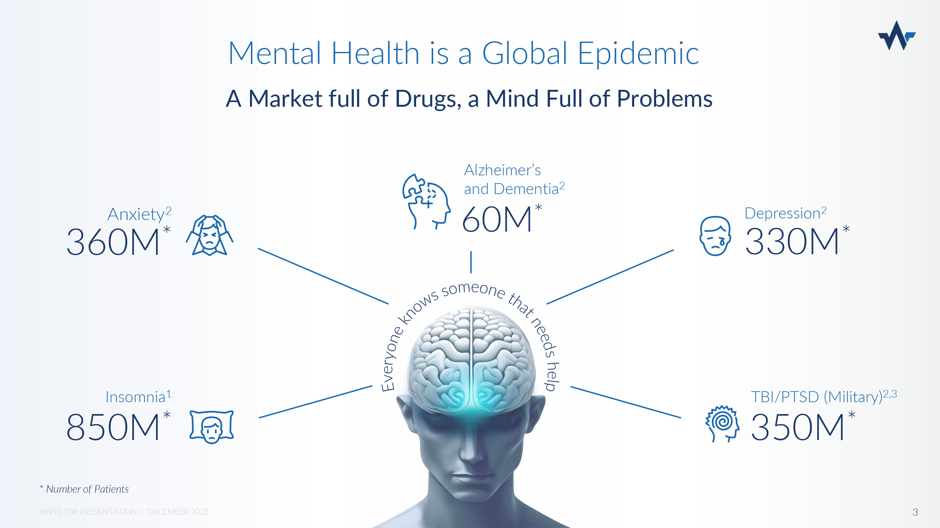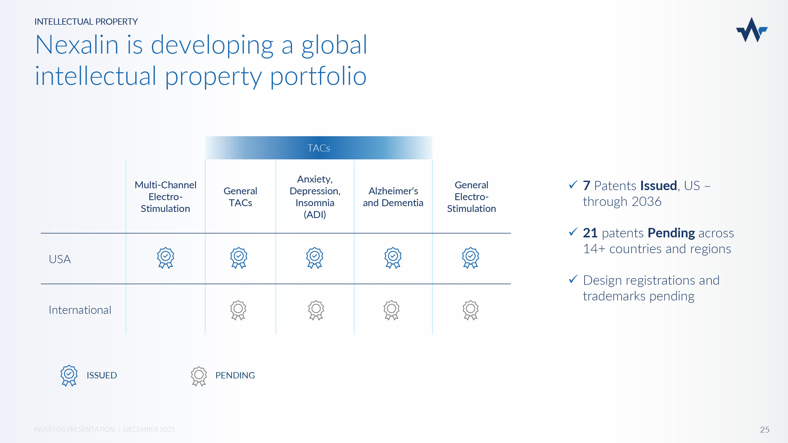 Nexalin Leadership 1. Benjafield AV, Kuniyoshi FS, Malhotra A, et al. Estimation of the global prevalence and burden of insomnia: a systematic literature review - based analysis. Sleep Medicine Reviews. 2025;82:102121 - 102121. do i:https://doi.org/10.1016/j.smrv.2025.102121 2. World Health Organization 3. Yan J, Wang C, Sun B. Global, regional, and national burdens of traumatic brain injury from 1990 to 2021. Front Public Health. 2025;13:1556147. Published 2025 Apr 14. doi:10.3389/fpubh.2025.1556147 4. Market Research Future 5. Yahoo Finance 6. Grand View Research 7. S&S Insider 8. McHugh, R. K., Whitton, S. W., Peckham, A. D., Welge, J. A., & Otto, M. W. (2013). Patient preference for psychological vs pharmacologic treatment of psychiatric disorders: a meta - analytic review. The Journal of clinical psychiatry, 74(6) 9. Insomnia Clinical Trial - Effect of Transcranial Alternating Current Stimulation for the Treatment of Chronic Insomnia: A Randomized, Double - Blind, Parallel - Group, Placebo - Controlled Clinical Trial. https://pubmed.ncbi.nlm.nih.gov/31846980/ 10. Depression Clinical Trial - Transcranial alternating current stimulation for treating depression: a randomized controlled trial. https://pubmed.ncbi.nlm.nih.gov/35353887/ 11. Tang Y, Xing Y, Sun L, et al. TRanscranial AlterNating current stimulation FOR patients with mild Alzheimer's Disease (TRANSFORM - AD): a randomized controlled clinical trial. Alzheimers Res Ther. 2024;16(1):203. Published 2024 Sep 12. doi:10.1186/s13195 - 024 - 01570 - 0 12. Wang T, Yan S, Shan Y, et al. Altered Neuronal Activity Patterns of the Prefrontal Cortex in Alzheimer's Disease After Transcranial Alternating Current Stimulation: A Resting - State fMRI Study. J Alzheimers Dis. 2024;101(3):901 - 912. doi:10.3233/JAD - 240400 13. Wang T, Yan S, Shan Y, et al. Modulation of Cortical and Hippocampal Functional MRI Connectivity Following Transcranial Alternating Current Stimulation in Mild Alzheimer Disease. Radiology. 2025;315(3):e241463. doi:10.1148/radiol.241463 Sources/References 33 INVESTOR PRESENTATION | DECEMBER 2025