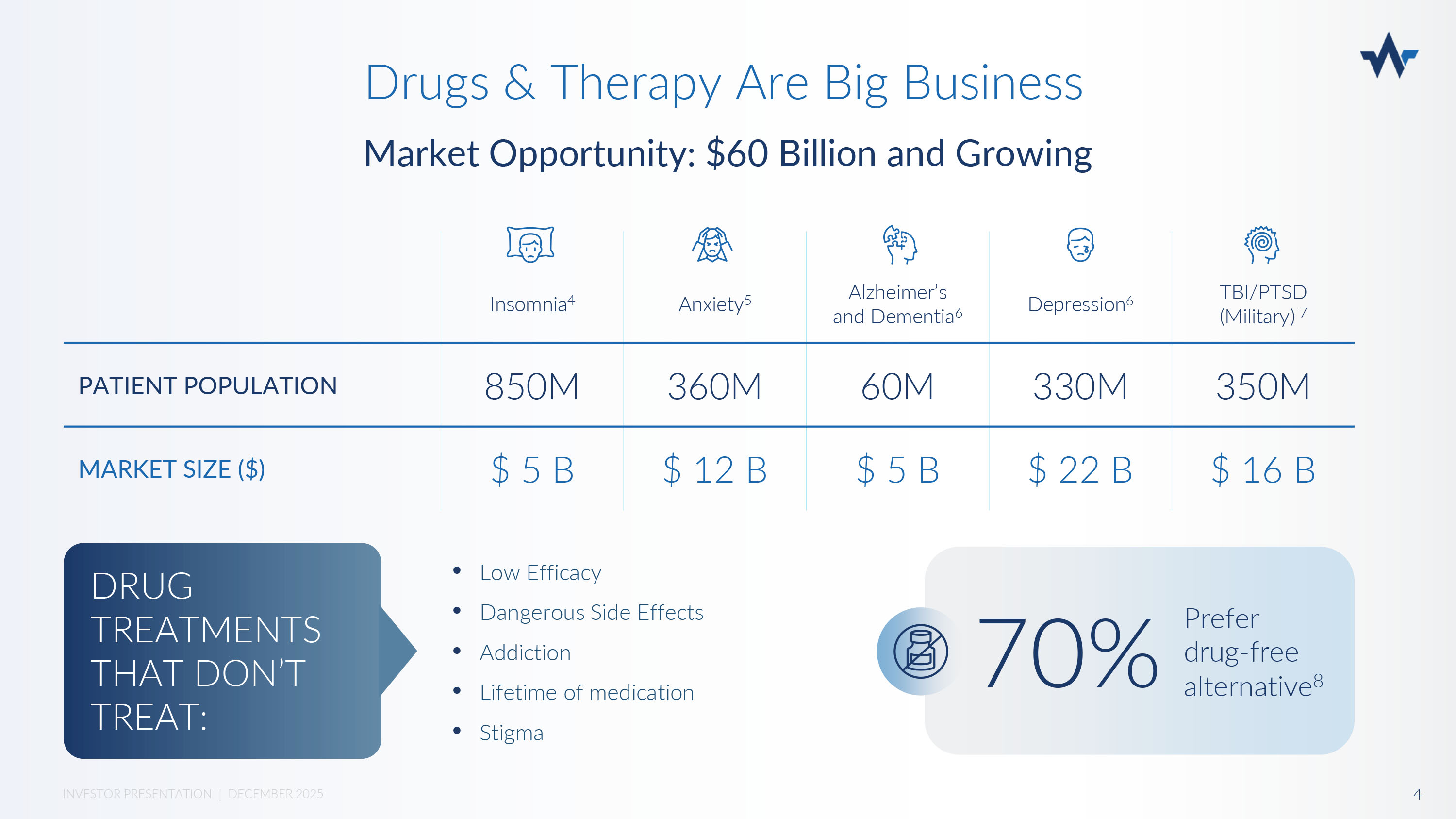 Drugs & Therapy Are Big Business Market Opportunity: $60 Billion and Growing TBI/PTSD (Military) 7 Depression 6 Alzheimer’s and Dementia 6 Anxiety 5 Insomnia 4 350M 330M 60M 360M 850M PATIENT POPULATION $ 16 B $ 22 B $ 5 B $ 12 B $ 5 B MARKET SIZE ($) • Low Efficacy • Dangerous Side Effects • Addiction • Lifetime of medication • Stigma DRUG TREATMENTS THAT DON’T TREAT: Prefer drug - free alternative 8 70% 4 INVESTOR PRESENTATION | DECEMBER 2025 Current non - invasive neurostimulation technologies are marketed as alternatives to drugs but are limited by safety and efficacy: More Treatments that Don’t Treat EFFICACY SAFETY Limited power = limited efficacy (1 - 1.5 mA) Nexalin: 15mA Treatment response is limited by patient’s threshold of discomfort Treatment response is less than or equal to medication (<50%) 9,10 Unregulated usage for some (no physician oversight) THESE TECHNOLOGIES FAIL TO MEET PATIENT NEEDS.