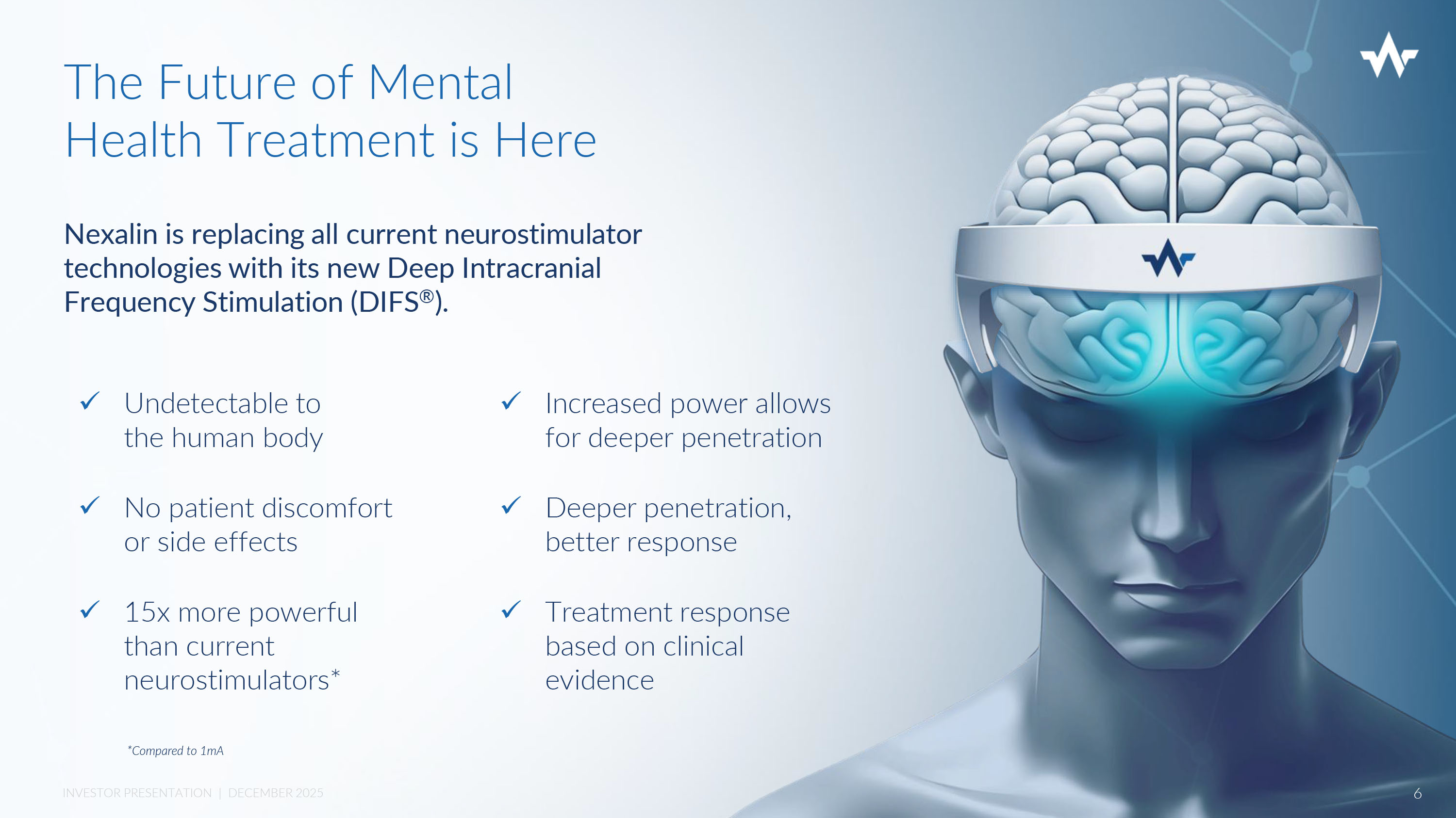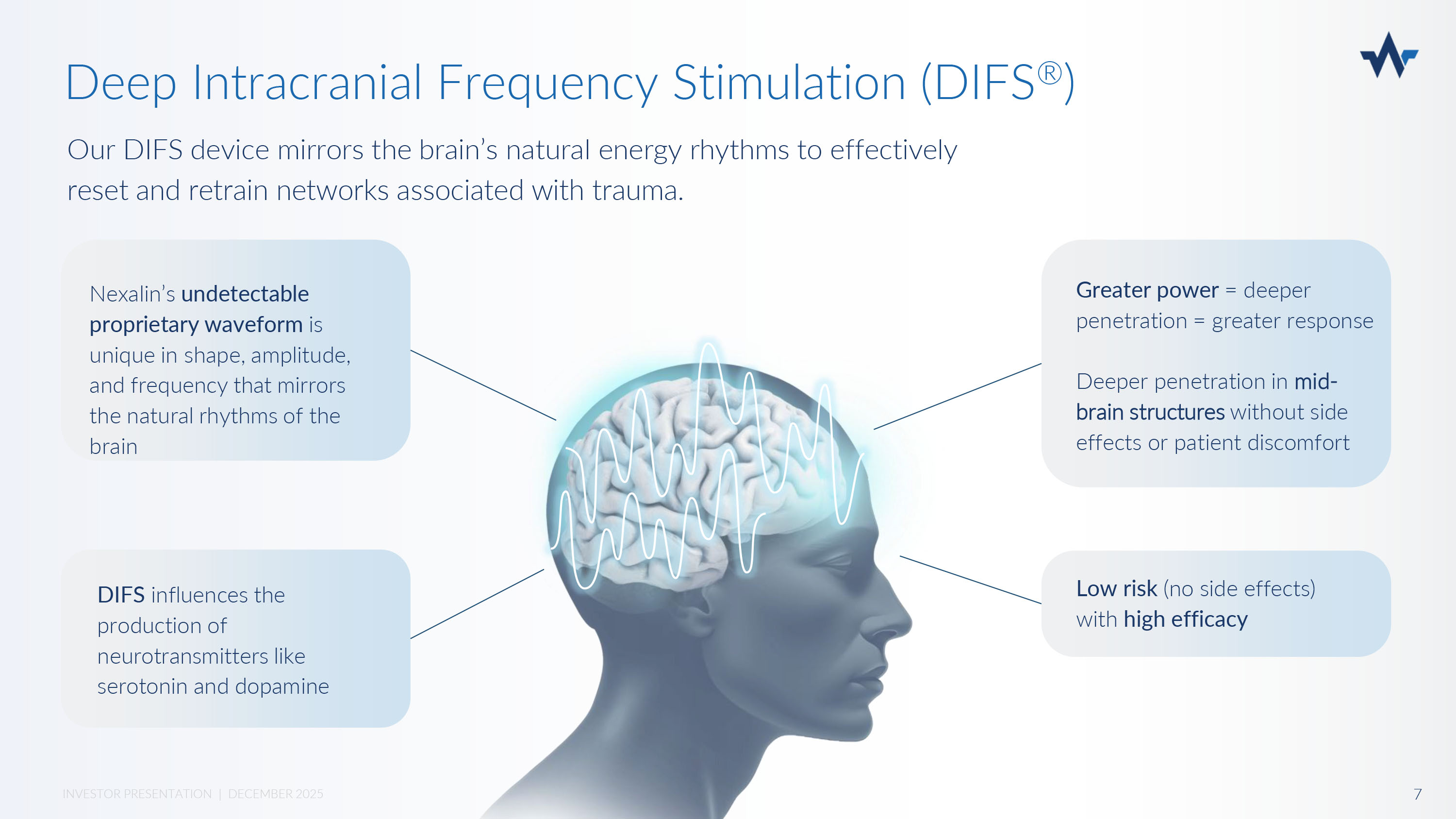 Nexalin is replacing all current neurostimulator technologies with its new Deep Intracranial Frequency Stimulation (DIFS ® ). The Future of Mental Health Treatment is Here x Undetectable to the human body x No patient discomfort or side effects x 15x more powerful than current neurostimulators* x Increased power allows for deeper penetration x Deeper penetration, better response x Treatment response based on clinical evidence *Compared to 1mA 6 INVESTOR PRESENTATION | DECEMBER 2025 Our DIFS device mirrors the brain’s natural energy rhythms to effectively reset and retrain networks associated with trauma.