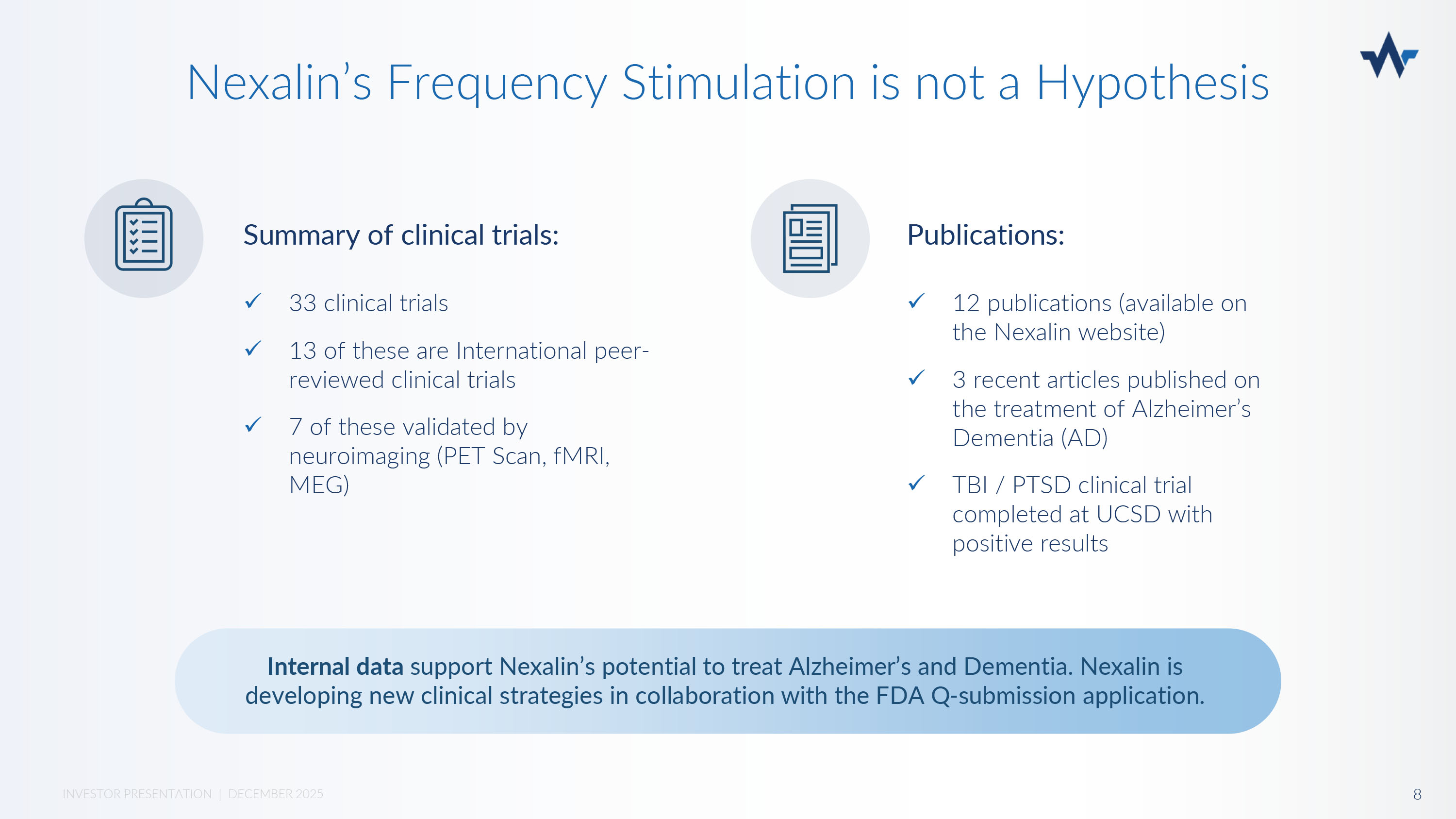 Deep Intracranial Frequency Stimulation (DIFS ® ) DIFS influences the production of neurotransmitters like serotonin and dopamine Nexalin’s undetectable proprietary waveform is unique in shape, amplitude, and frequency that mirrors the natural rhythms of the brain Greater power = deeper penetration = greater response 7 INVESTOR PRESENTATION | DECEMBER 2025 Deeper penetration in mid - brain structures without side effects or patient discomfort Low risk (no side effects) with high efficacy Summary of clinical trials: Nexalin’s Frequency Stimulation is not a Hypothesis x 33 clinical trials x 13 of these are International peer - reviewed clinical trials x 7 of these validated by neuroimaging (PET Scan, fMRI, MEG) Publications: x 12 publications (available on the Nexalin website) x 3 recent articles published on the treatment of Alzheimer’s Dementia (AD) x TBI / PTSD clinical trial completed at UCSD with positive results Internal data support Nexalin’s potential to treat Alzheimer’s and Dementia.