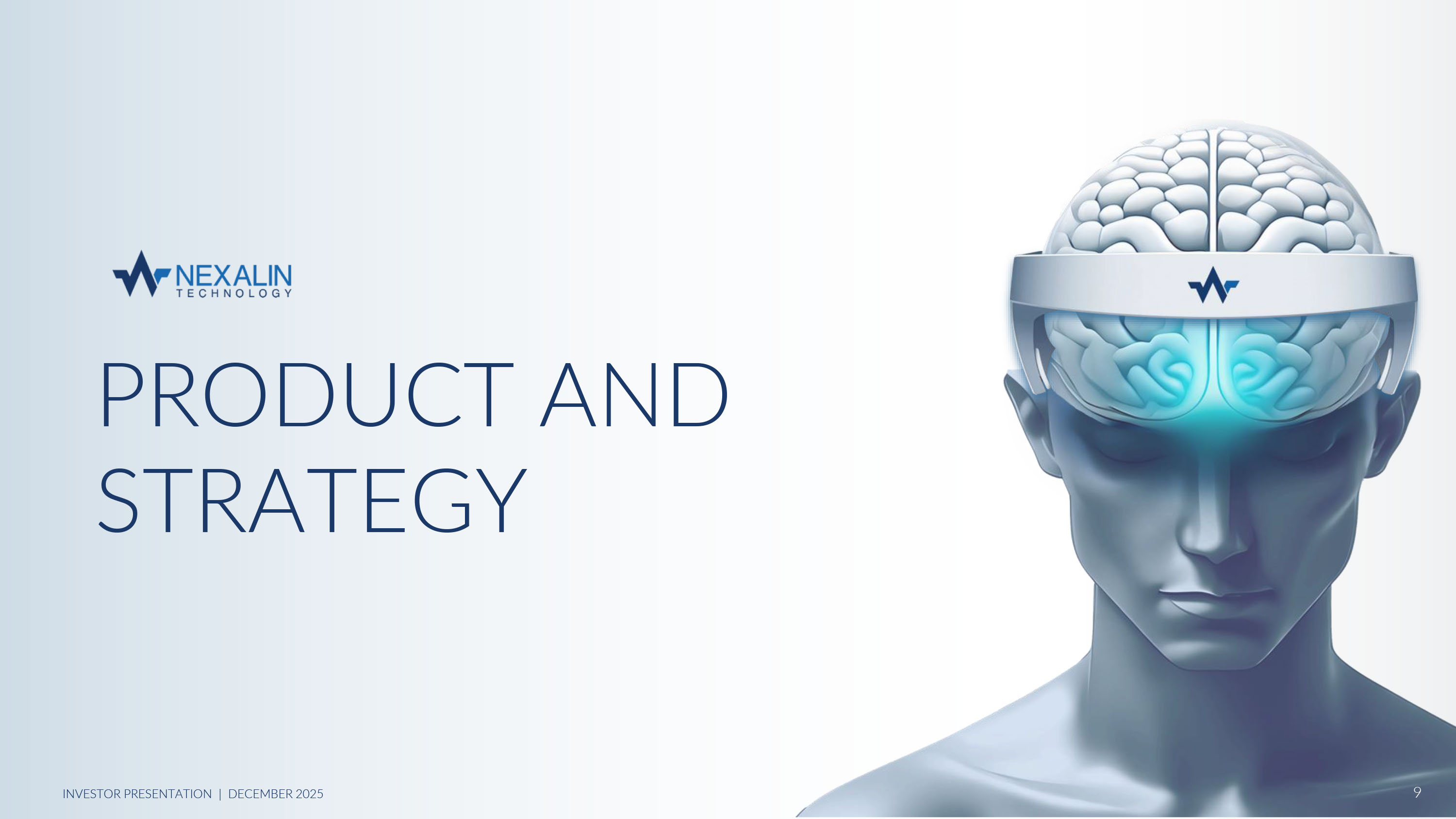 Nexalin is developing new clinical strategies in collaboration with the FDA Q - submission application. 8 INVESTOR PRESENTATION | DECEMBER 2025 PRODUCT AND STRATEGY 9 INVESTOR PRESENTATION | DECEMBER 2025