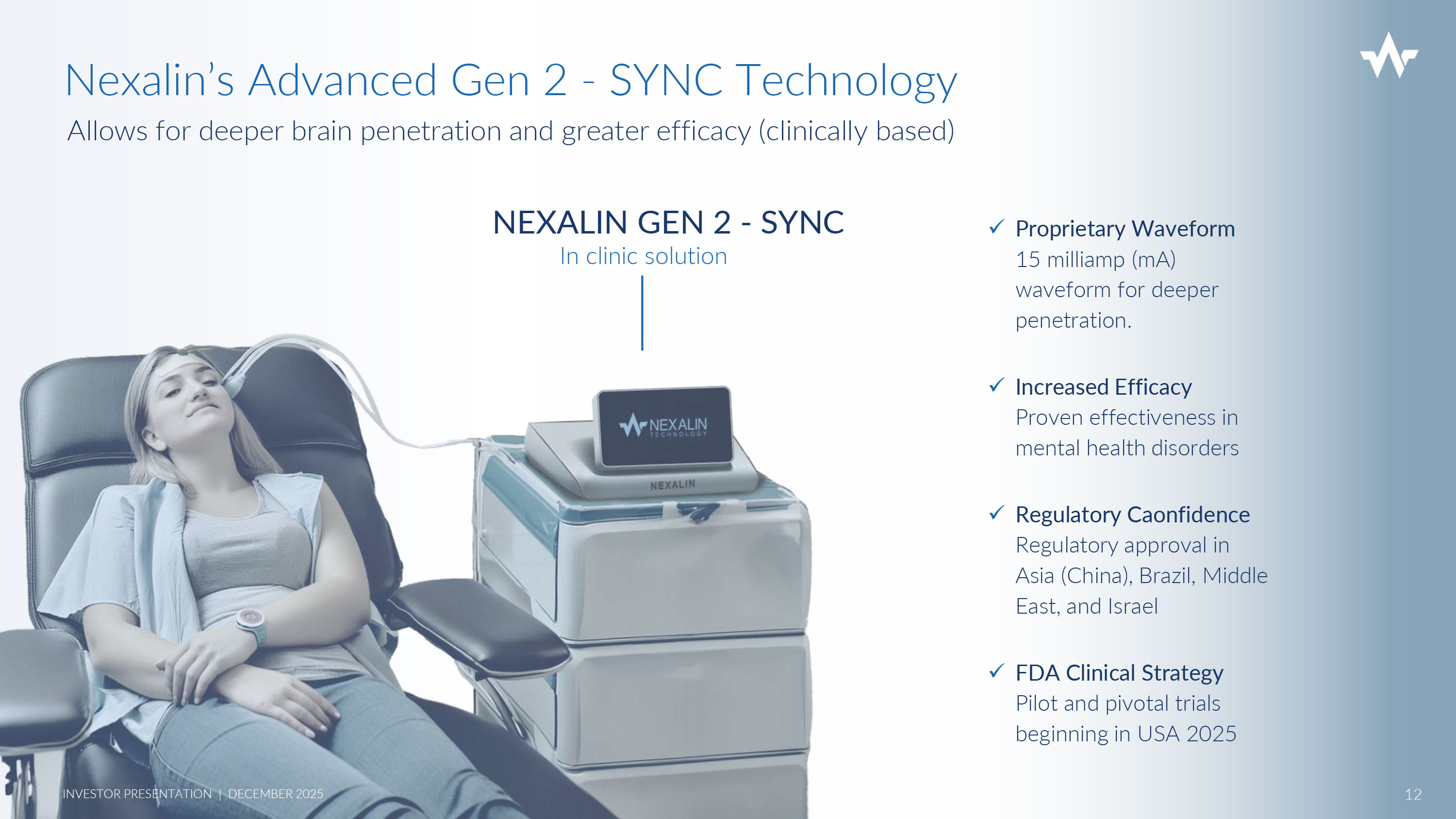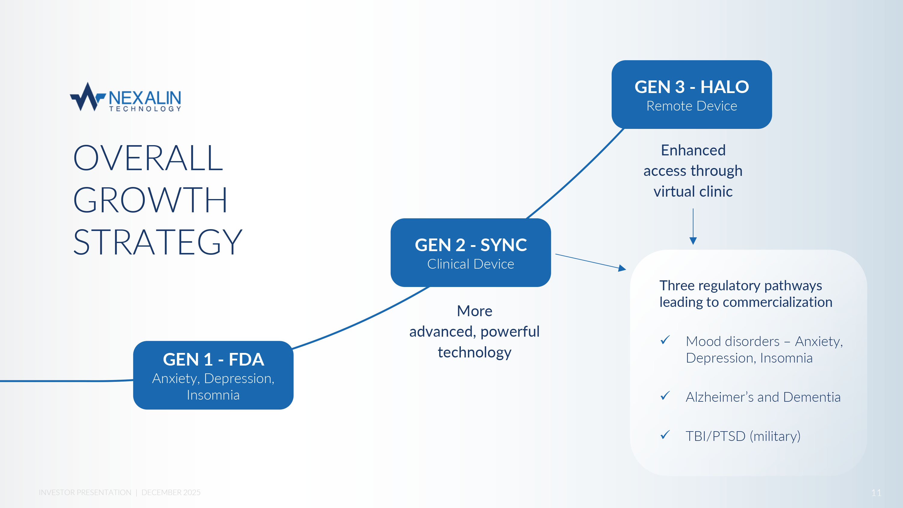 x Waveform Technology 1 - 2 milliamp (mA), 77.5Hz frequency waveform for treatment without any discomfort or side effects x Originally FDA cleared for anxiety, depression, and insomnia x Cost Effective Lower patient and provider costs *Nexalin no longer markets or distributes this Gen - 1 clinical solution NEXALIN GEN 1* In clinic solution From Proven Foundation to Next - Generation Neurostimulation 10 INVESTOR PRESENTATION | DECEMBER 2025 More advanced, powerful technology Enhanced access through virtual clinic GEN 1 - FDA Anxiety, Depression, Insomnia Three regulatory pathways leading to commercialization x Mood disorders – Anxiety, Depression, Insomnia x Alzheimer’s and Dementia x TBI/PTSD (military) OVERALL GROWTH STRATEGY GEN 2 - SYNC Clinical Device GEN 3 - HALO Remote Device 11 INVESTOR PRESENTATION | DECEMBER 2025