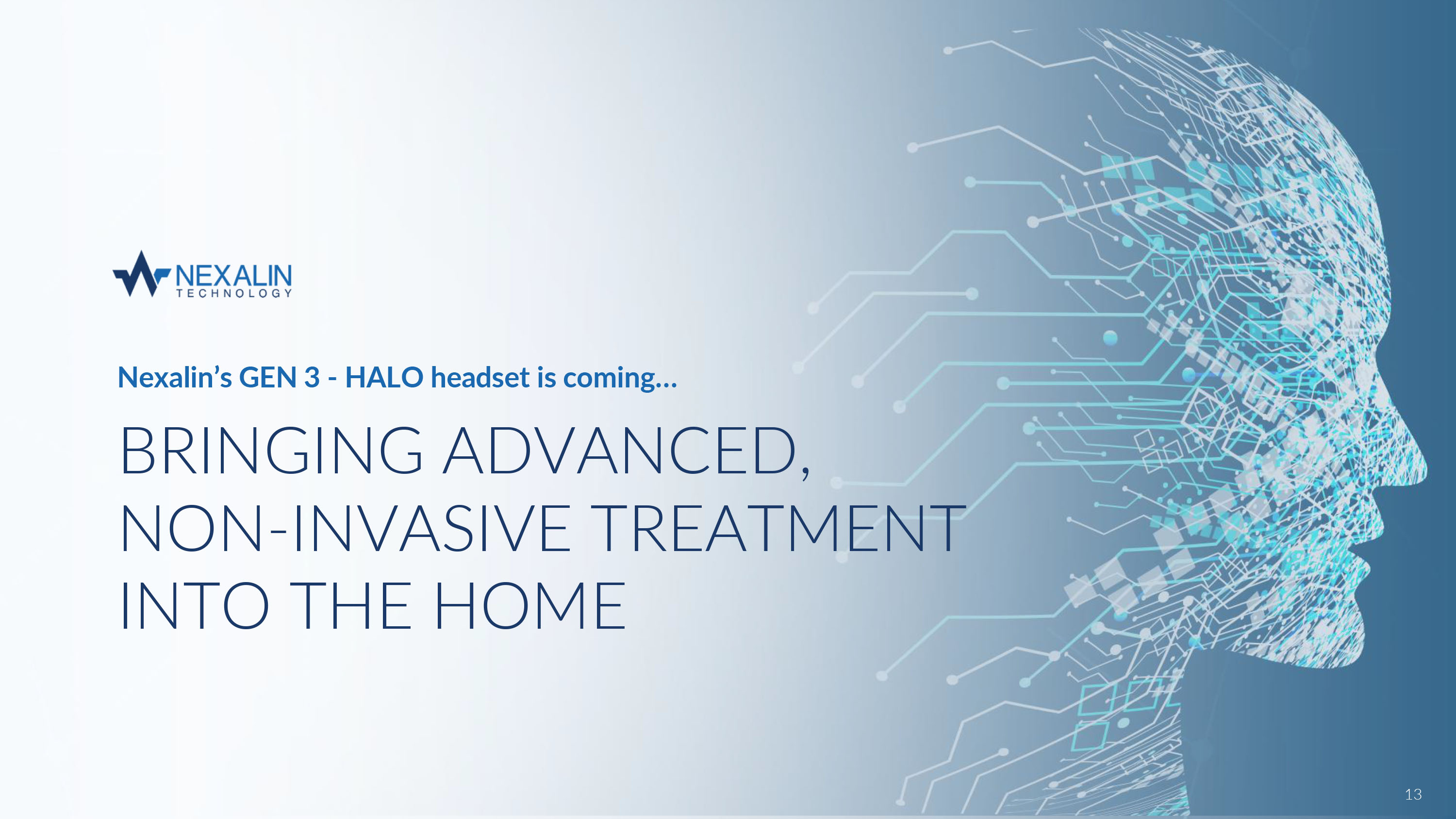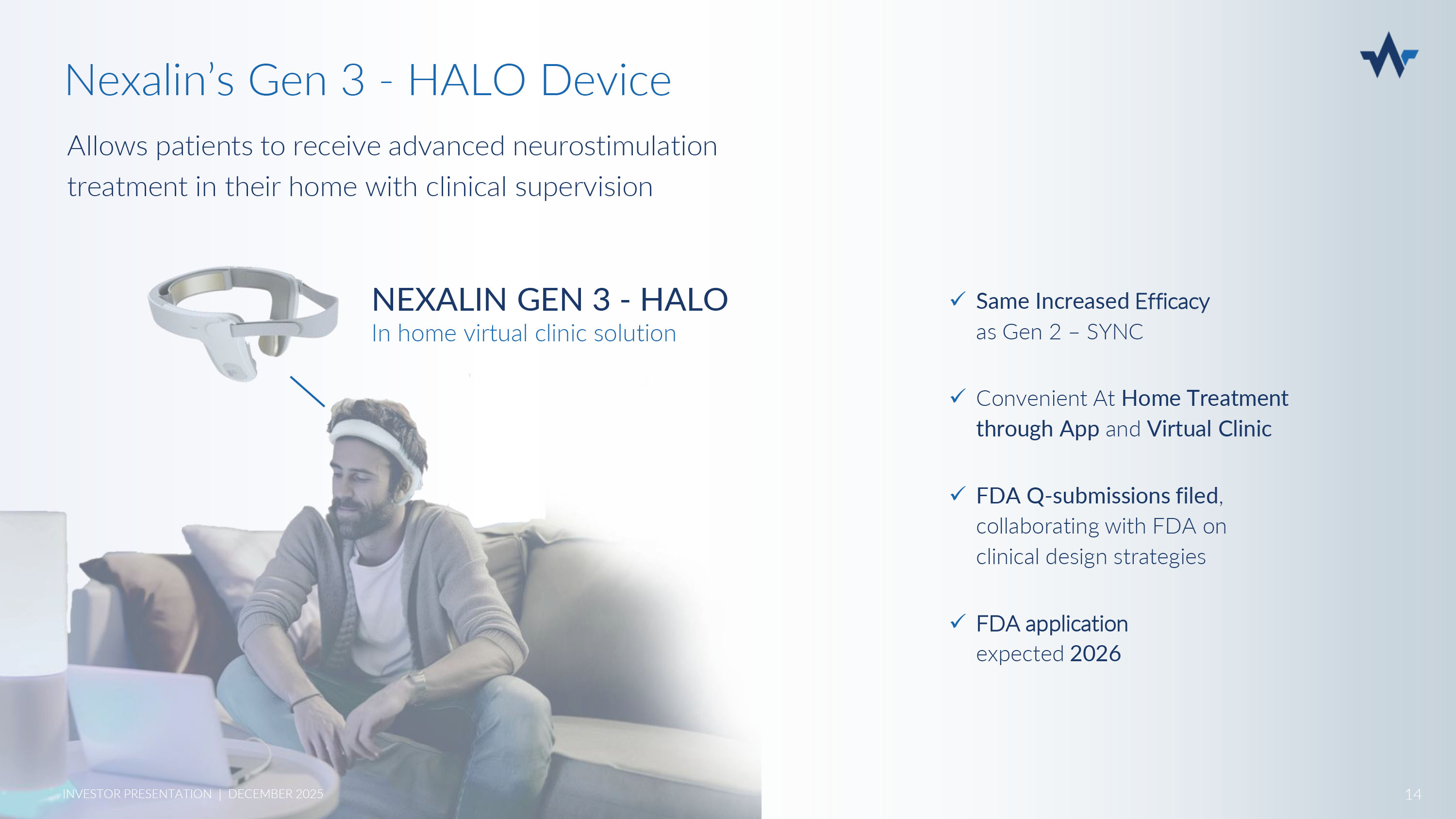 x Proprietary Waveform 15 milliamp (mA) waveform for deeper penetration. x Increased Efficacy Proven effectiveness in mental health disorders x Regulatory Caonfidence Regulatory approval in Asia (China), Brazil, Middle East, and Israel x FDA Clinical Strategy Pilot and pivotal trials beginning in USA 2025 NEXALIN GEN 2 - SYNC In clinic solution Nexalin’s Advanced Gen 2 - SYNC Technology Allows for deeper brain penetration and greater efficacy (clinically based) 12 INVESTOR PRESENTATION | DECEMBER 2025 Nexalin’s GEN 3 - HALO headset is coming… BRINGING ADVANCED, NON - INVASIVE TREATMENT INTO THE HOME 13