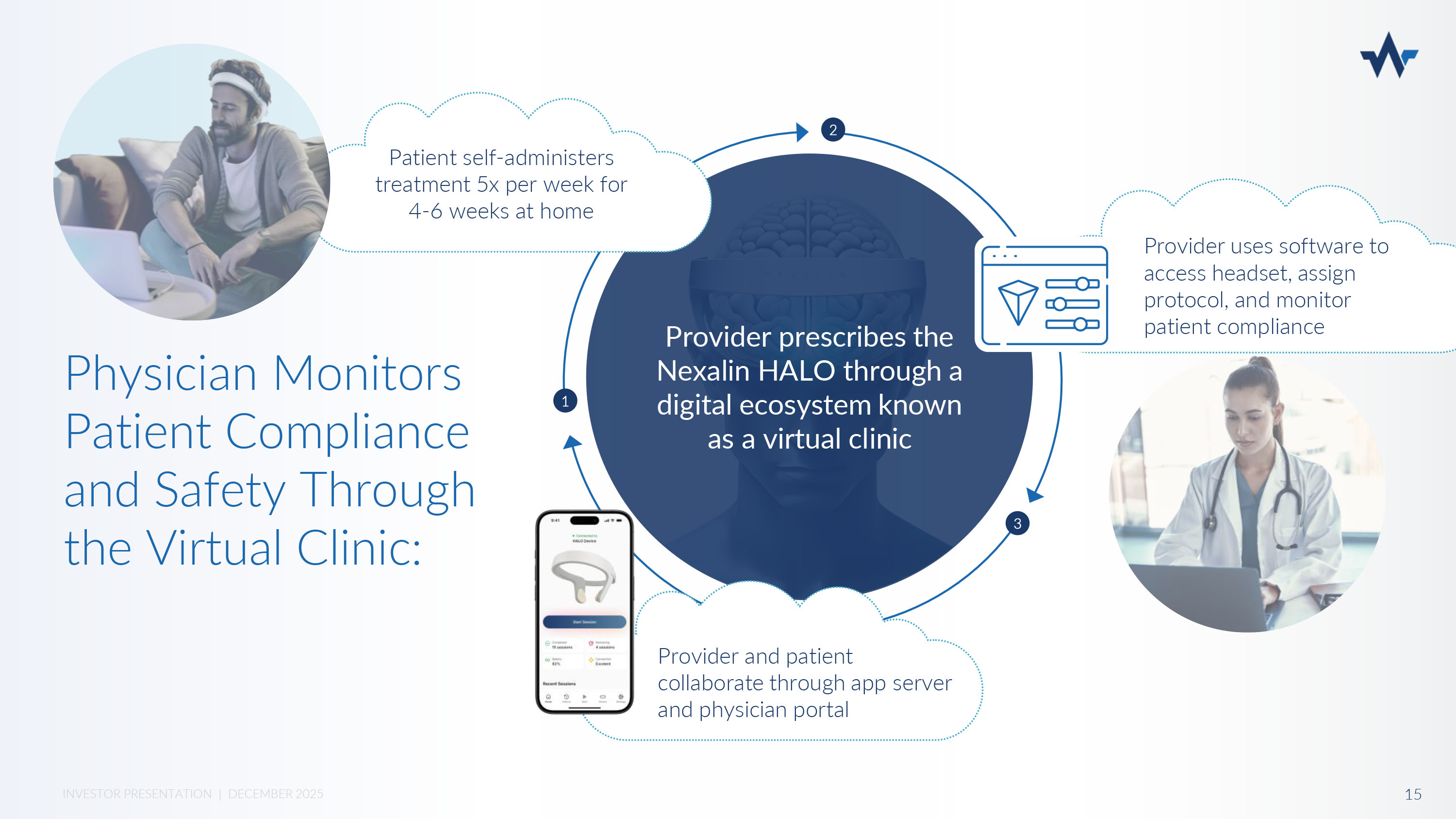 NEXALIN GEN 3 - HALO x Same Increased Efficacy as Gen 2 – SYNC x Convenient At Home Treatment through App and Virtual Clinic x FDA Q - submissions filed, collaborating with FDA on clinical design strategies x FDA application expected 2026 In home virtual clinic solution Allows patients to receive advanced neurostimulation treatment in their home with clinical supervision Nexalin’s Gen 3 - HALO Device 14 INVESTOR PRESENTATION | DECEMBER 2025 Provider prescribes the Nexalin HALO through a digital ecosystem known as a virtual clinic Physician Monitors Patient Compliance and Safety Through the Virtual Clinic : Provider uses software to access headset, assign protocol, and monitor patient compliance 3 1 2 Provider and patient collaborate through app server and physician portal Patient self - administers treatment 5x per week for 4 - 6 weeks at home 15 INVESTOR PRESENTATION | DECEMBER 2025