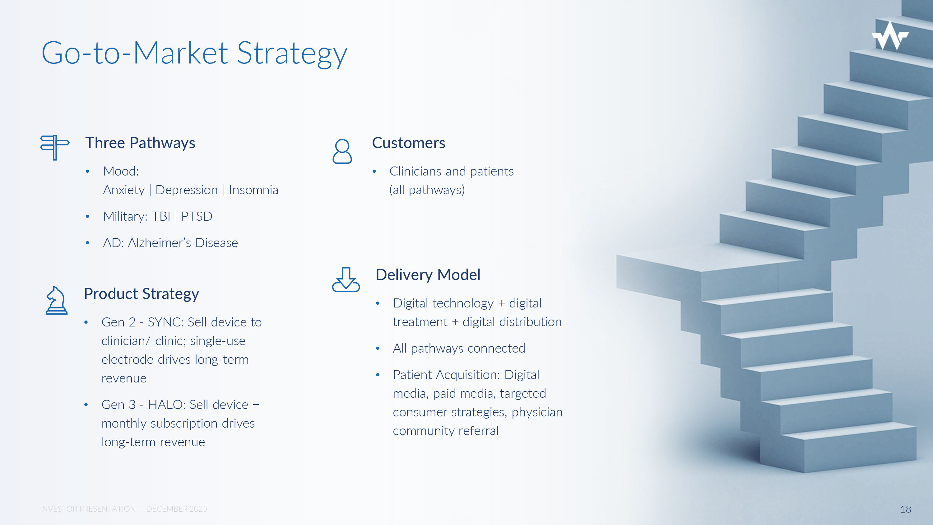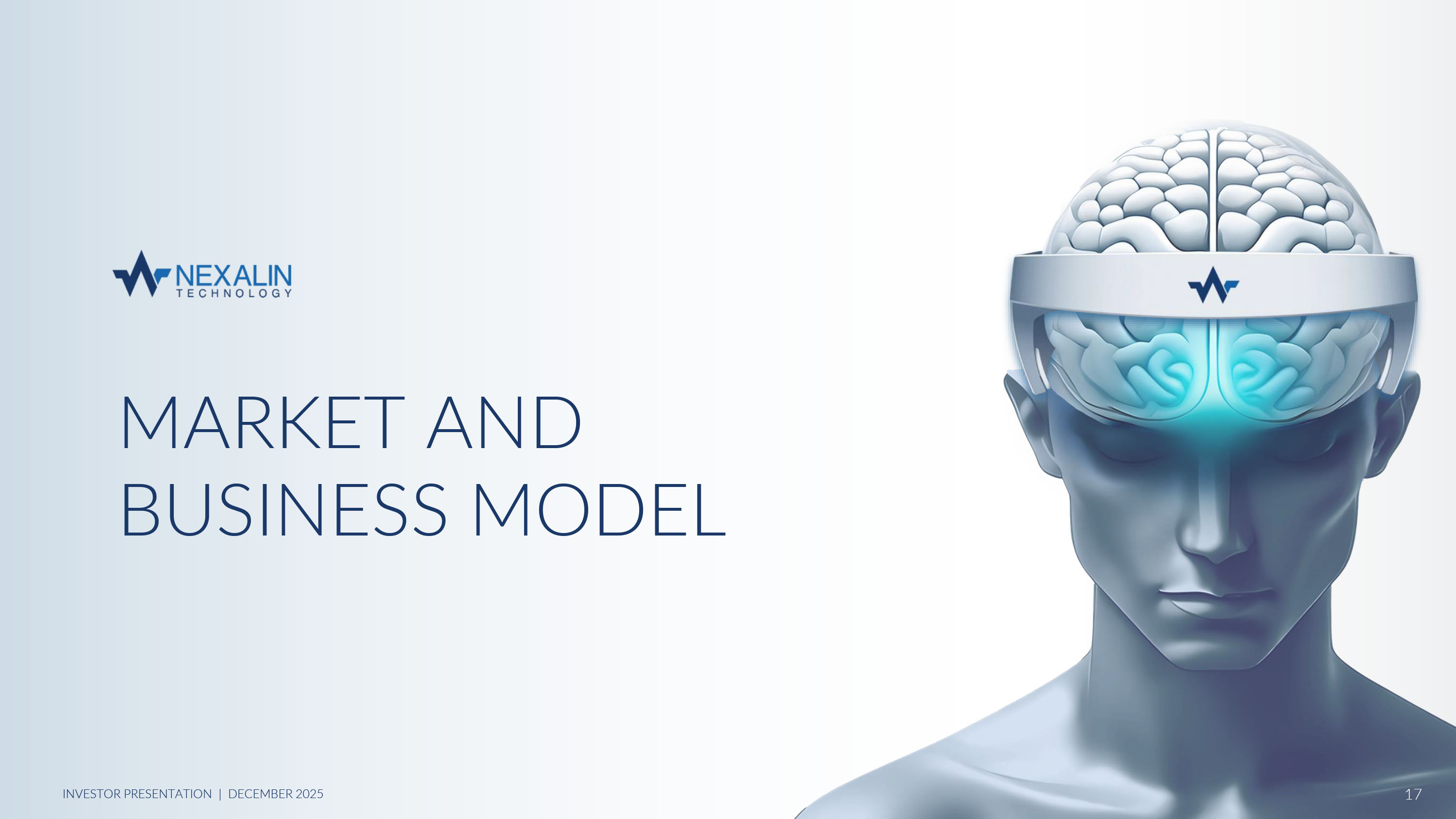 Key: – Commercial Clearance – Developing Business Strategy – Future Strategy Development IN SUMMARY: In Market (JV) China, Brazil, Oman Pilot and Pivotal FDA Clinical Trials in USA Pilot and Pivotal Clinical Trials Internationally FDA De Novo Clinical Trial Strategy USA Nexalin Portfolio Poised For Rapid Commercial Growth 2025 2026 2027 INSOMNIA 16 INVESTOR PRESENTATION | DECEMBER 2025 DEPRESSION ANXIETY Alzheimer’s and DEMENTIA TBI/PTSD (Military) GEN 2 SYNC GEN 3 HALO N/A I N T E R N A T I O N A L U S A I N T E R N A T I O N A L U S A MARKET AND BUSINESS MODEL 17 INVESTOR PRESENTATION | DECEMBER 2025