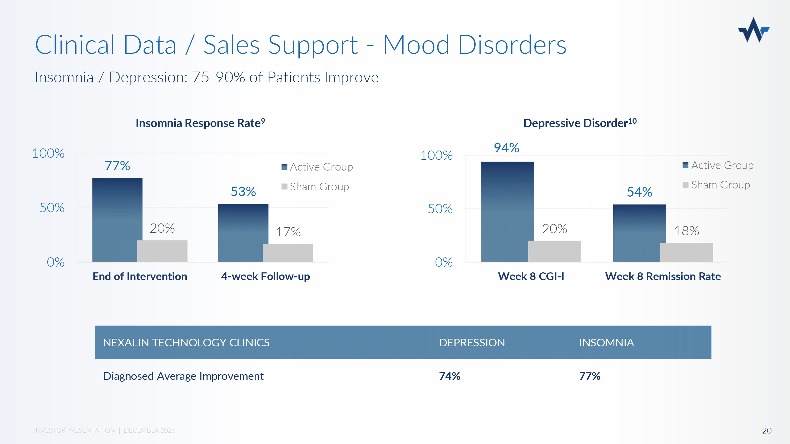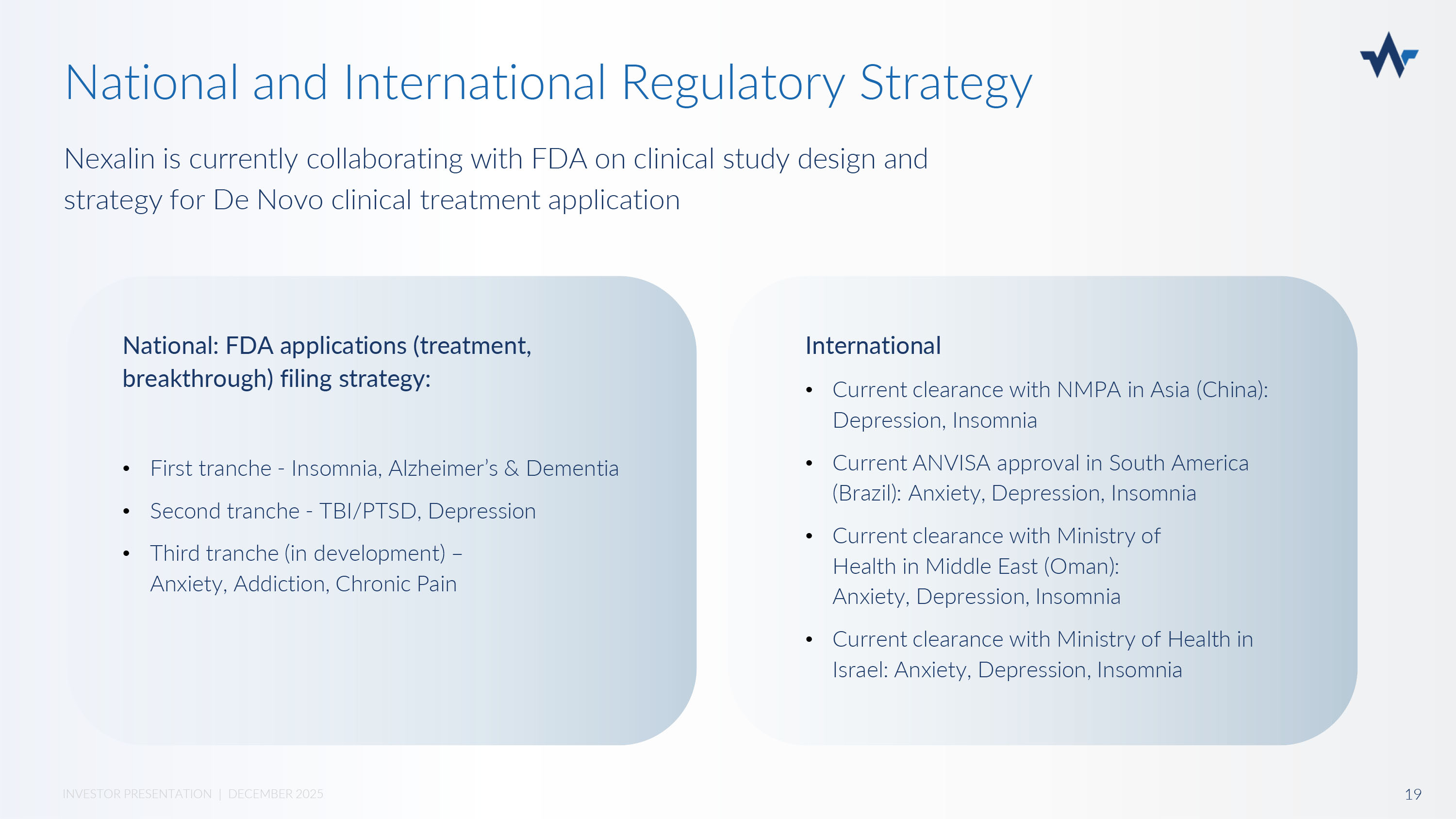 Go - to - Market Strategy Three Pathways • Mood: Anxiety | Depression | Insomnia • Military: TBI | PTSD • AD: Alzheimer’s Disease Customers • Clinicians and patients (all pathways) Delivery Model • Digital technology + digital treatment + digital distribution • All pathways connected • Patient Acquisition: Digital media, paid media, targeted consumer strategies, physician community referral Product Strategy • Gen 2 - SYNC: Sell device to clinician/ clinic; single - use electrode drives long - term revenue • Gen 3 - HALO: Sell device + monthly subscription drives long - term revenue 18 INVESTOR PRESENTATION | DECEMBER 2025 Nexalin is currently collaborating with FDA on clinical study design and strategy for De Novo clinical treatment application National and International Regulatory Strategy National: FDA applications (treatment, breakthrough) filing strategy: • First tranche - Insomnia, Alzheimer’s & Dementia • Second tranche - TBI/PTSD, Depression • Third tranche (in development) – Anxiety, Addiction, Chronic Pain International • Current clearance with NMPA in Asia (China): Depression, Insomnia • Current ANVISA approval in South America (Brazil): Anxiety, Depression, Insomnia • Current clearance with Ministry of Health in Middle East (Oman): Anxiety, Depression, Insomnia • Current clearance with Ministry of Health in Israel: Anxiety, Depression, Insomnia 19 INVESTOR PRESENTATION | DECEMBER 2025