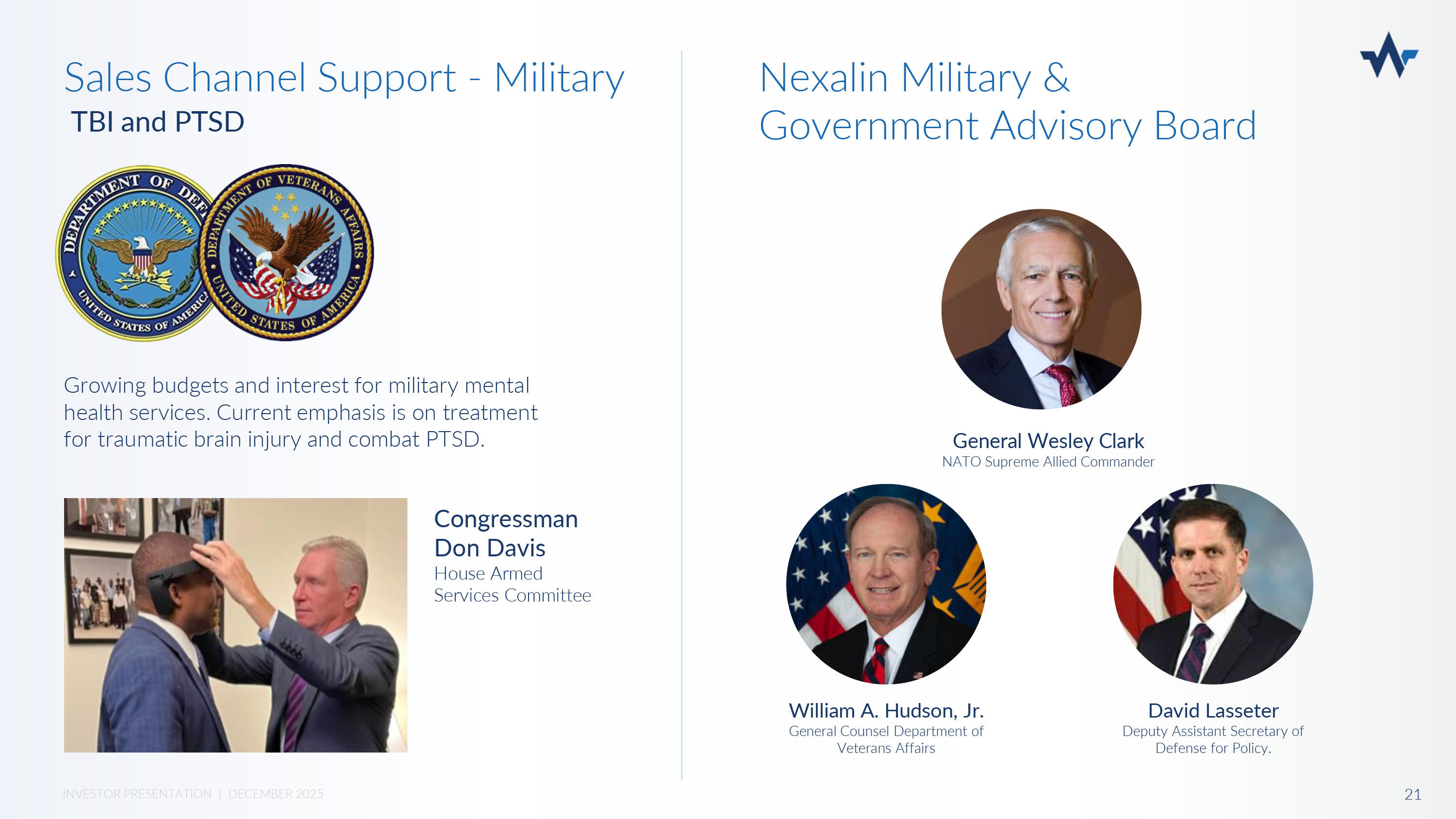 77% 53% 20% 17% 0% 50% 100% End of Intervention 4 - week Follow - up Active Group Sham Group 94% 54% 20% 18% 0% 50% 100% Week 8 CGI - I Week 8 Remission Rate Active Group Sham Group Insomnia Response Rate 9 Depressive Disorder 10 INSOMNIA DEPRESSION NEXALIN TECHNOLOGY CLINICS 77% 74% Diagnosed Average Improvement Insomnia / Depression: 75 - 90% of Patients Improve 20 INVESTOR PRESENTATION | DECEMBER 2025 Clinical Data / Sales Support - Mood Disorders David Lasseter Deputy Assistant Secretary of Defense for Policy.