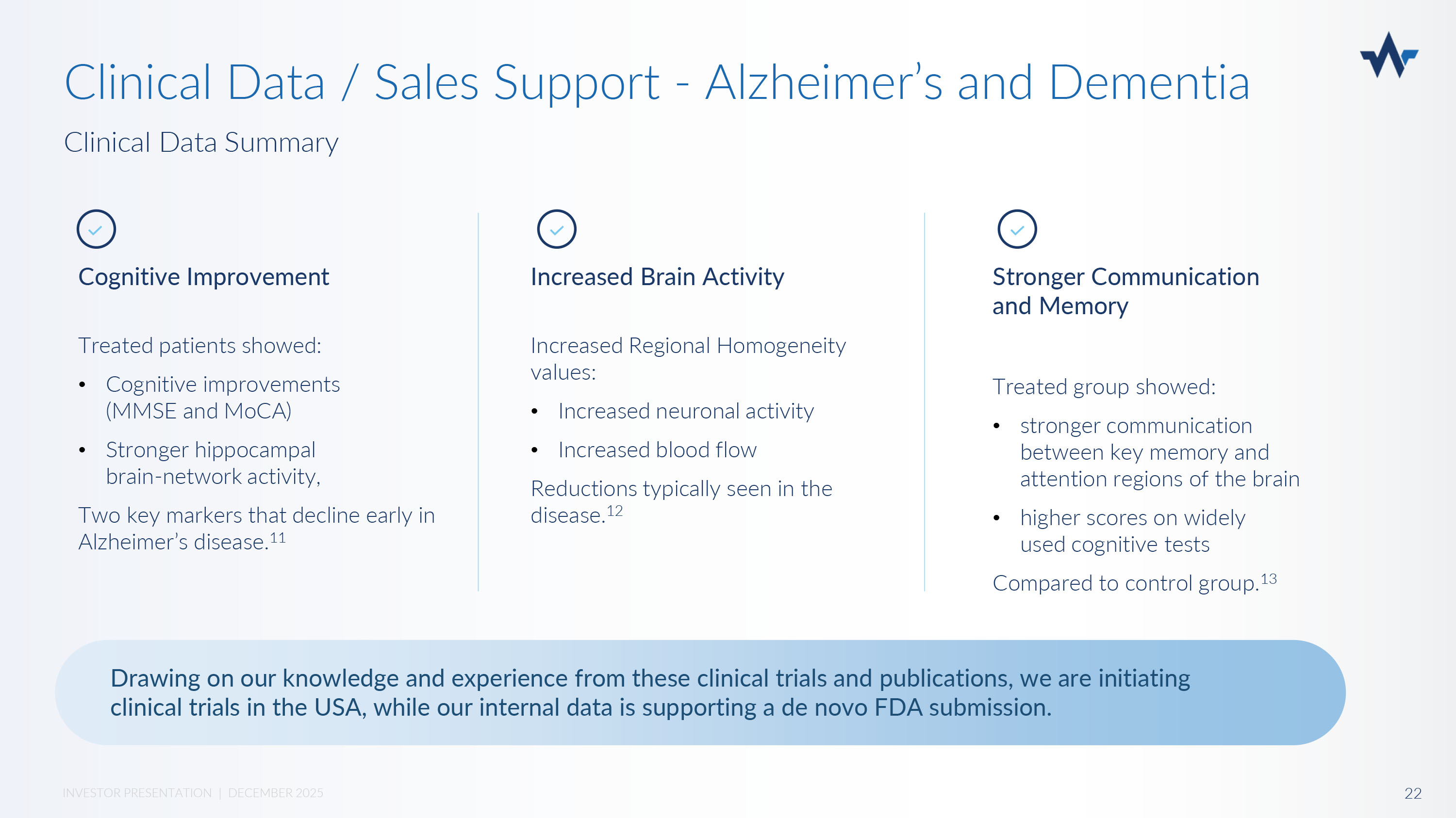 Growing budgets and interest for military mental health services. Current emphasis is on treatment for traumatic brain injury and combat PTSD. William A. Hudson, Jr. General Counsel Department of Veterans Affairs 21 INVESTOR PRESENTATION | DECEMBER 2025 General Wesley Clark NATO Supreme Allied Commander Sales Channel Support - Military TBI and PTSD Congressman Don Davis House Armed Services Committee Nexalin Military & Government Advisory Board Clinical Data Summary Clinical Data / Sales Support - Alzheimer’s and Dementia Cognitive Improvement Treated patients showed: • Cognitive improvements (MMSE and MoCA) • Stronger hippocampal brain - network activity, Two key markers that decline early in Alzheimer’s disease.