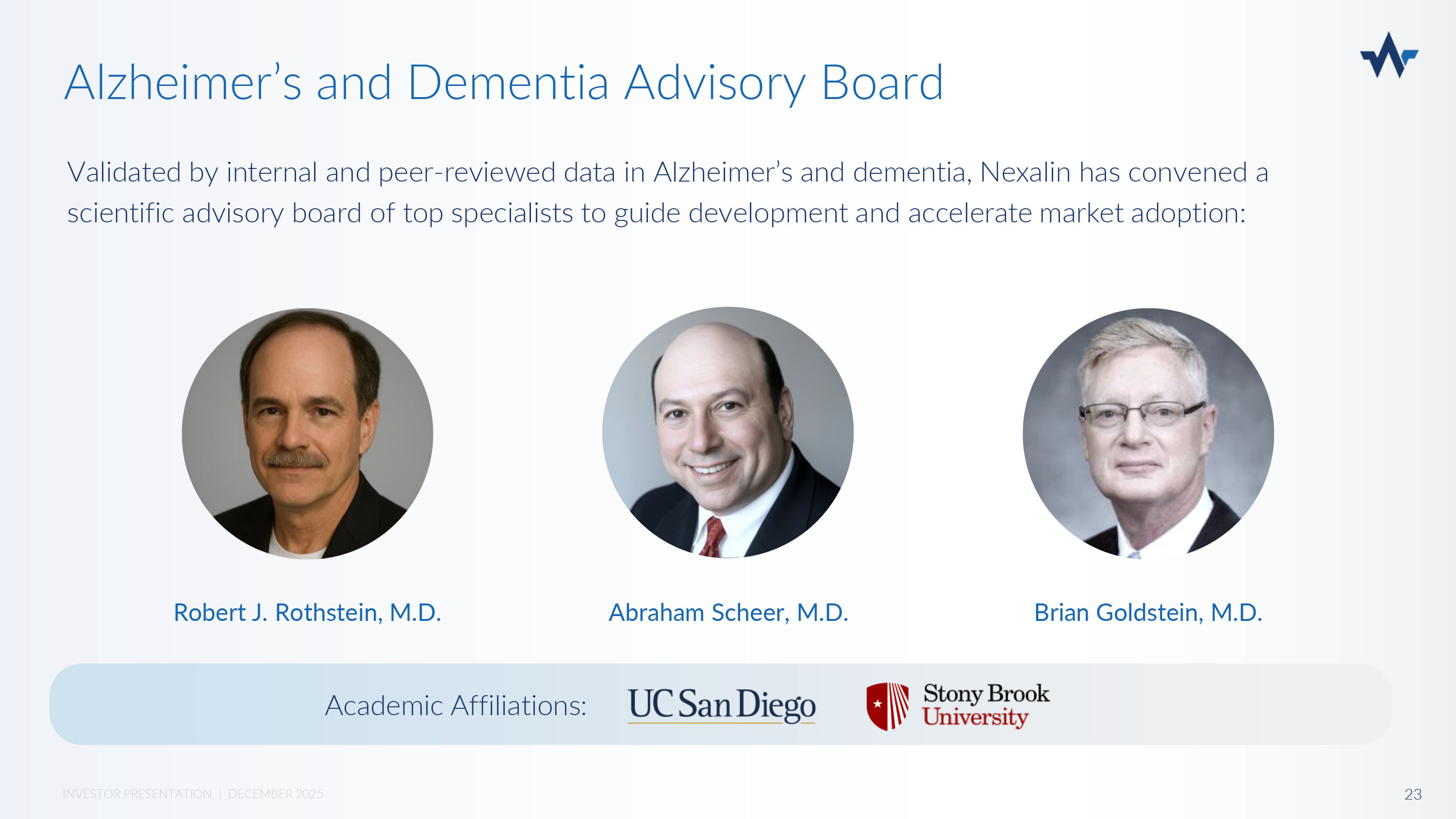 22 INVESTOR PRESENTATION | DECEMBER 2025 Validated by internal and peer - reviewed data in Alzheimer’s and dementia, Nexalin has convened a scientific advisory board of top specialists to guide development and accelerate market adoption: Alzheimer’s and Dementia Advisory Board Robert J. Rothstein, M.D. Abraham Scheer, M.D. Academic Affiliations: Brian Goldstein, M.D. 23 INVESTOR PRESENTATION | DECEMBER 2025 Global Market $ 1B Global Growth Strategy USA 24 INVESTOR PRESENTATION | DECEMBER 2025 South America Middle East China Israel
