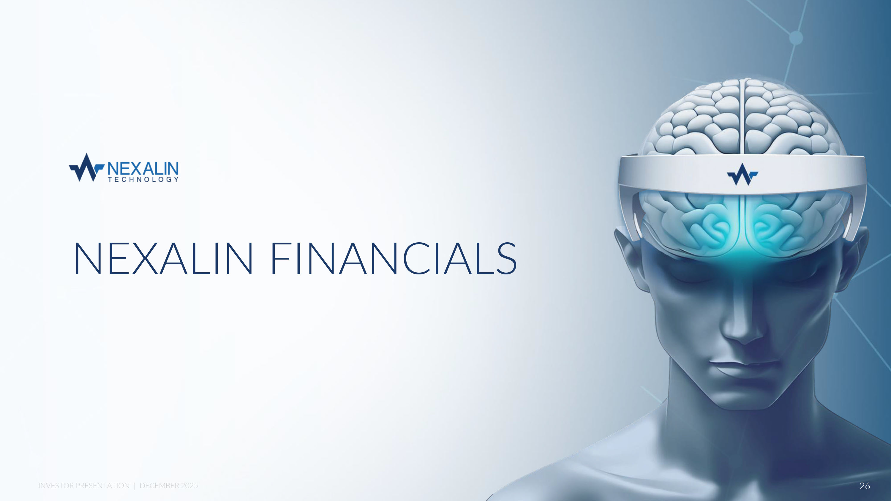 General Electro - Stimulation TACs Alzheimer’s and Dementia Anxiety, Depression, Insomnia (ADI) General TACs Multi - Channel Electro - Stimulation USA International PENDING ISSUED x 7 Patents Issued , US – through 2036 x 21 patents Pending across 14+ countries and regions x Design registrations and trademarks pending INTELLECTUAL PROPERTY Nexalin is developing a global intellectual property portfolio 25 INVESTOR PRESENTATION | DECEMBER 2025 NEXALIN FINANCIALS 26 INVESTOR PRESENTATION | DECEMBER 2025
