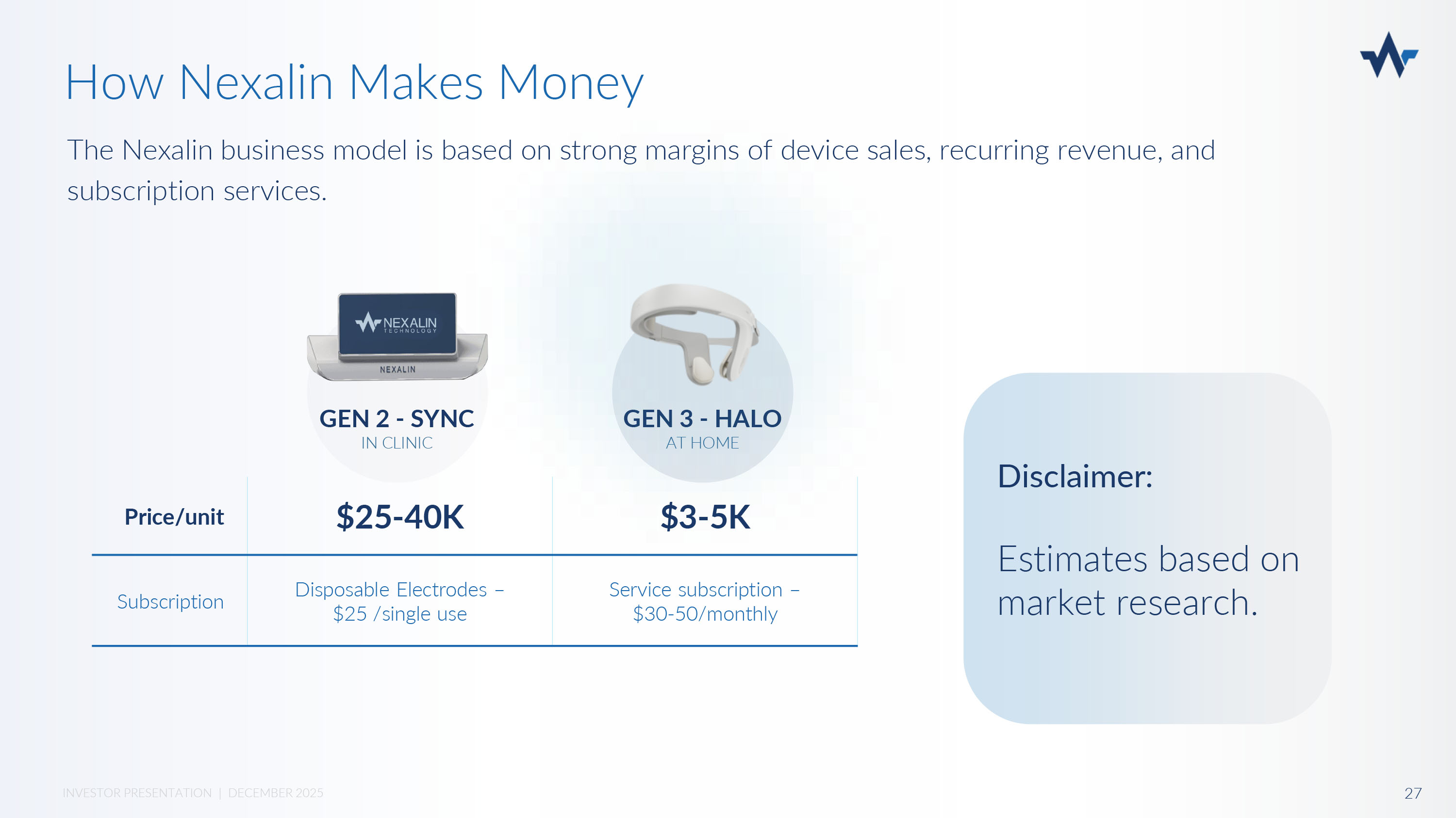 GEN 2 - SYNC IN CLINIC GEN 3 - HALO AT HOME $3 - 5K $25 - 40K Price/unit Service subscription – $30 - 50/monthly Disposable Electrodes – $25 /single use Subscription The Nexalin business model is based on strong margins of device sales, recurring revenue, and subscription services. How Nexalin Makes Money Disclaimer: Estimates based on market research.