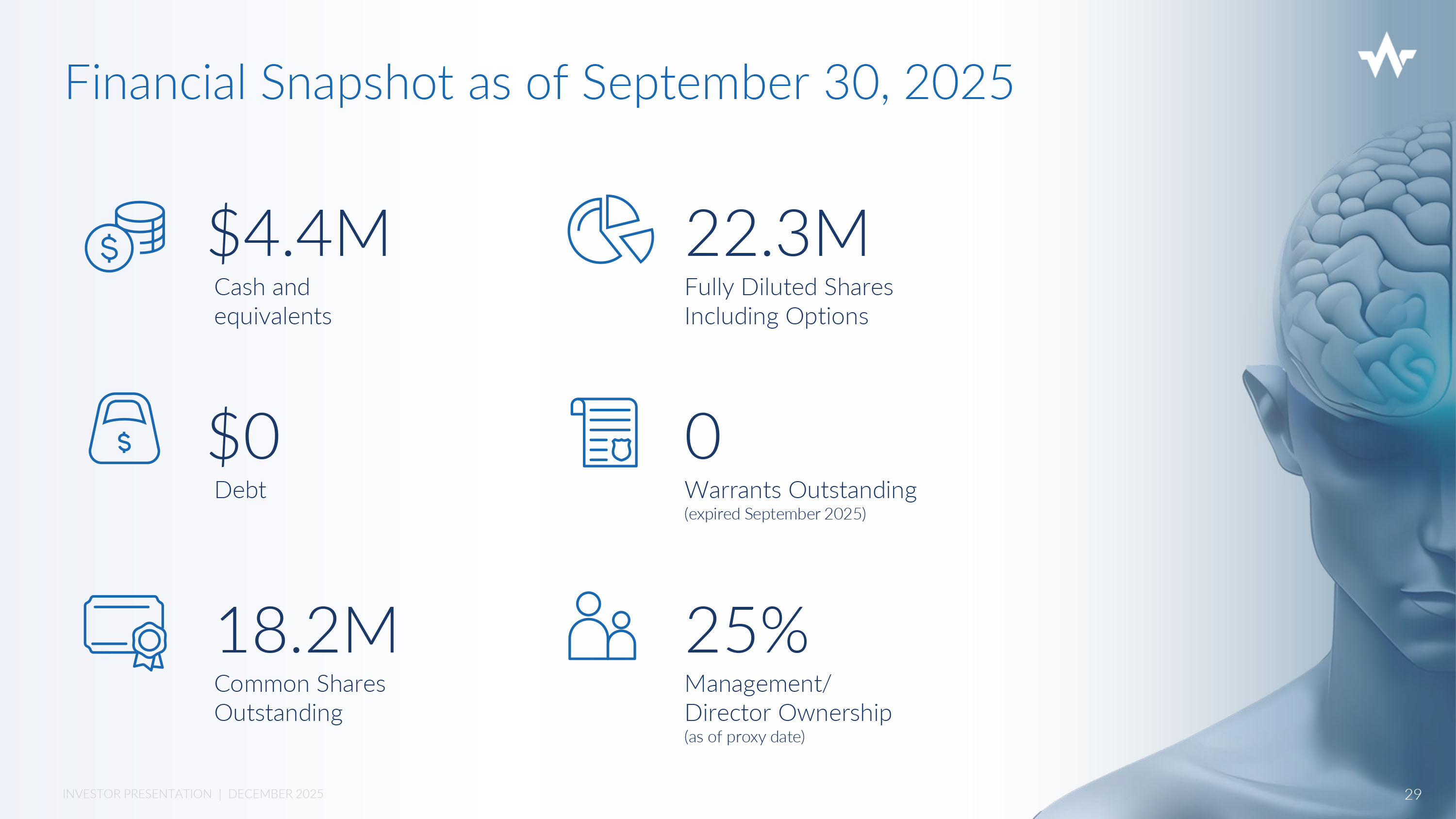 27 INVESTOR PRESENTATION | DECEMBER 2025 Nexalin Investment Summary Near - Term Gen 2 - SYNC revenue from initial Global and China JV Proprietary, effective & safe non - invasive treatment option in growing mental health market US Trials on Gen 2 – SYNC and Gen 3 – HALO expanding indications across mental health spectrum De Novo classification expected with FDA Military research and support for TBI and PTSD New Innovative Gen 3 - HALO In - Home Virtual Clinic: strongest in market 28 INVESTOR PRESENTATION | DECEMBER 2025 Financial Snapshot as of September 30, 2025 Cash and equivalents $4.4M $0 Debt 18.2M Common Shares Outstanding 22.3M Fully Diluted Shares Including Options 0 Warrants Outstanding (expired September 2025) 25% Management/ Director Ownership (as of proxy date) 29 INVESTOR PRESENTATION | DECEMBER 2025