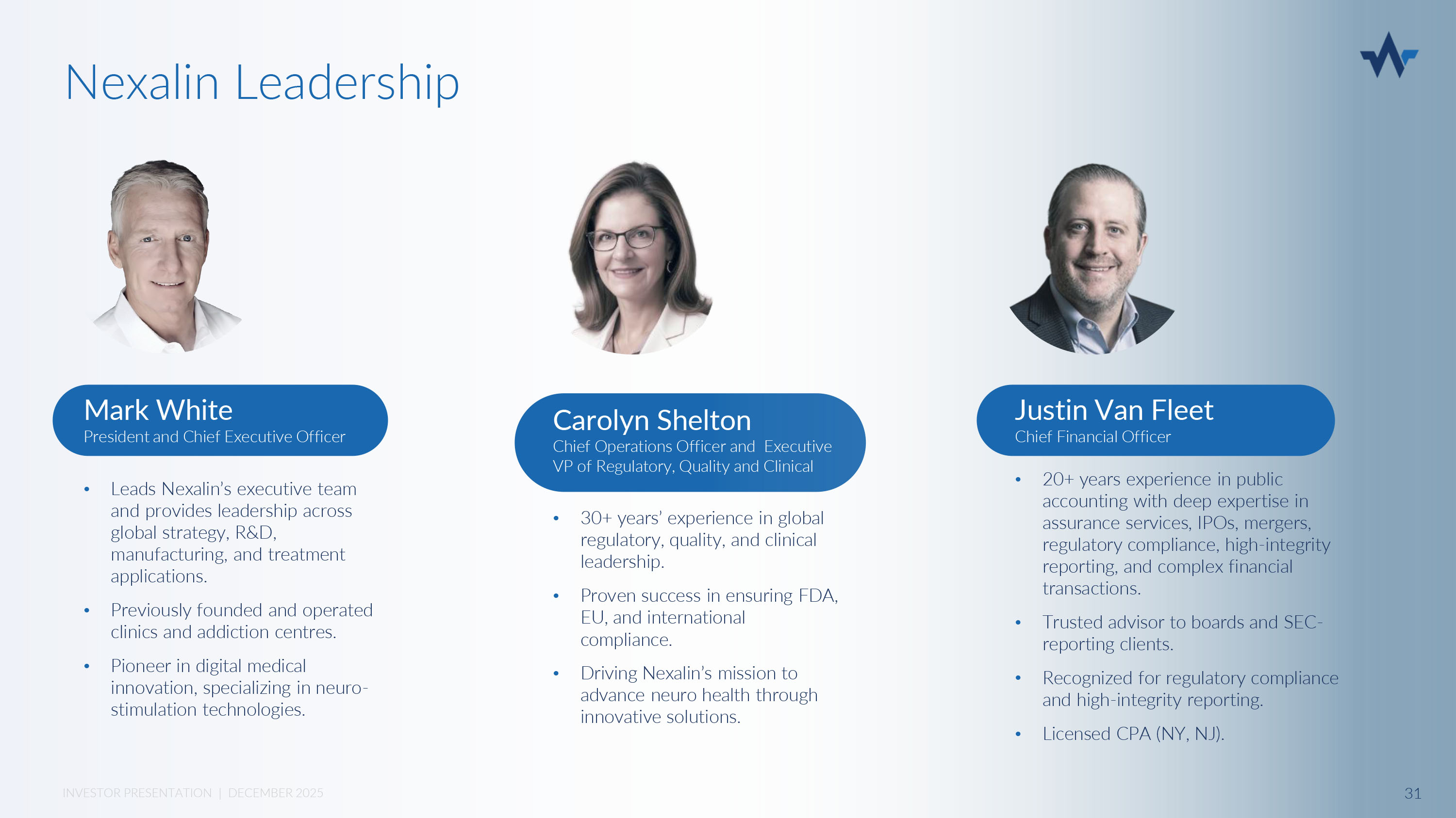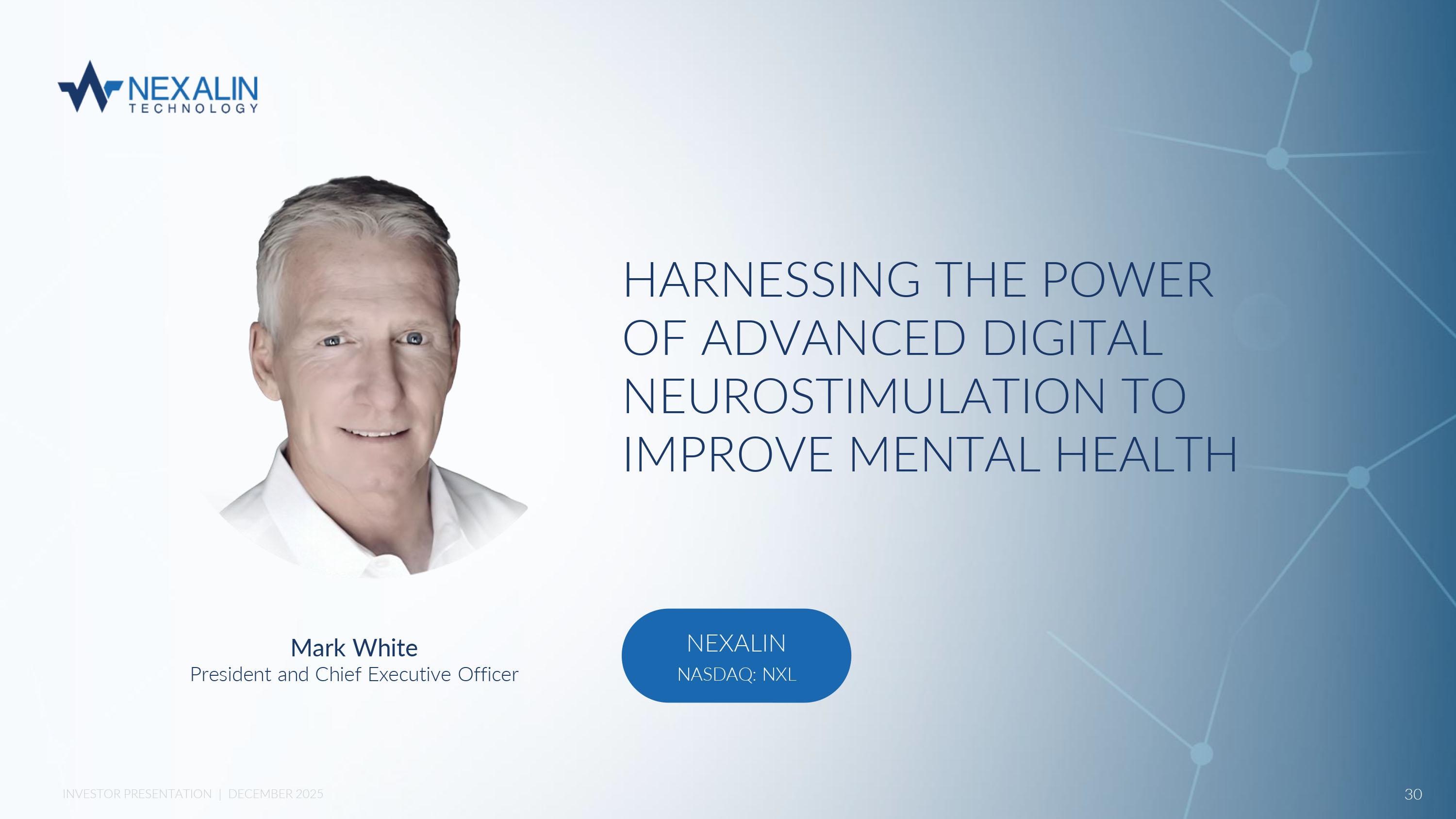 HARNESSING THE POWER OF ADVANCED DIGITAL NEUROSTIMULATION TO IMPROVE MENTAL HEALTH NEXALIN NASDAQ: NXL Mark White President and Chief Executive Officer 30 INVESTOR PRESENTATION | DECEMBER 2025 Mark White President and Chief Executive Officer • Leads Nexalin’s executive team and provides leadership across global strategy, R&D, manufacturing, and treatment applications.