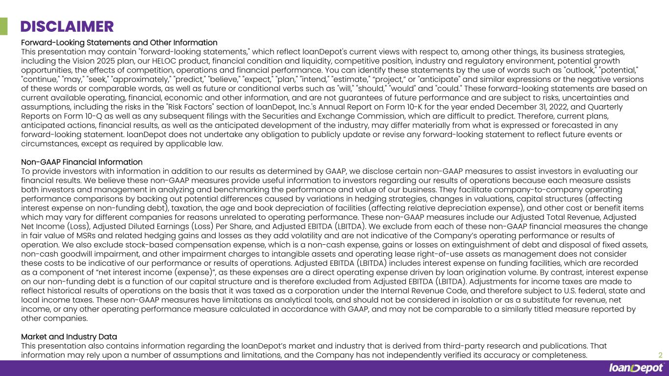 This press release may contain "forward-looking statements," which reflect loanDepot's current views with respect to, among other things, its business strategies, including the Vision 2025 plan, our HELOC product, financial condition and liquidity, competitive position, industry and regulatory environment, potential growth opportunities, the effects of competition, operations and financial performance. You can identify these statements by the use of words such as "outlook," "potential," "continue," "may," "seek," "approximately," "predict," "believe," "expect," "plan," "intend," "estimate," “project,” or "anticipate" and similar expressions or the negative versions of these words or comparable words, as well as future or conditional verbs such as "will," "should," "would" and "could." These forward-looking statements are based on current available operating, financial, economic and other information, and are not guarantees of future performance and are subject to risks, uncertainties and assumptions, including the risks in the "Risk Factors" section of loanDepot, Inc.'s Annual Report on Form 10-K for the year ended December 31, 2022 and Quarterly Reports on Form 10-Q as well as any subsequent filings with the Securities and Exchange Commission, which are difficult to predict. Therefore, current plans, anticipated actions, financial results, as well as the anticipated development of the industry, may differ materially from what is expressed or forecasted in any forward-looking statement. loanDepot does not undertake any obligation to publicly update or revise any forward-looking statement to reflect future events or circumstances, except as required by applicable law.