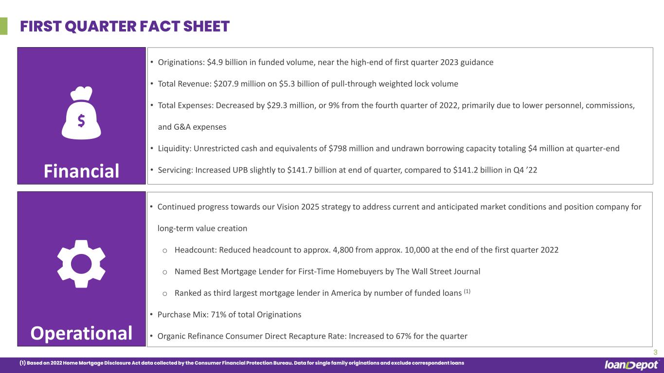 “The first quarter of this year remained challenging for the housing market as virtually all participants grappled with the impacts of ongoing volatility in mortgage interest rates, persistent cost inflation and the lack of available homes for sale,” said President and Chief Executive Officer Frank Martell. “Against this backdrop loanDepot continued to execute against our Vision 2025 plan, narrowing our loss from the fourth quarter of 2022 on higher revenues and lower expenses.