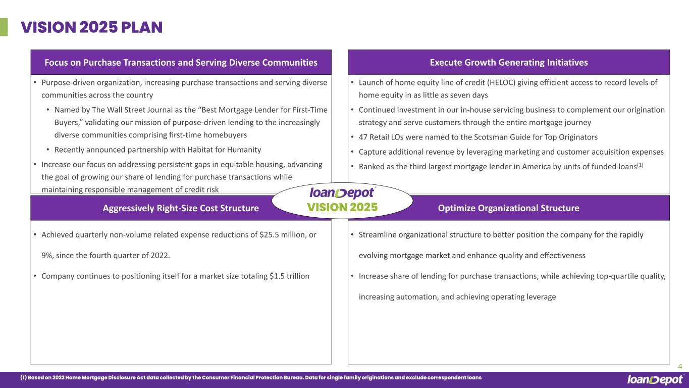 Our Vision 2025 plan is designed to address current and anticipated mortgage market conditions and position loanDepot for sustainable long-term value creation. We have achieved the following during the first quarter as it related to Vision 2025: