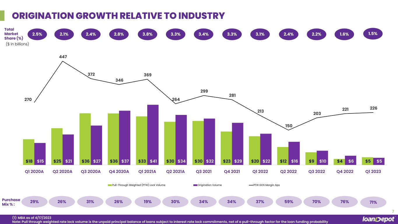 •Purchase volume decreased to 71% of total loans during the first quarter, down from 76% of total loans during the fourth quarter of 2022 and up from 37% of total loans during the first quarter of 2022.